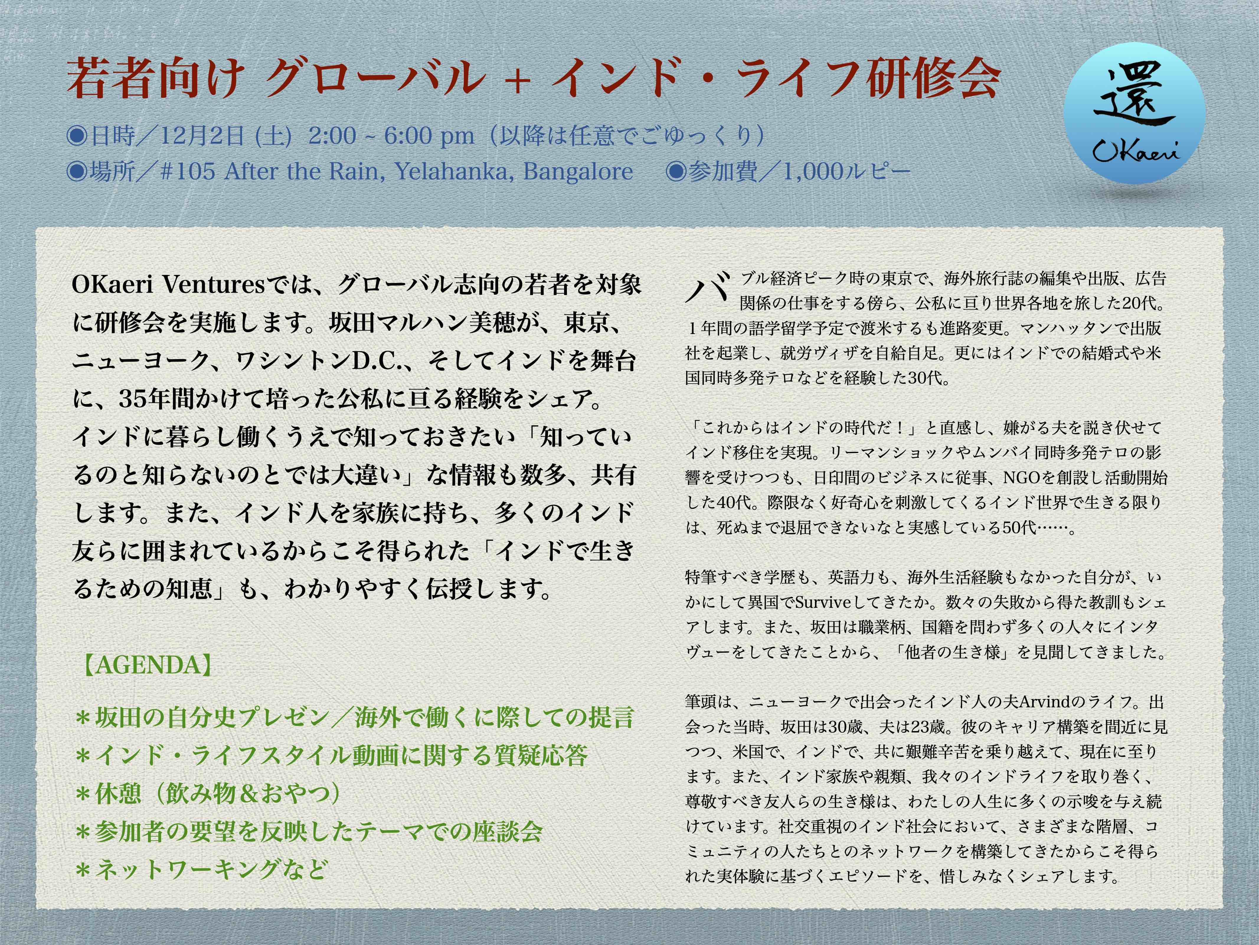 å é±ã®åææ¥ã¯ãçæšºããã®ãªã¯ãšã¹ããåããŠãOKaeri Venturesäž»å¬ãè¥è åã ã°ããŒãã« + ã€ã³ãã»ã©ã€ãç ä¿®äŒãã宿œããããã»ãããŒããšåŒã¶ã«ã¯ããŸãã«ãæ¿ããæéãé·ããªãã®ã§ãåå è ã«ã¯ãã£ã€ããšå¿æ§ããããŠæãã§ãããã¹ããç ä¿®äŒã§ããã