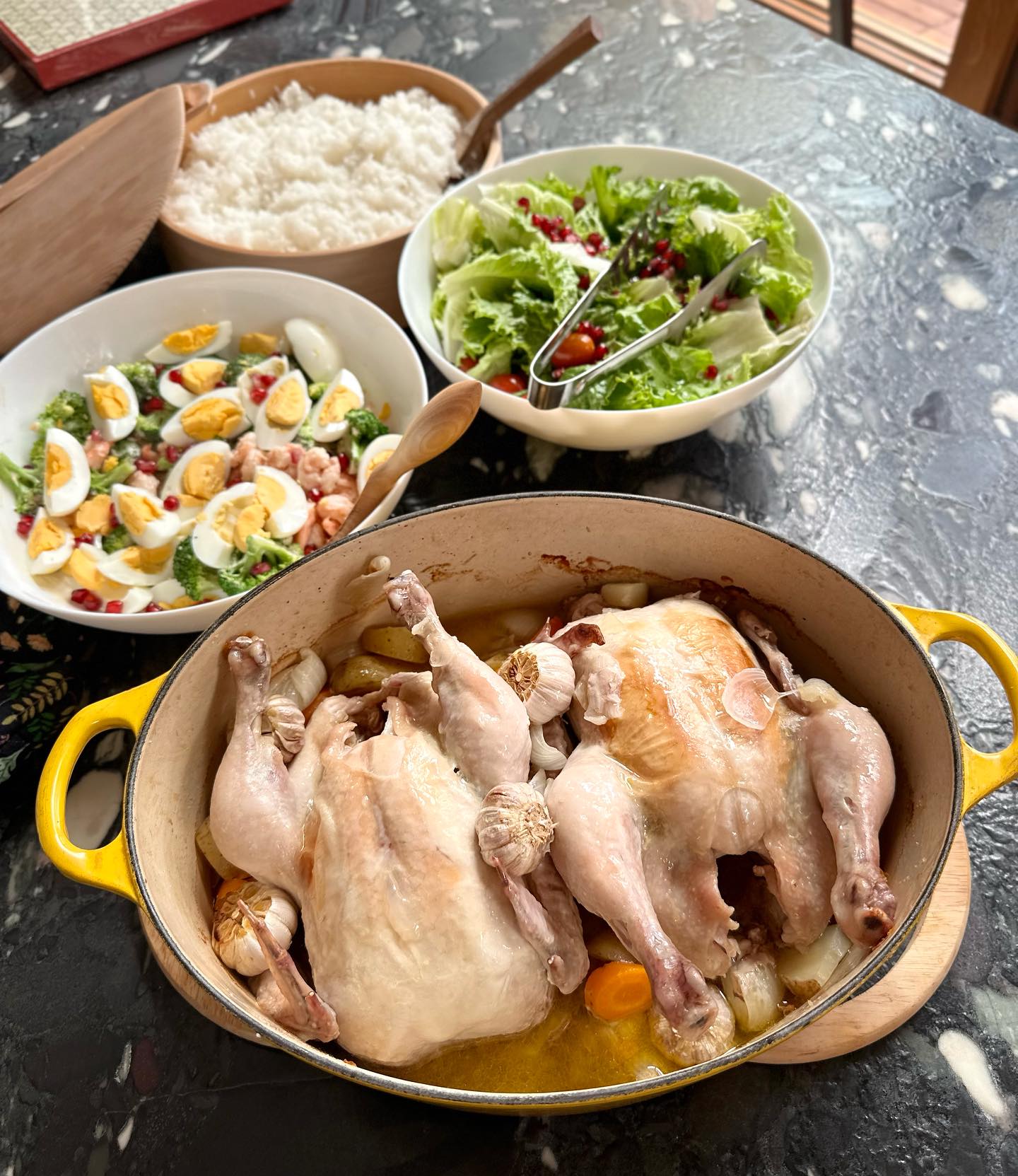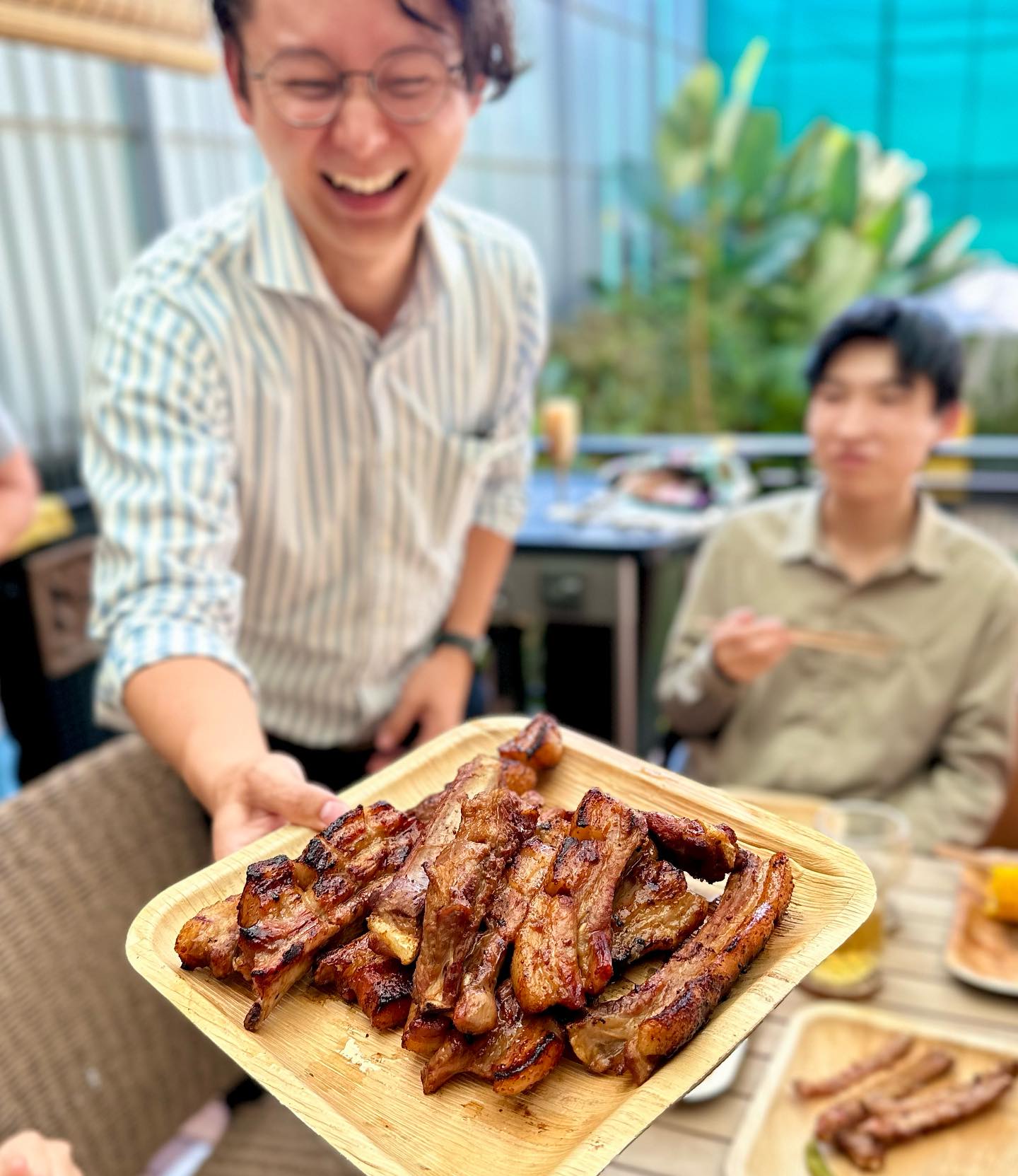 さて、前回のミューズ・クリエイション企画は家族連れによる参加者40名ほどの大規模なものであったが、今回は十数名と小人数につき、料理も、豚スペアリブ、丸鶏グリル、野菜などに絞り込む。なんとなく炊いていた日本米が大人気(インド産の日本米である谷藤米)であった。