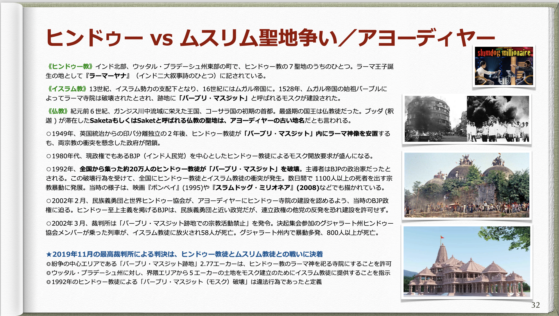 なお、以下の写真は、②の動画で使用しているプレゼンの資料だ。このアヨーディヤーを巡る歴史についても言及している。