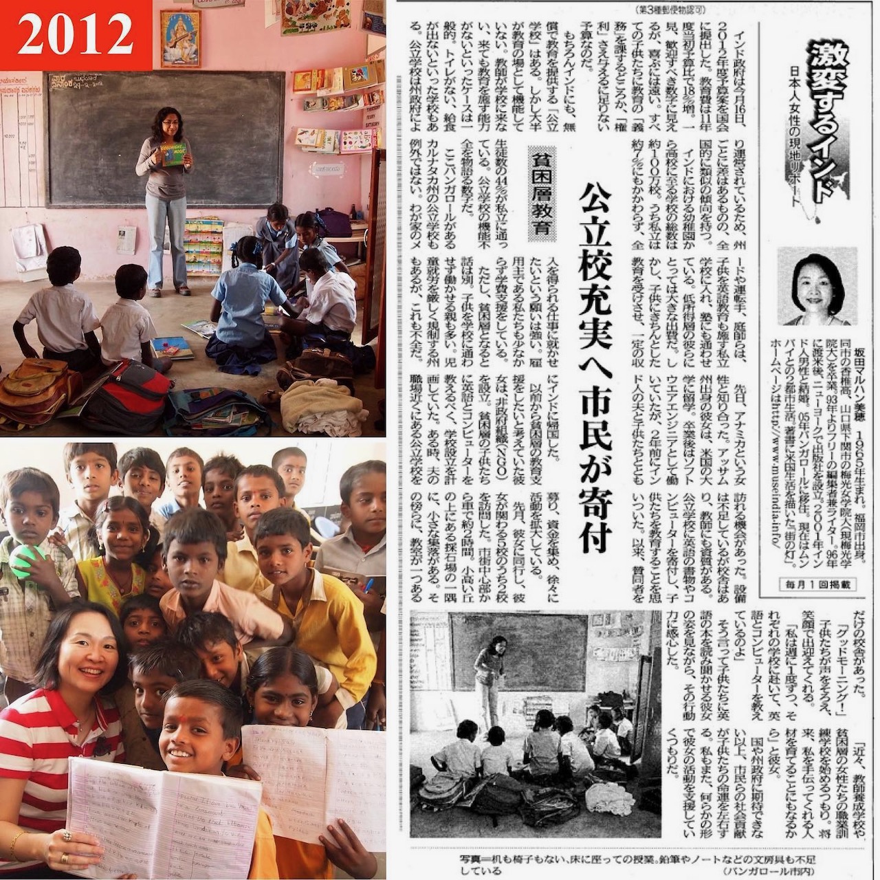 本業の傍ら、彼女は以前から考えていた貧困層の子どもらに英語やコンピュータ教育の支援を実現すべく、同団体を立ち上げた。当初は自ら車を運転して僻村の学校へ通い、教鞭をとっていた。自身も二人の子供をもつ母親ながら、その行動力と情熱には敬服するばかりだった。その時の様子は、ブログに記録を残すと同時に、わたしが当時、西日本新聞に毎月連載していた『激変するインド』でも紹介した。