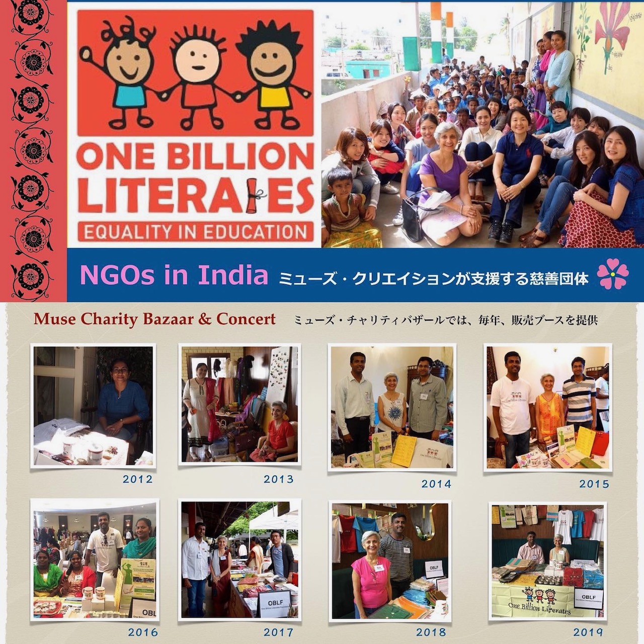 ミューズ・クリエイションの貢献はといえば、超微力ではあるが、ミューズ・チャリティバザールで、毎年、同団体に無償でブースを提供するほか、OBLFが支援する村の公立学校を訪問し、子どもたちと遊ぶなど交流を図ってきた。一方、我が夫Arvind Malhanは、2013年に同団体の役員となり、大企業からの寄付金を調達、ファンドレイジングにも貢献している。