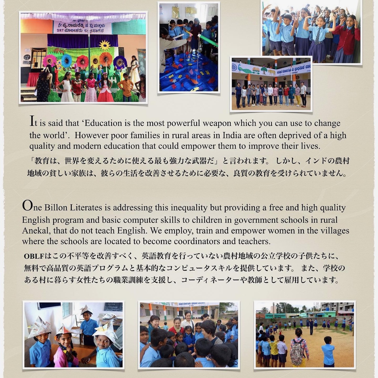 金曜の夜、ミューズ・クリエイション、そしてわたしの夫が深く関わってきた慈善団体のひとつ、OBLF (One Billion Literates Foundation) が年に一度開催している定例の活動報告会に出席した。バンガロール南部農村エリアを拠点とするOBLFは、貧困層の子どもたちが通う公立学校(Government School)へ、英語やコンピュータの教育を支援する慈善団体として誕生した。