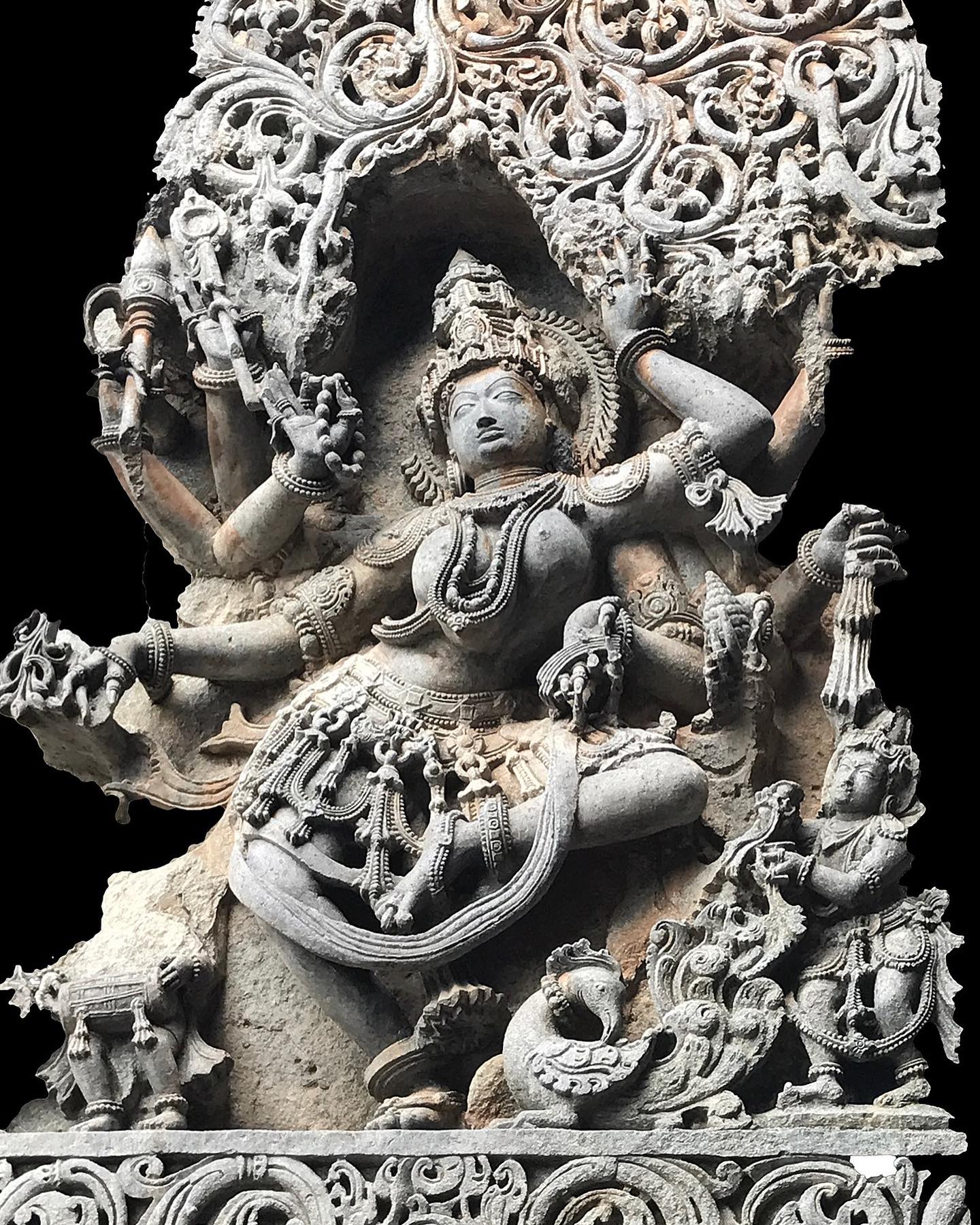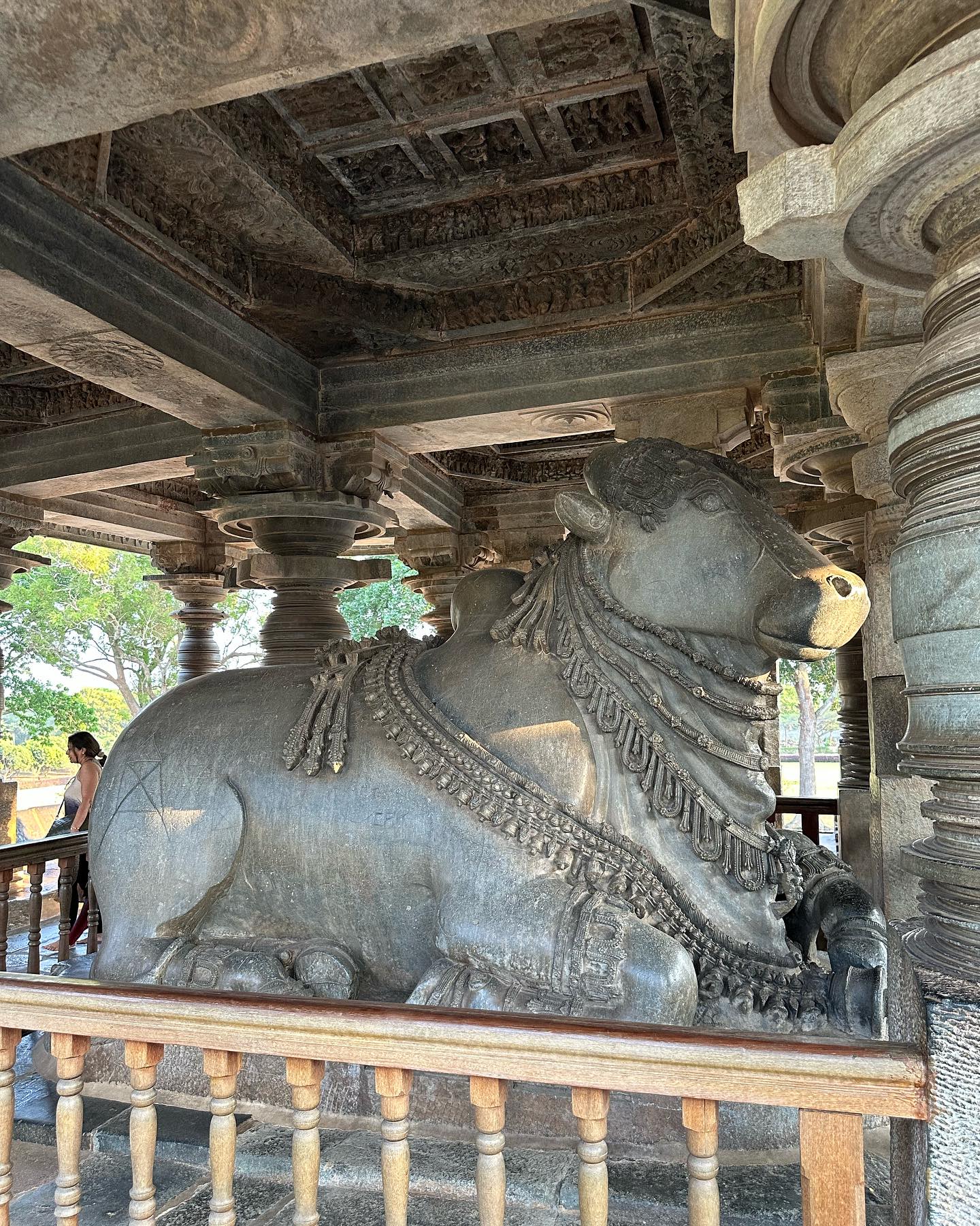この寺院は、シヴァ神を祀るシヴァ派の寺院でありつつも、シャクティ派など女神の要素も包摂され、男性性と女性性が共在。またヒンドゥー教の寺院でありながら、ジャイナ教の要素も見られるなど、多様なテーマを崇敬している。南北には、滑らかに麗しい2体のナンディ(牝牛)が祀られている。