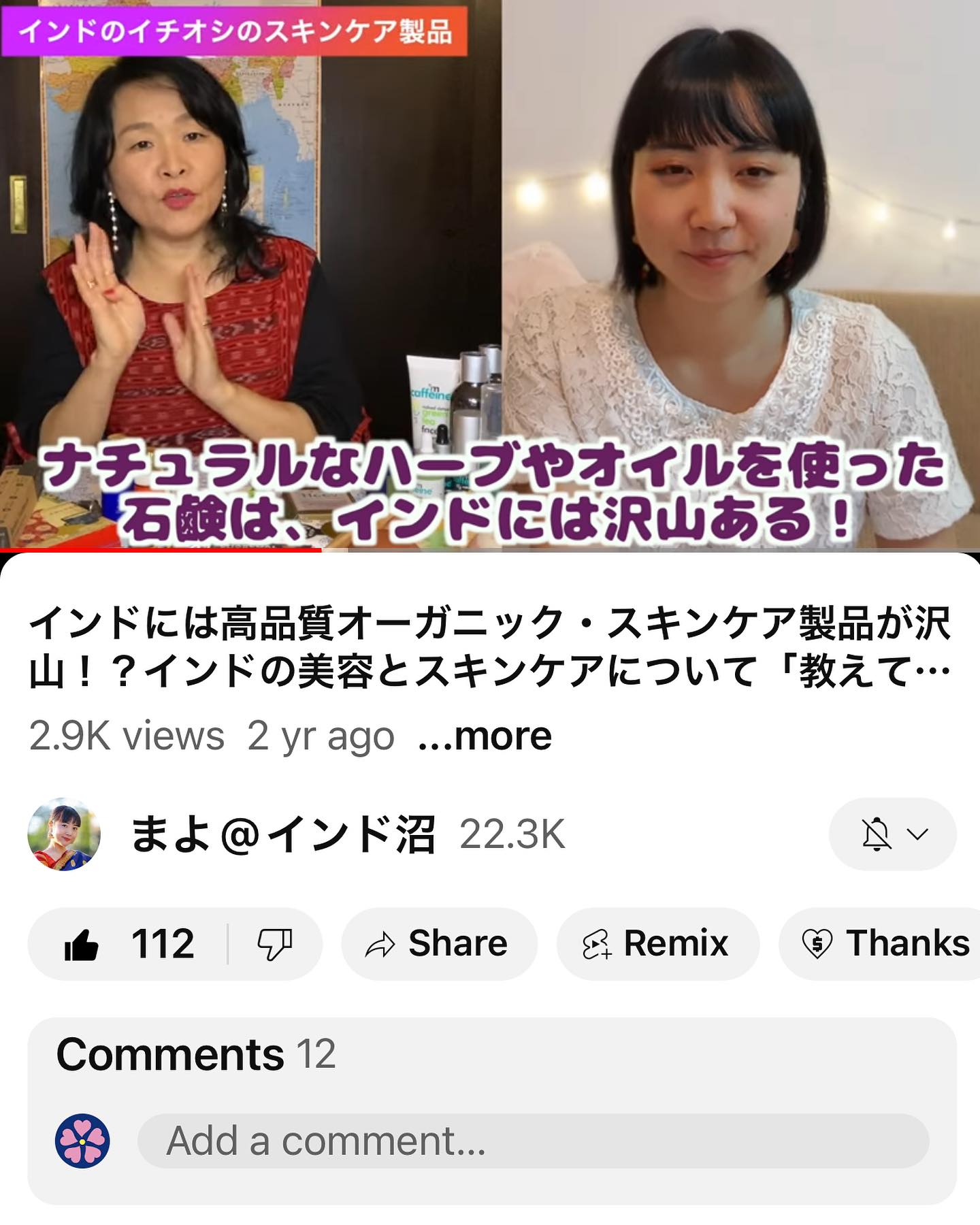 ところでパンデミック時代に数多くの動画を作ったが、インドの美容についても語っている。また、インド系Youtuberの眞代さんとのコラボレーション『教えて! みほ先輩!』シリーズでも、インドの自然派コスメや美容関係について、語っていたことを先日思い出した。久々に見ると、商品の栄枯盛衰が顕著で、すでにお勧めできないプロダクツもあるのだが、非常に面白い(自分で言う)のでご覧いただければと思う。