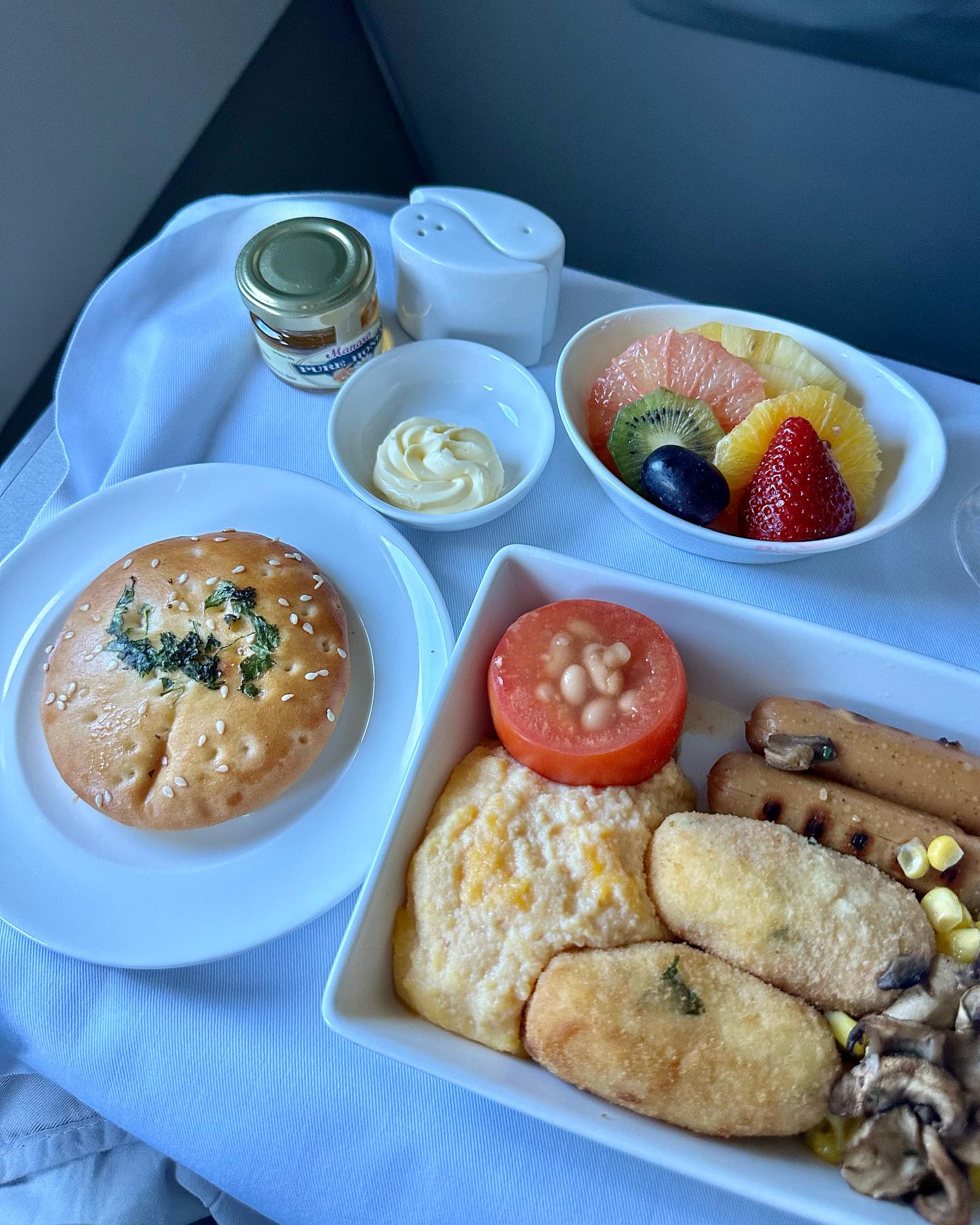 フライトで出されたパンやお菓子のパッケージの文字に、異国情緒が漂う。
