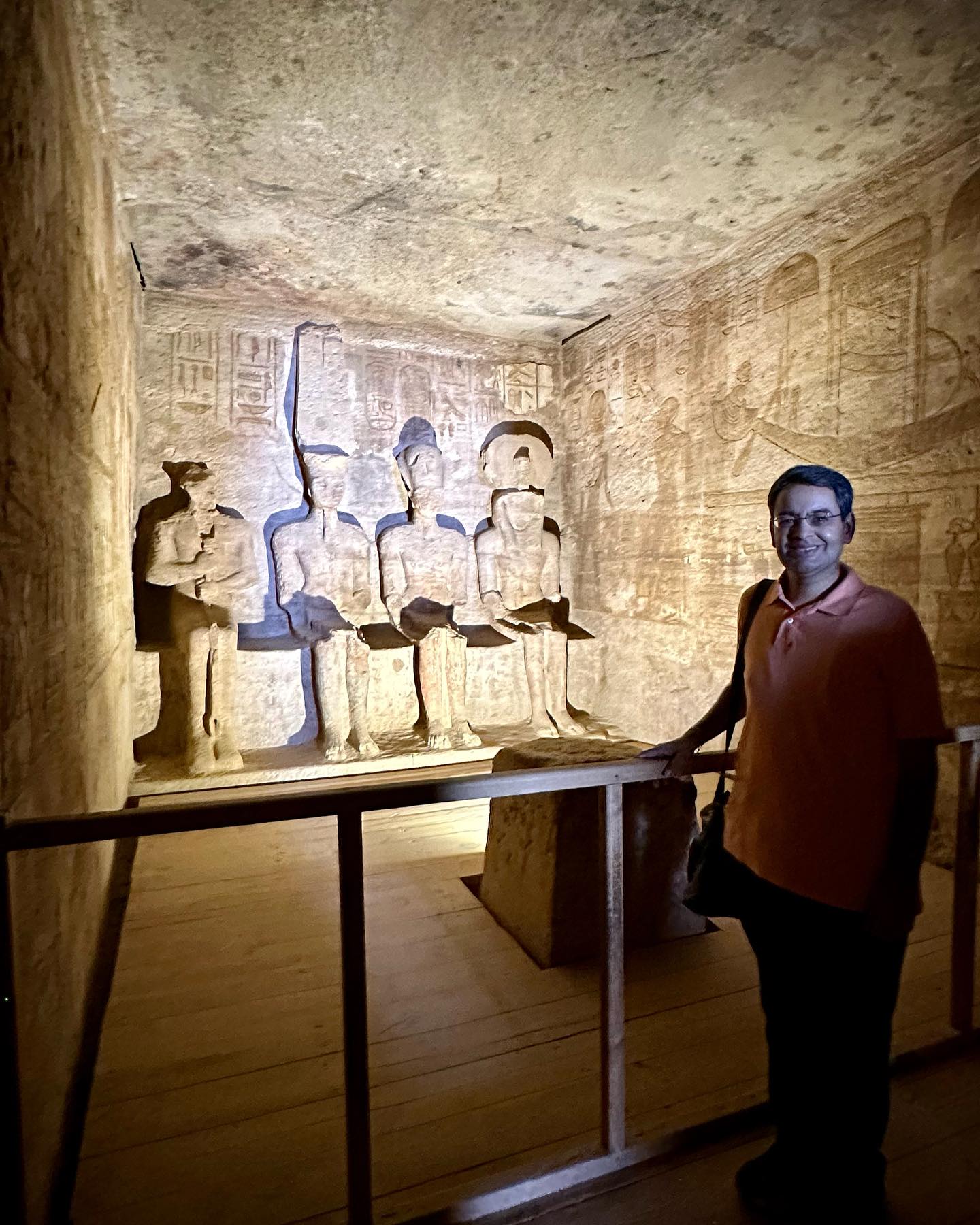 左右の壁画レリーフの主人公もまた、戦闘地で奮闘するラメセス2世の勇姿だ。正面奥、我が夫が立っている至聖所の3人の神々とラメセス王が並んで座っている。ここは2月と10月の年に2回だけ朝日が差し込み、左端の冥界神を除く3体に光が当たるようになっているという。