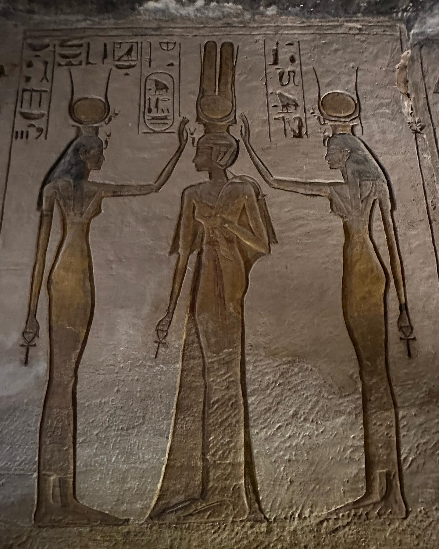 さて、アブ・シンベル大神殿は、ラメセス2世の自我が顕在化したような場所だと思う。入り口の4体(1体は自然崩壊)は全員、ラメセス2世。石窟に入ってすぐの、左右に並ぶ8体の立像も、オリシス神の姿を借りたラメセス2世。
