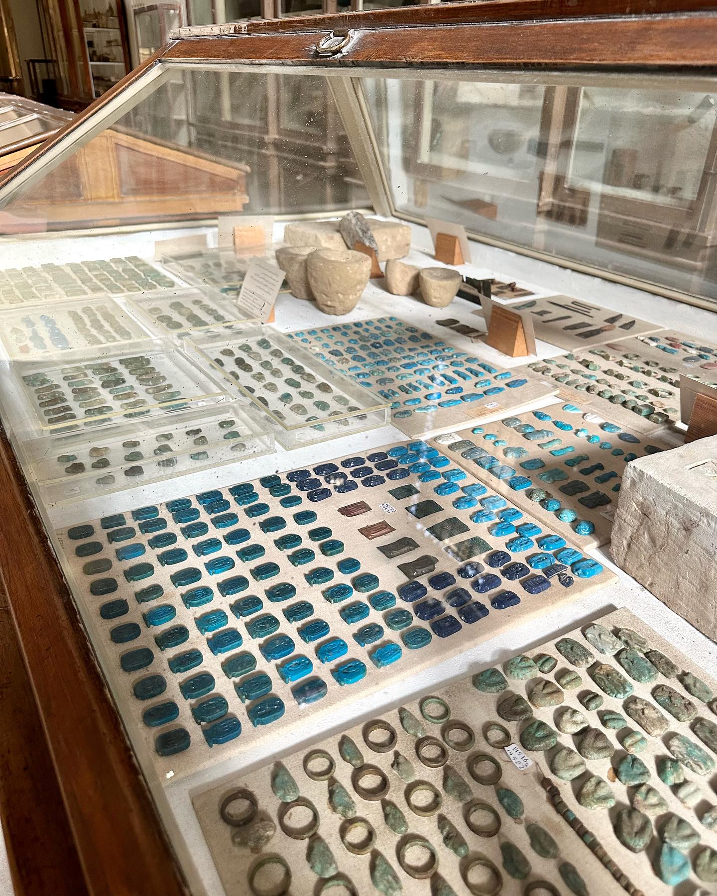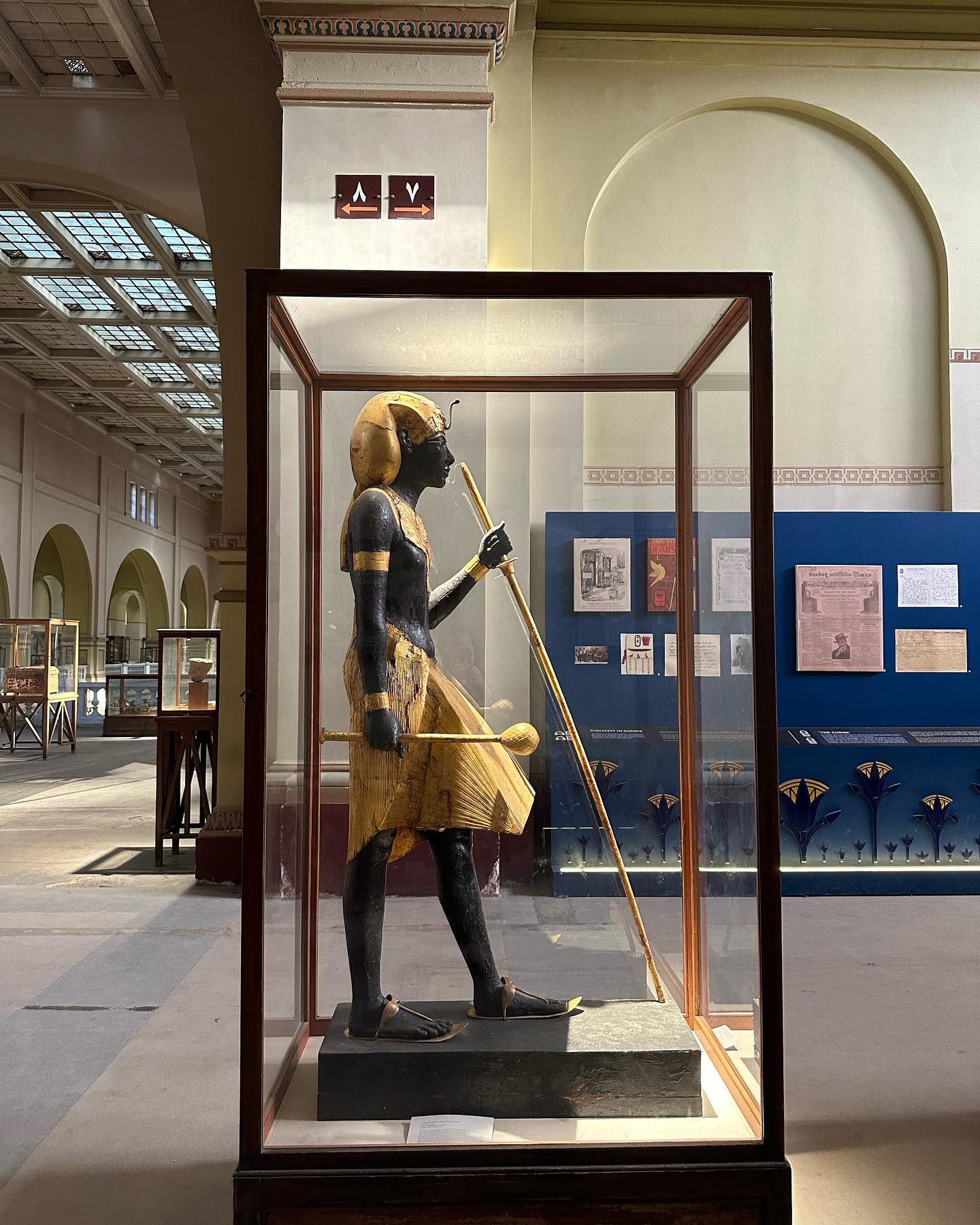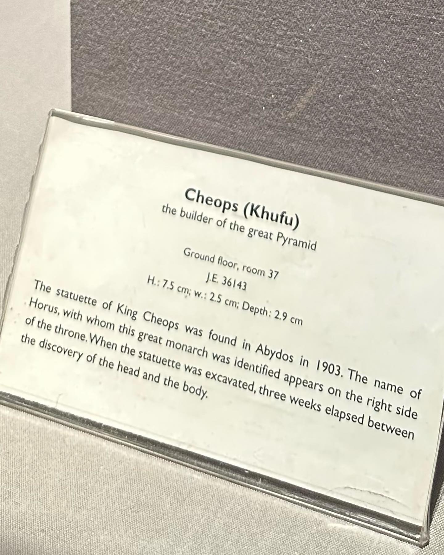 最後の2枚の写真。知らなければ見逃してしまうほどの小さな像。ギザの大ピラミッドを建造させた、クフ王の姿を確認することができる唯一の像だという。高さ約7.5cmの象牙製。1903年にアビュドスにある神殿遺跡から発見されたもの。