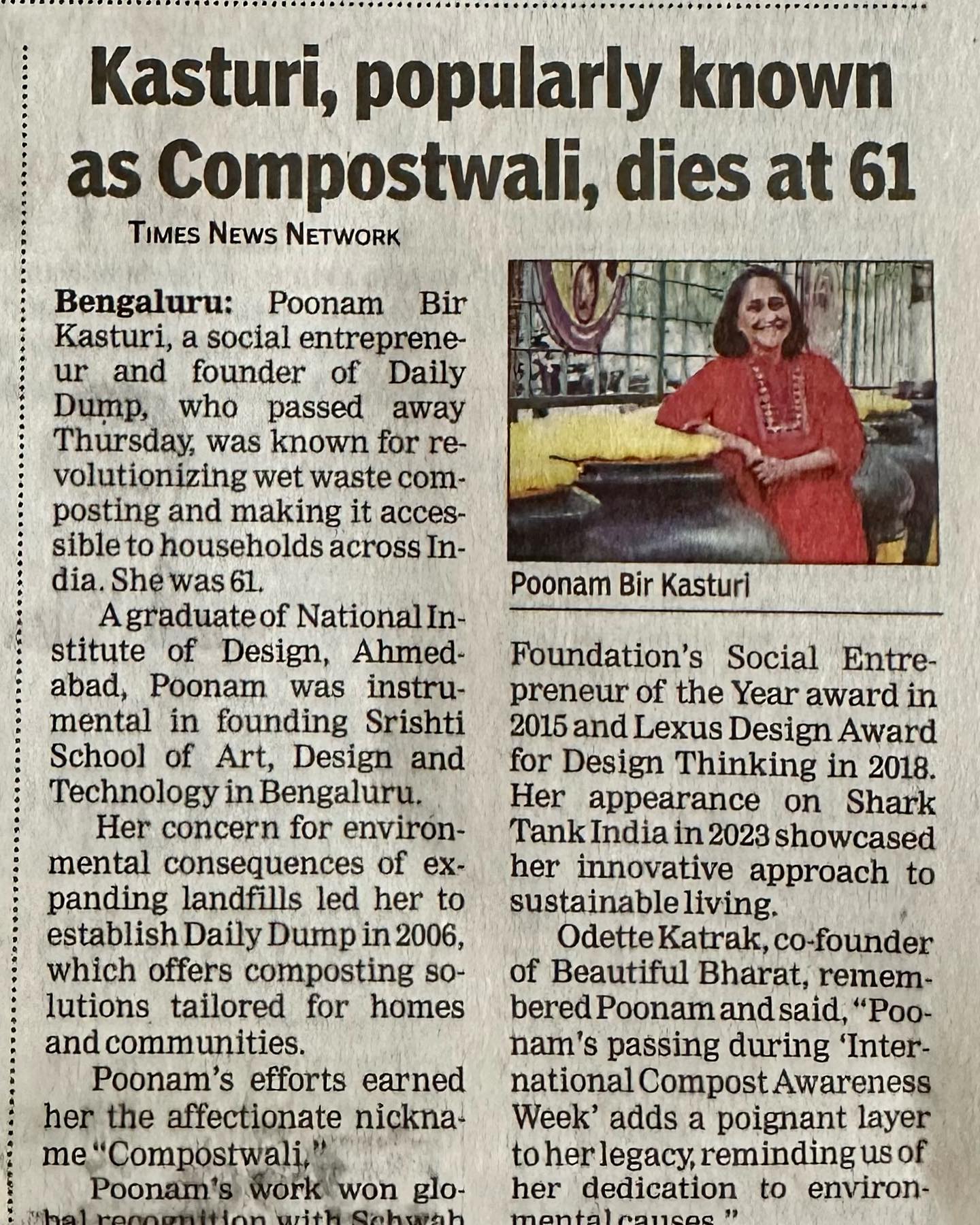 “Poonam Bir Kasturi who transformed waste management in Bengaluru dies at 61”