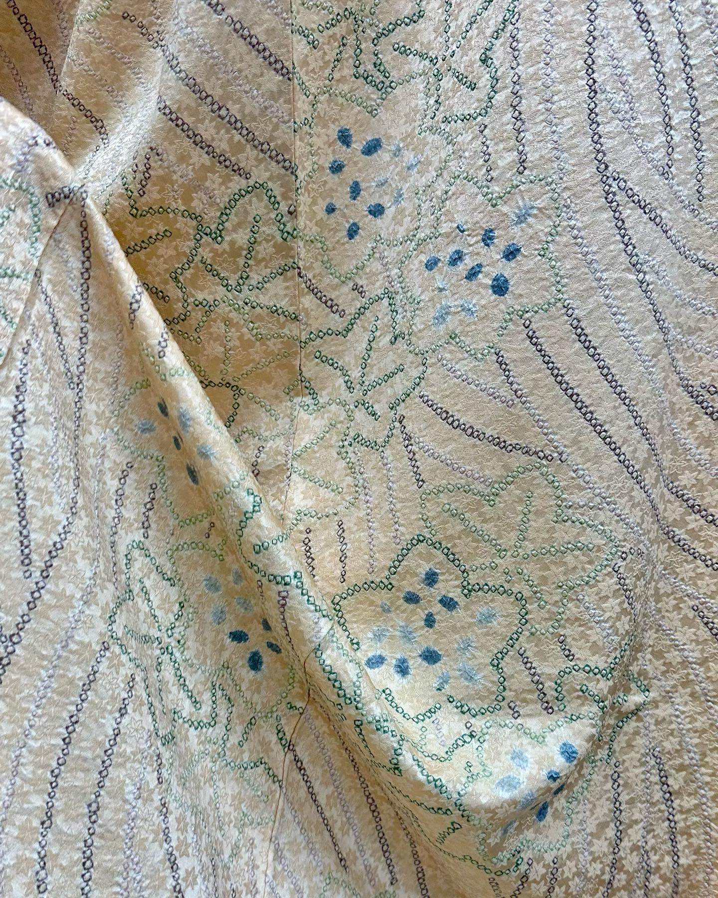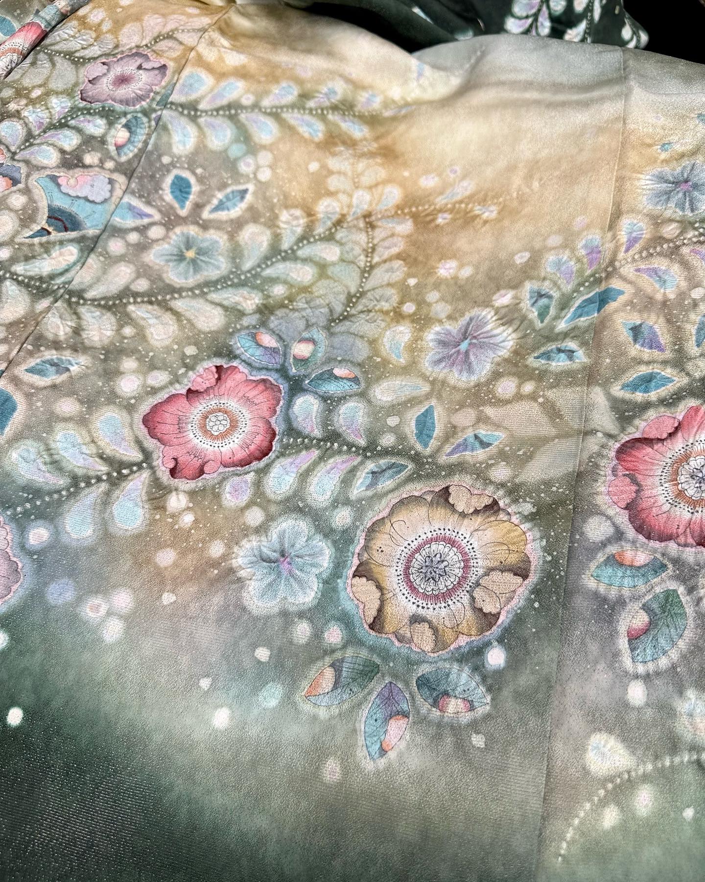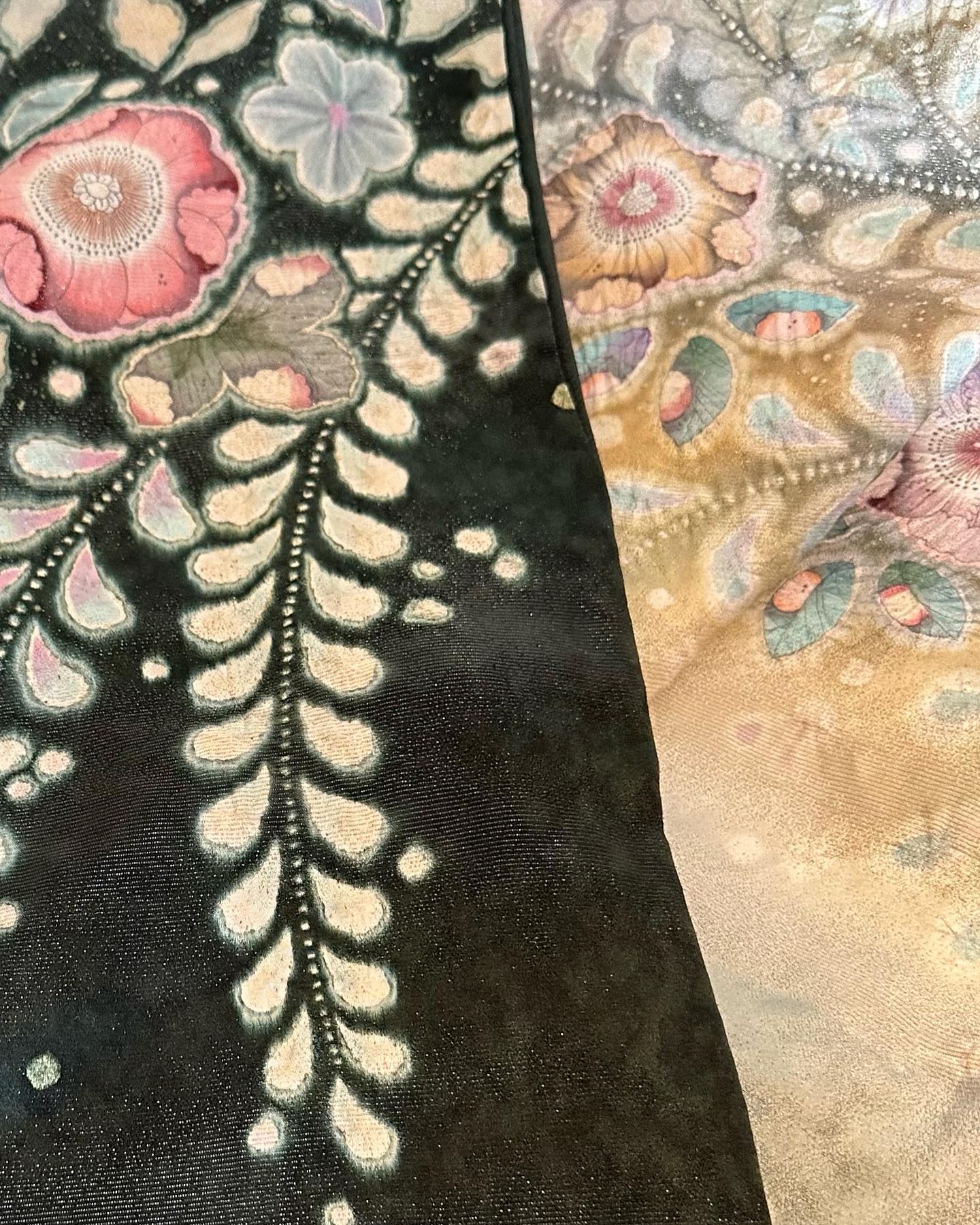 さらには……! 数ある着物の中から、「わたしはここにいますよ!」と呼びかけてくる一枚があった。……辻が花! なんと艶やかな美しさ! これはかなり高価であるに違いない。それよりなにより、サイズはわたしには小さかろう。しかし、気になる。ちょっと試着してみたいと広げてもらったところ……大柄なわたしにぴったりの寸法! しかも古めのリユースなのでお値段も想像していたよりはるかにお値打ち!