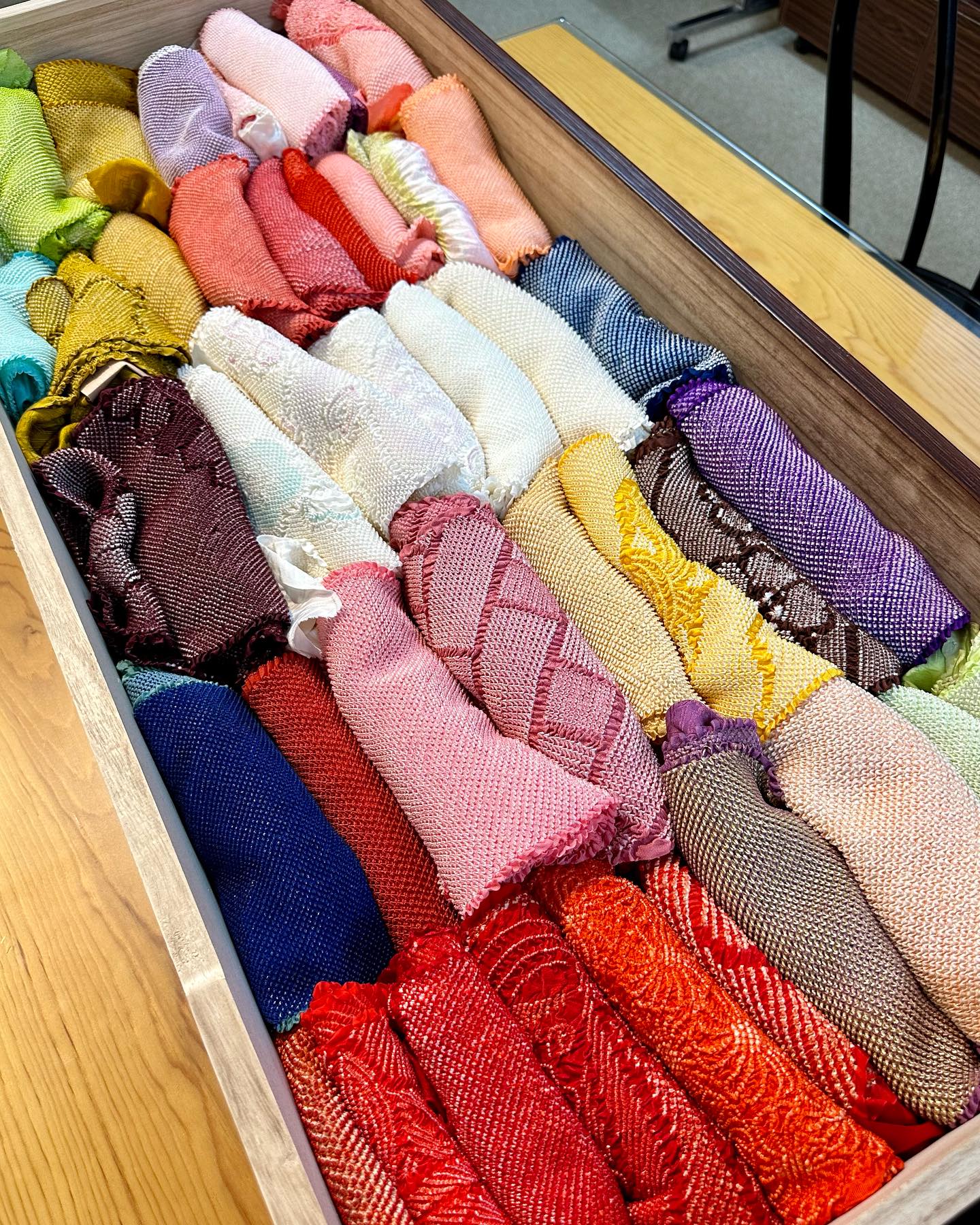 この店にはまた、上質なリセールの着物が数多く揃っている。帯にも着物にもついつい見入るが、今回はもうスーツケースの重量超過だ。しかしながら、絞り染めの帯締めがまたすばらしく、看過できず。ストール代わりに欲しいとインド友らから頼まれていたことを思い出し、数枚を購入した。微細な仕上がりの見事な帯締めには感嘆するばかり……。