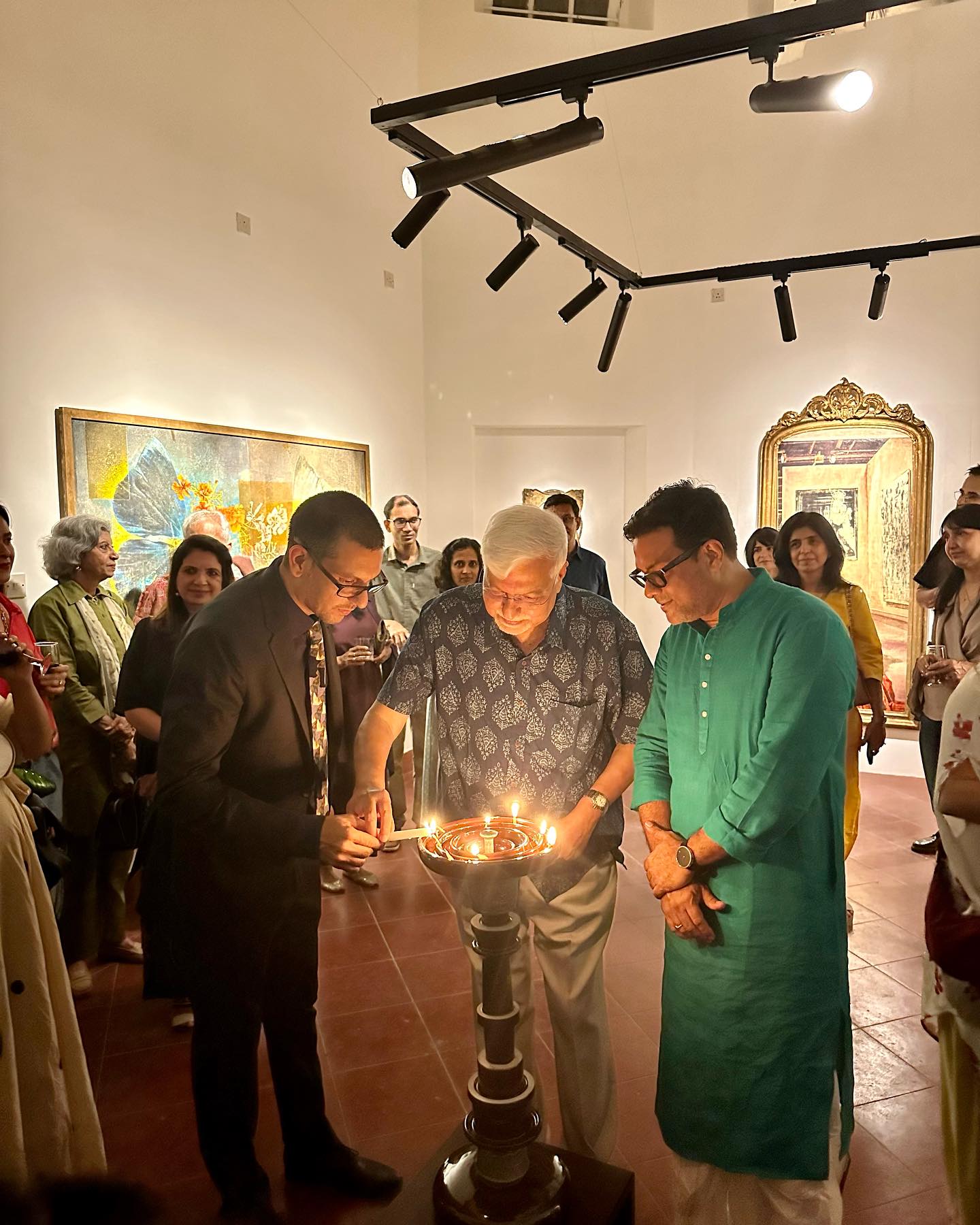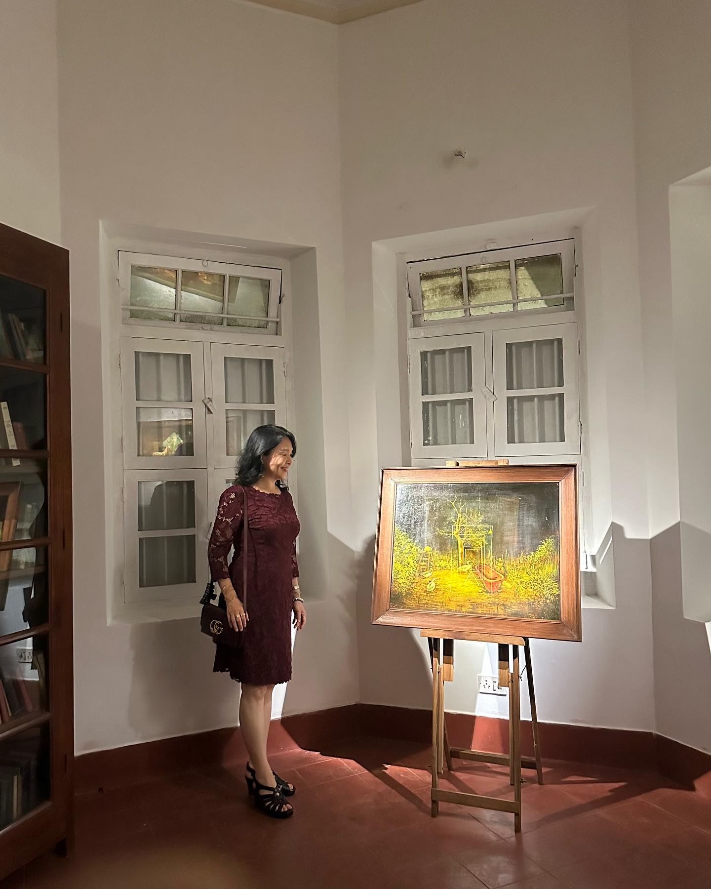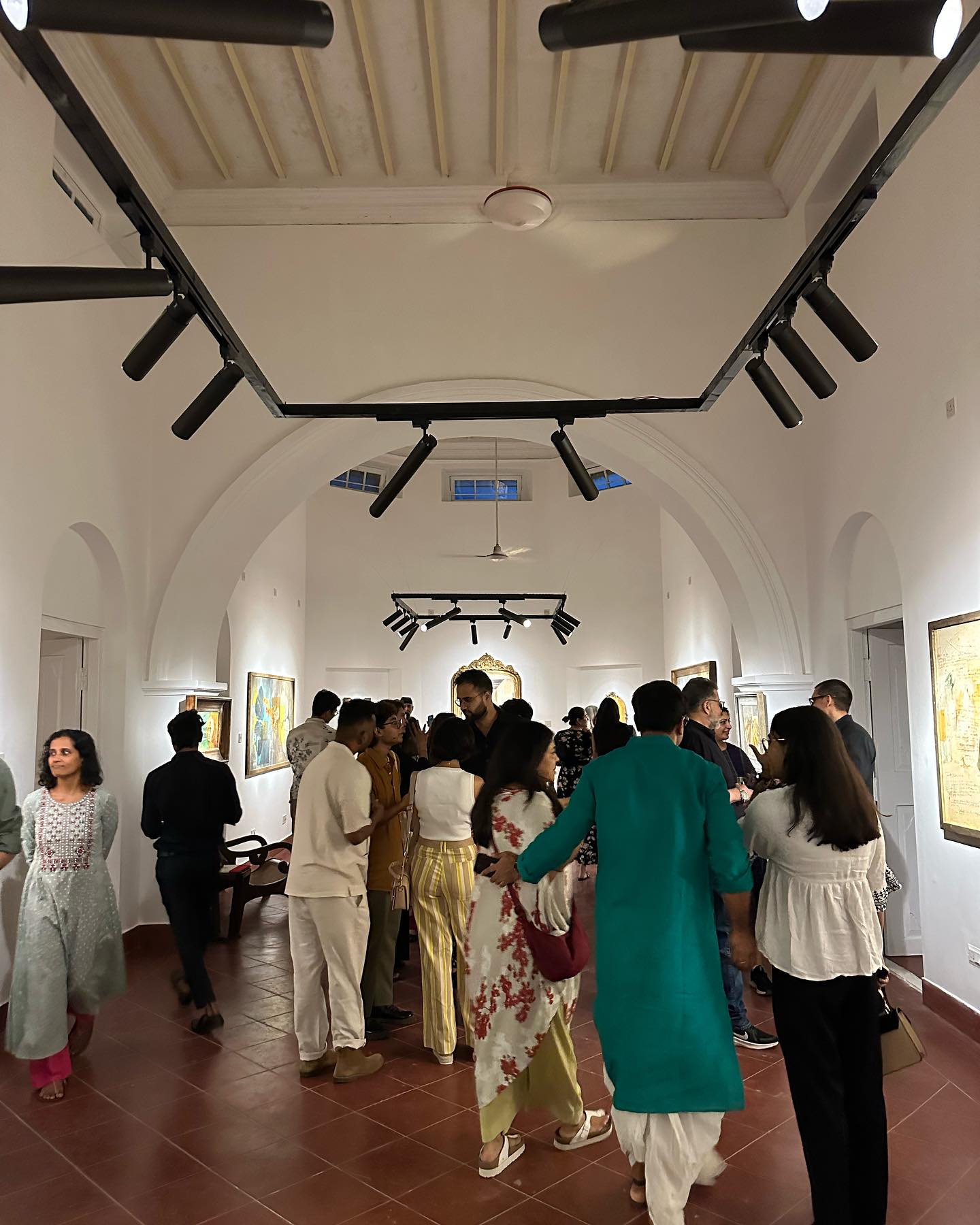 Ramanの足跡を辿り、彼の往年のライフを調査したうえでの、この場所での展示会。邸宅に入った瞬間に感じた「見事な調和美」は、Avijit自身が会場と絵画を演出しているからだろう。中央の広いホールでは、ゲストたちがワイングラスを片手に語り合う。左右には小さね部屋があり、そこにも作品が展示されている。