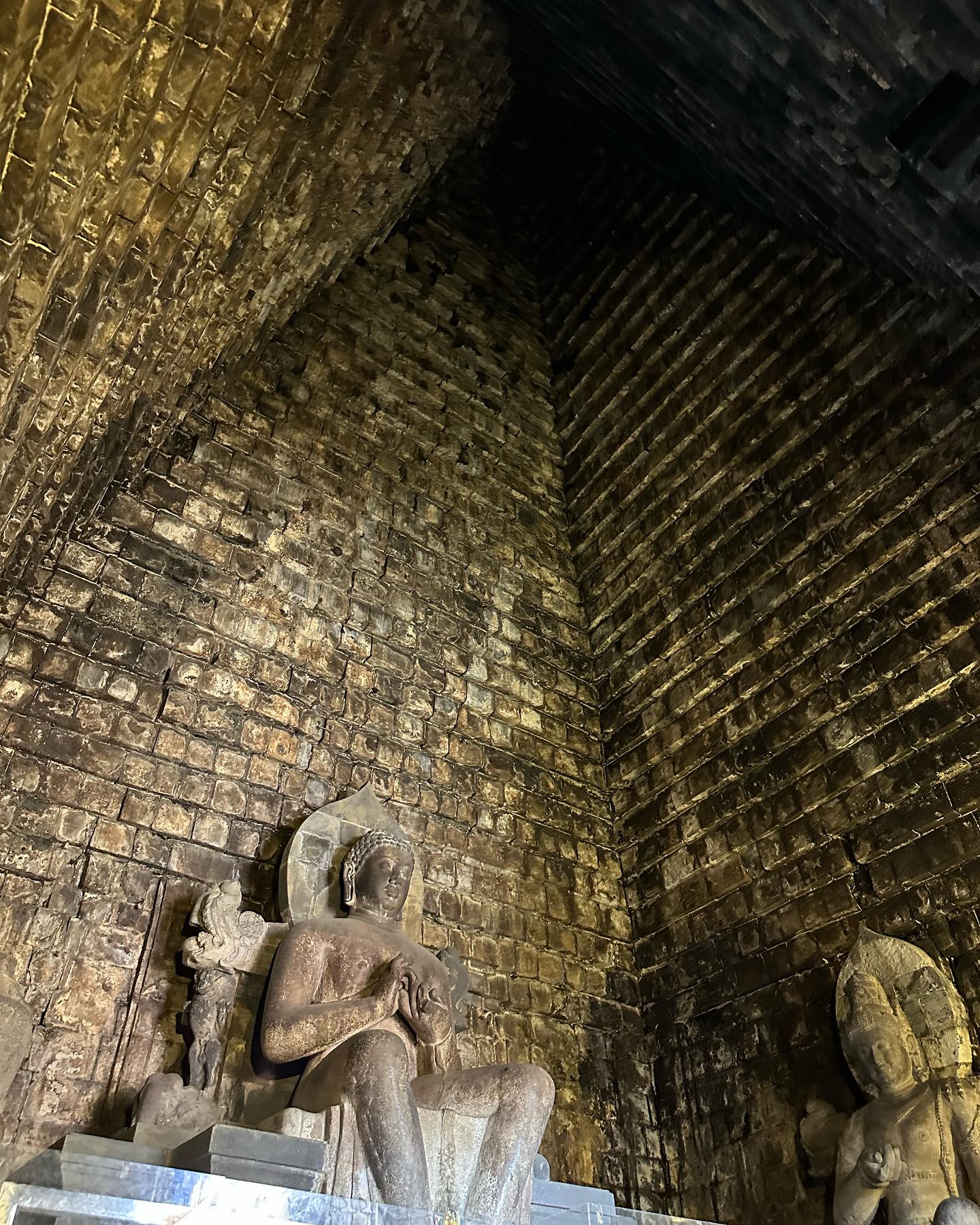 非常に小さな寺院ながらも、中に一歩足を踏み入れるや、静謐な空気に包まれる。三体の仏像、そして吸い込まれるような奥行きある天井。二人して座し、しばし、瞑想のひとときを過ごす。