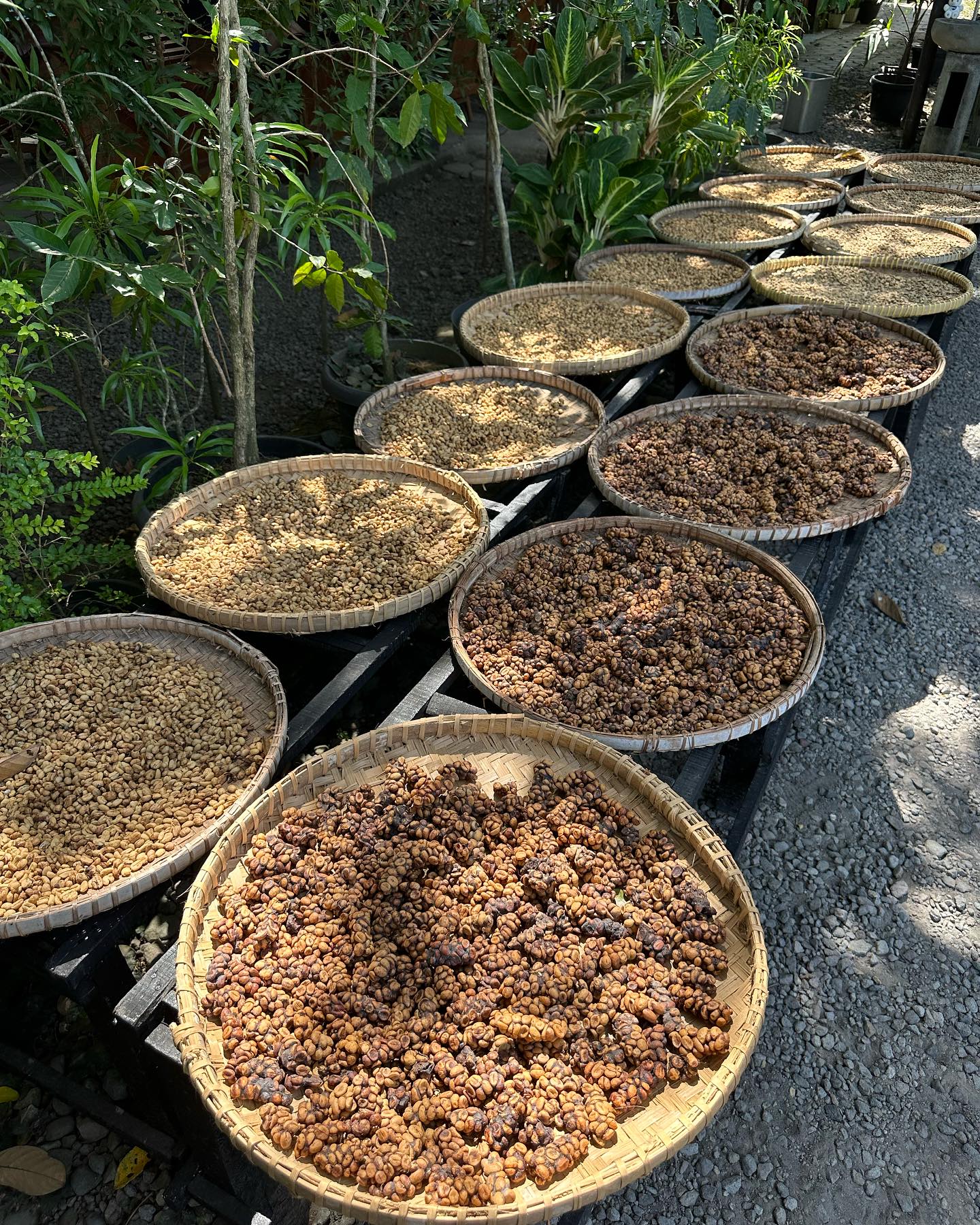 これは、ジャコウネコ(ルアック)の排泄物、すなわち糞から未消化のコーヒー豆を集めて作られたコーヒーのこと。写真、手前のザルに入っているのがその排泄物。これをがっつりと洗浄すると、白っぽくオリジナルにほぼ近いコーヒー豆が出てくるというわけだ。