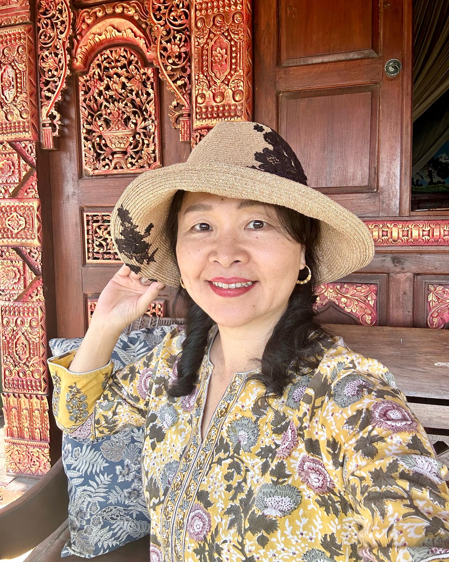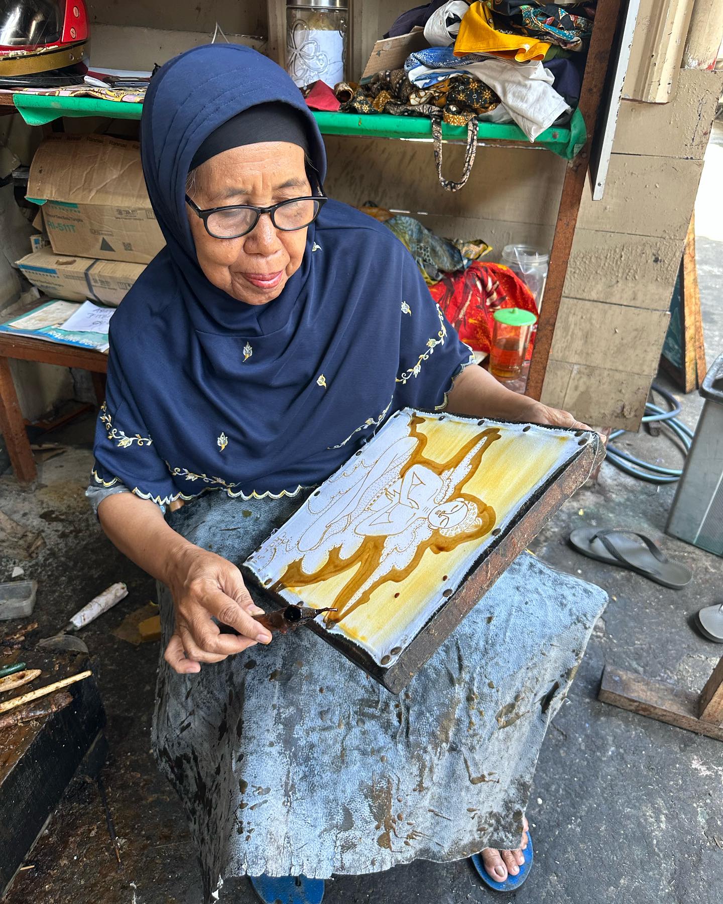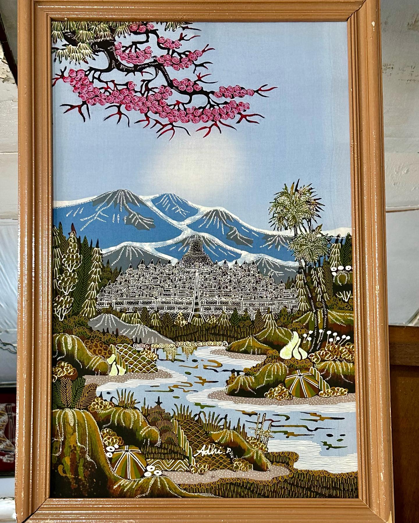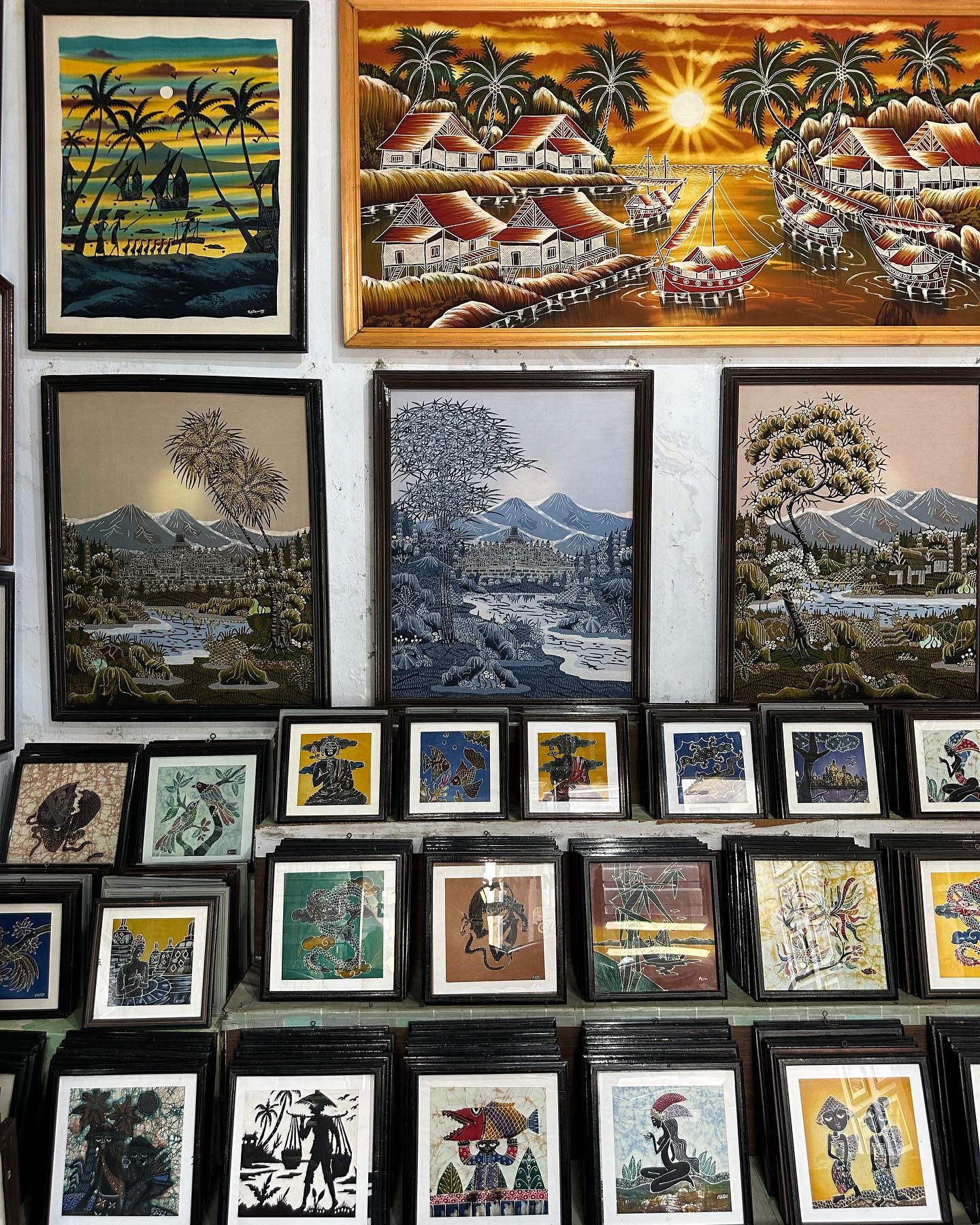 途中でまたしても、バティックの工房に立ち寄った。ここでは染色の体験もできるとのことで、旅行者らしき人たちの姿も見られる。前回同様、店舗に並ぶ衣類は機械製品ばかりだったが、アートはどれも、この工房の手作り。この旅の思い出に、夫は『ラーマヤナ』のラーマ王子とシータ姫をモチーフにしたものを、わたしはボロブドゥール寺院と桜の花に似た木がモチーフの作品を買った。バンガロールに帰って、額装してもらおう。