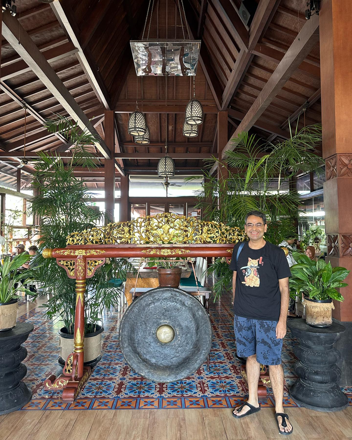 このホテルも夫が予約してくれていたのだが、彼もこんな眺望だとは知らなかったとのこと。彼曰く、プランバナン寺院に近いホテル候補は2カ所あったという。もう一つのホテルの方がラグジュリアスだが、こちらのホテルの方がレストランが有名だということで、食を優先した模様。確かにホテルの建物よりも、隣接するレストランの方がゴージャスで、眺めもすばらしい。