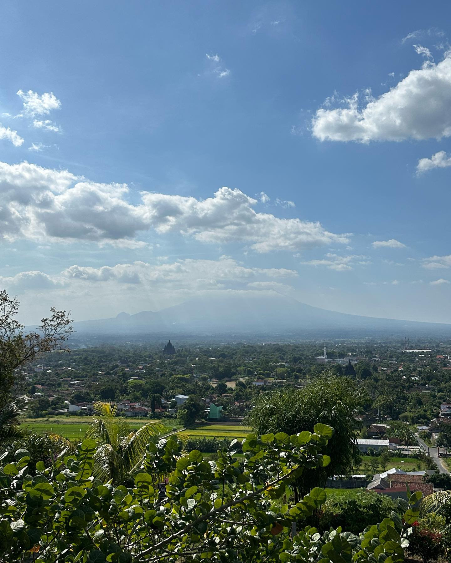 緑まばゆき田園に横たわる田舎道を走り抜け、鬱蒼と狭い山道を通過し、小高い丘の只中に立つホテルに到着。切り立った庭から見晴るかす景観のすばらしさ! ボロブドゥールからは富士山のように左右対称の山頂を見えていたムラピ山。ここからは火山の噴火を思わせる独特の姿で、富士山というよりは桜島。緩やかに、なだらかにのびる裾野が美しい。