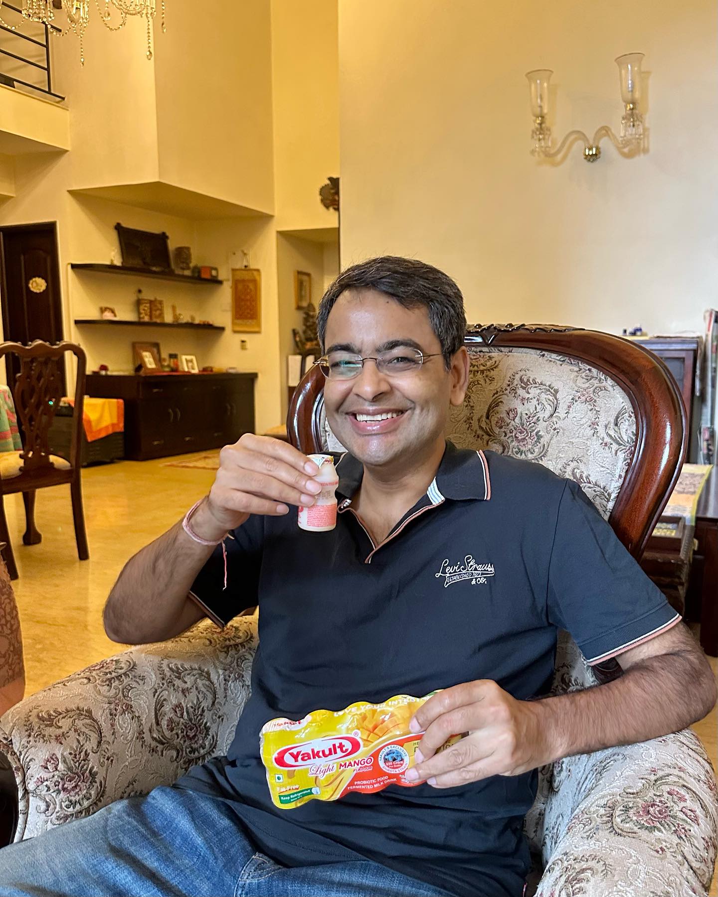 📷懐かしの写真もアップロード。ヤクルトは、インド進出当初より、高級ホテルの朝食ブッフェにて提供され、認知度を高められていた。ゆえに、普段、家で飲まなくても、旅先や出張先のホテルにて飲むことがよくあった。2023年の夫の写真は、ケララ州コチのホテルにて。たまたまヤクルトのTシャツを着ていた夫。もはや広告塔である。