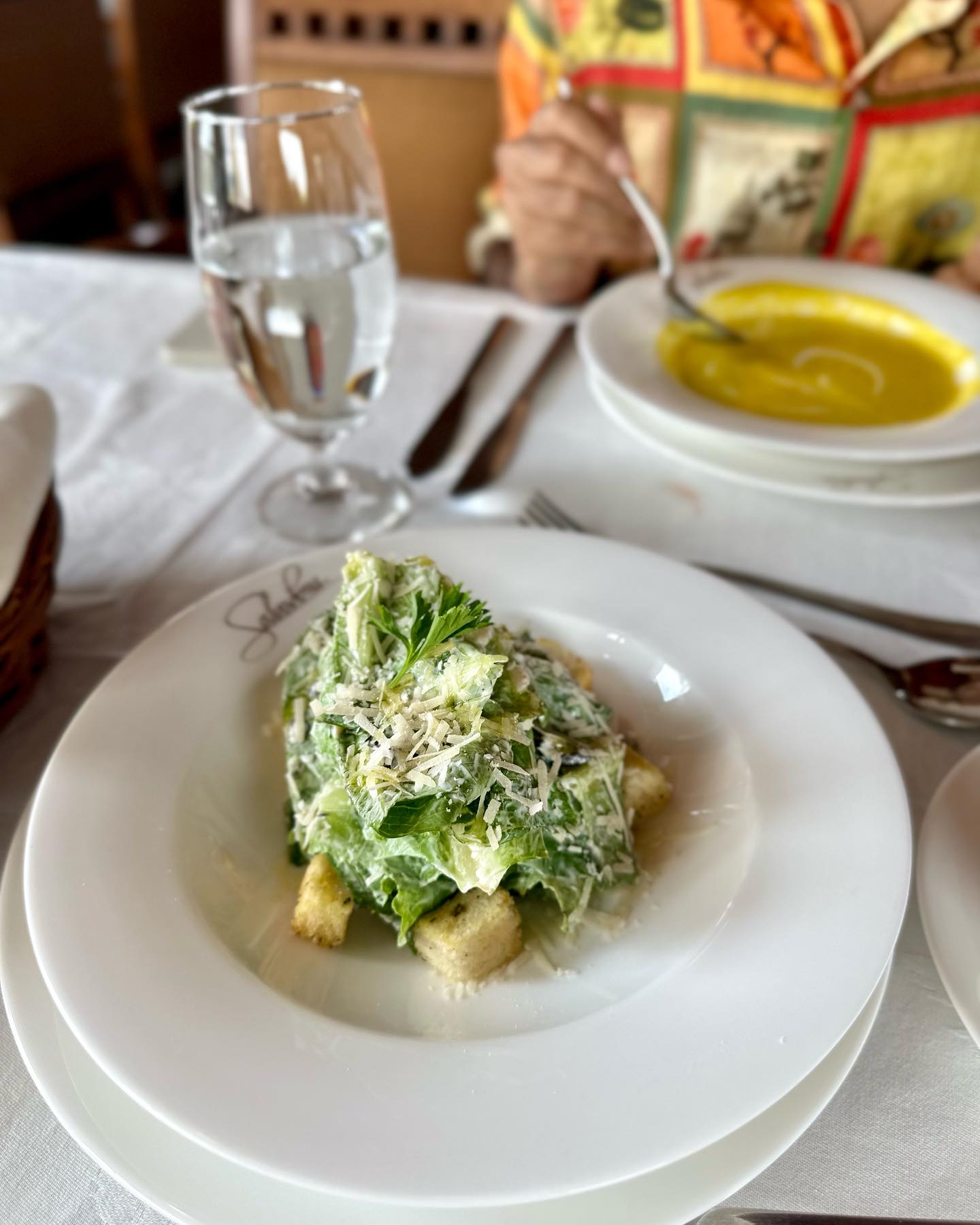メニューには、オーセンティックな欧州料理が並ぶ。ワインメニューも充実しているが、わたしは抜歯直後で飲酒できないし、夫もその後の予定があるので、昨日はフレッシュライムソーダとスイカジュースで乾杯した。注文したシーザーサラダ、スープ、魚のグリル、シーフードのパエーリャ……。いずれも、とてもおいしい。ビーフやチキン、ポークなど、肉類のメニューも豊かだ。しかもリーズナブル。しかも眺めがよい。