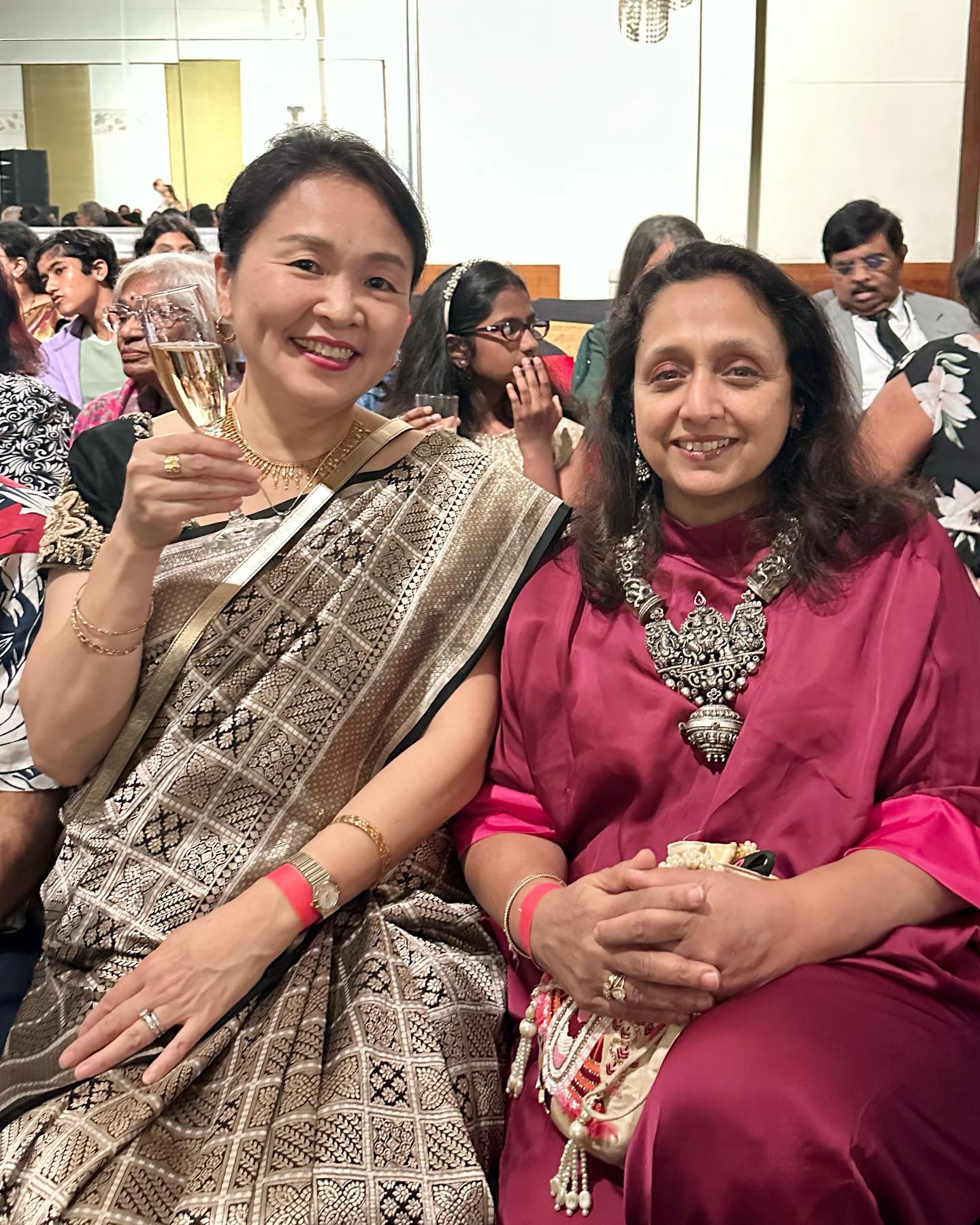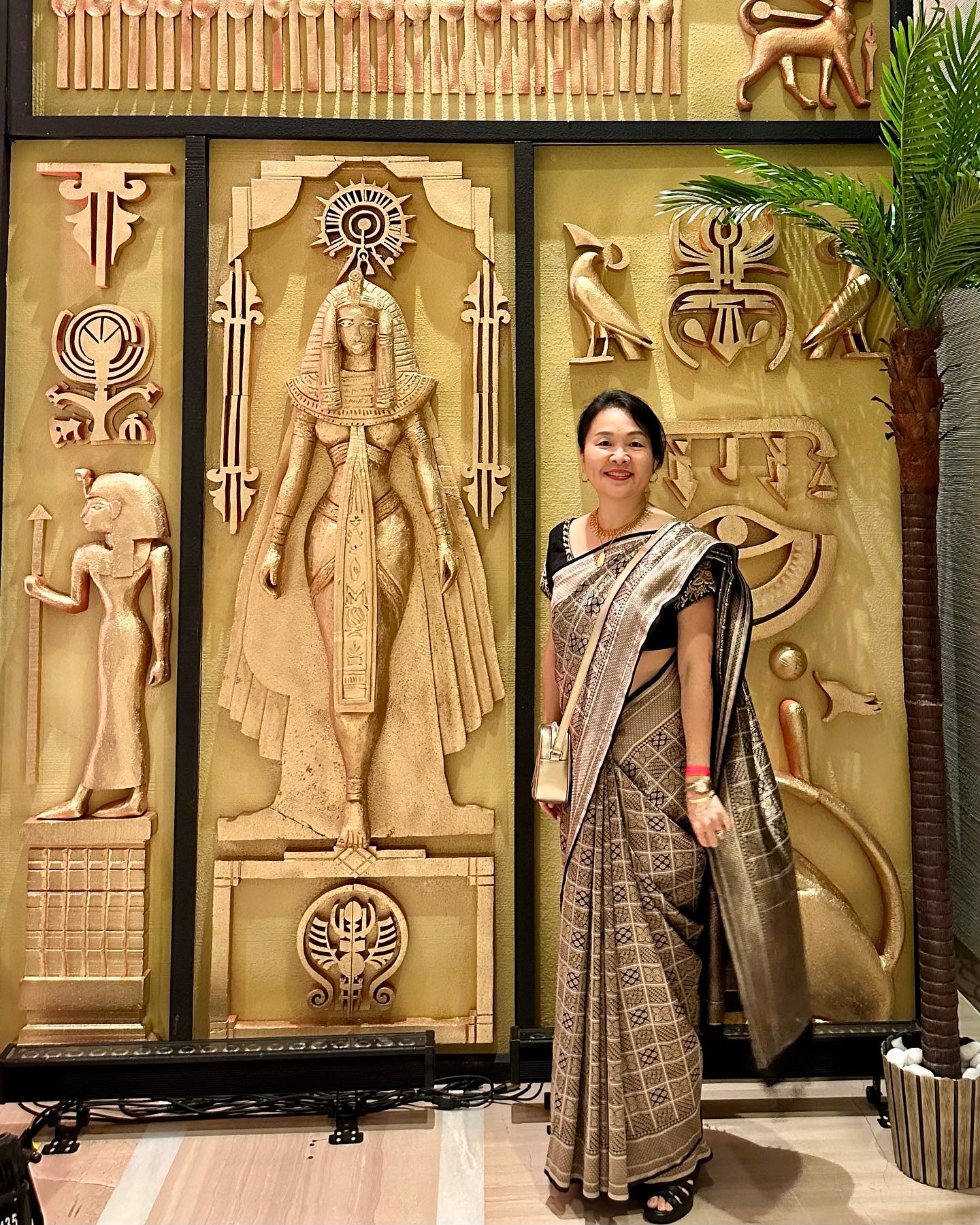 わたしは、そこはかとなくエジプト風味も漂うお気に入りのバナラシ・シルクのサリーを着用。友人Yashoのサリーブランド、MRINALINIで購入したお気に入りの一枚だ。