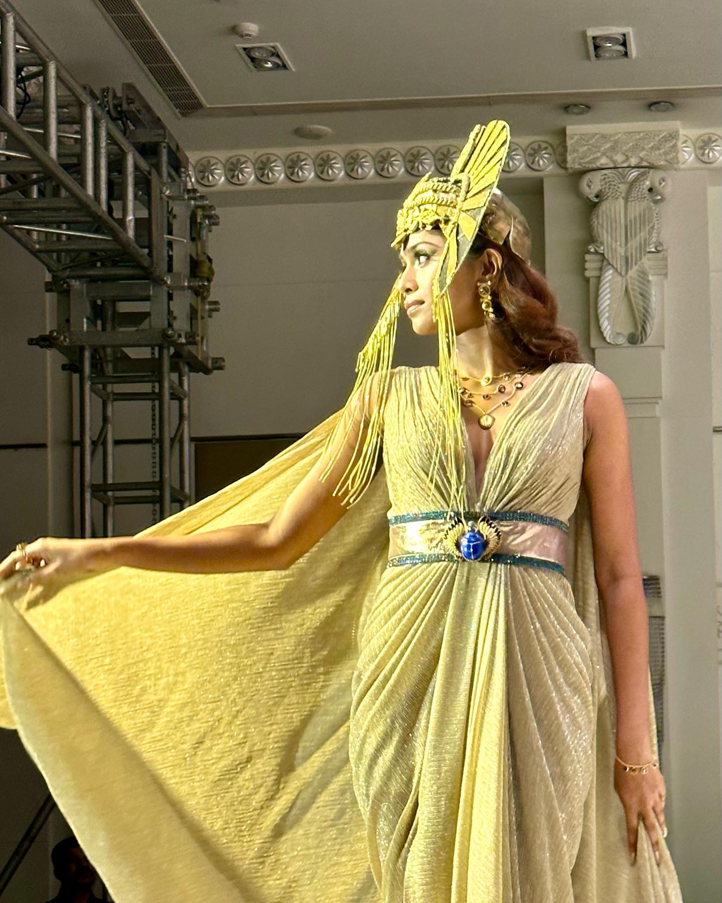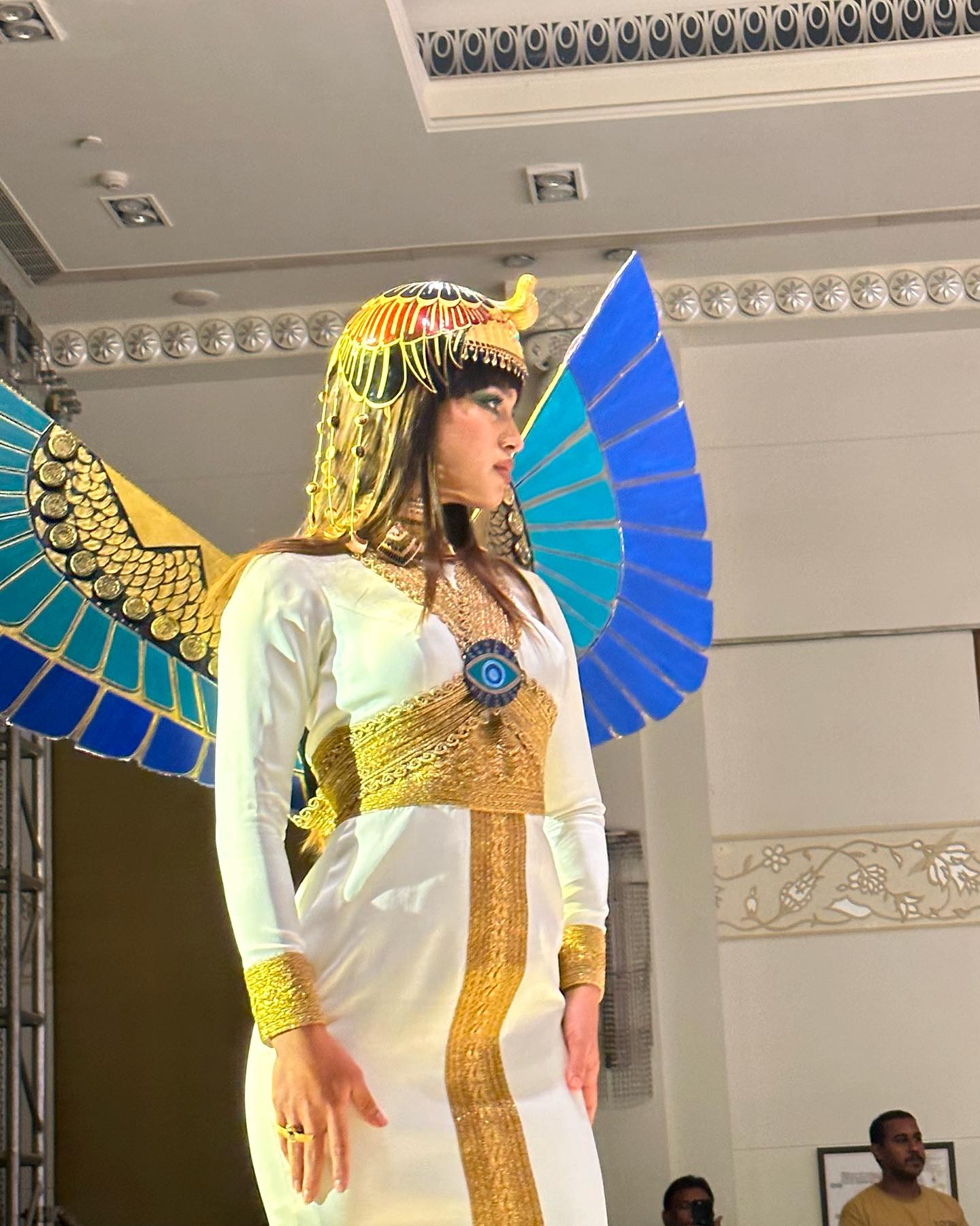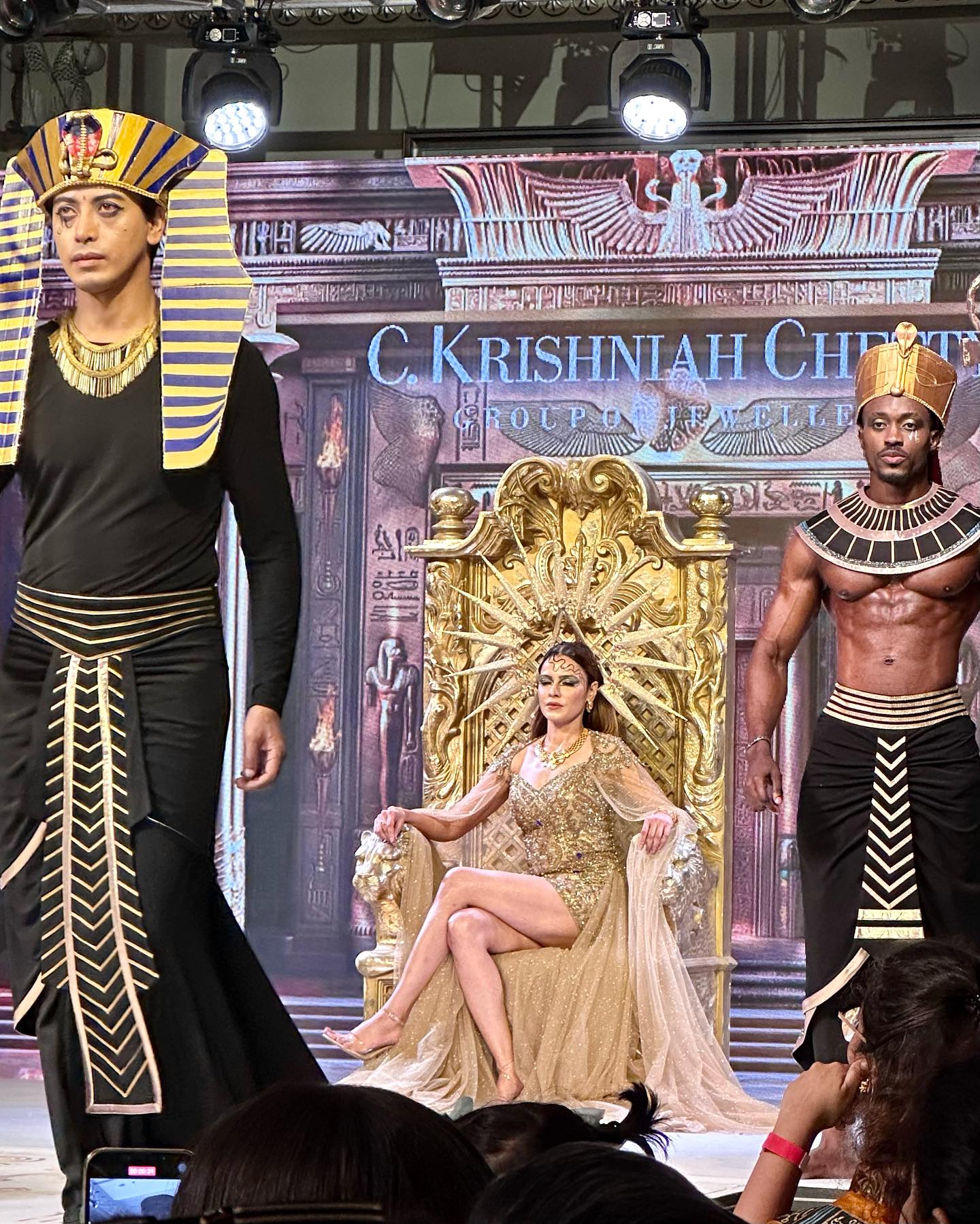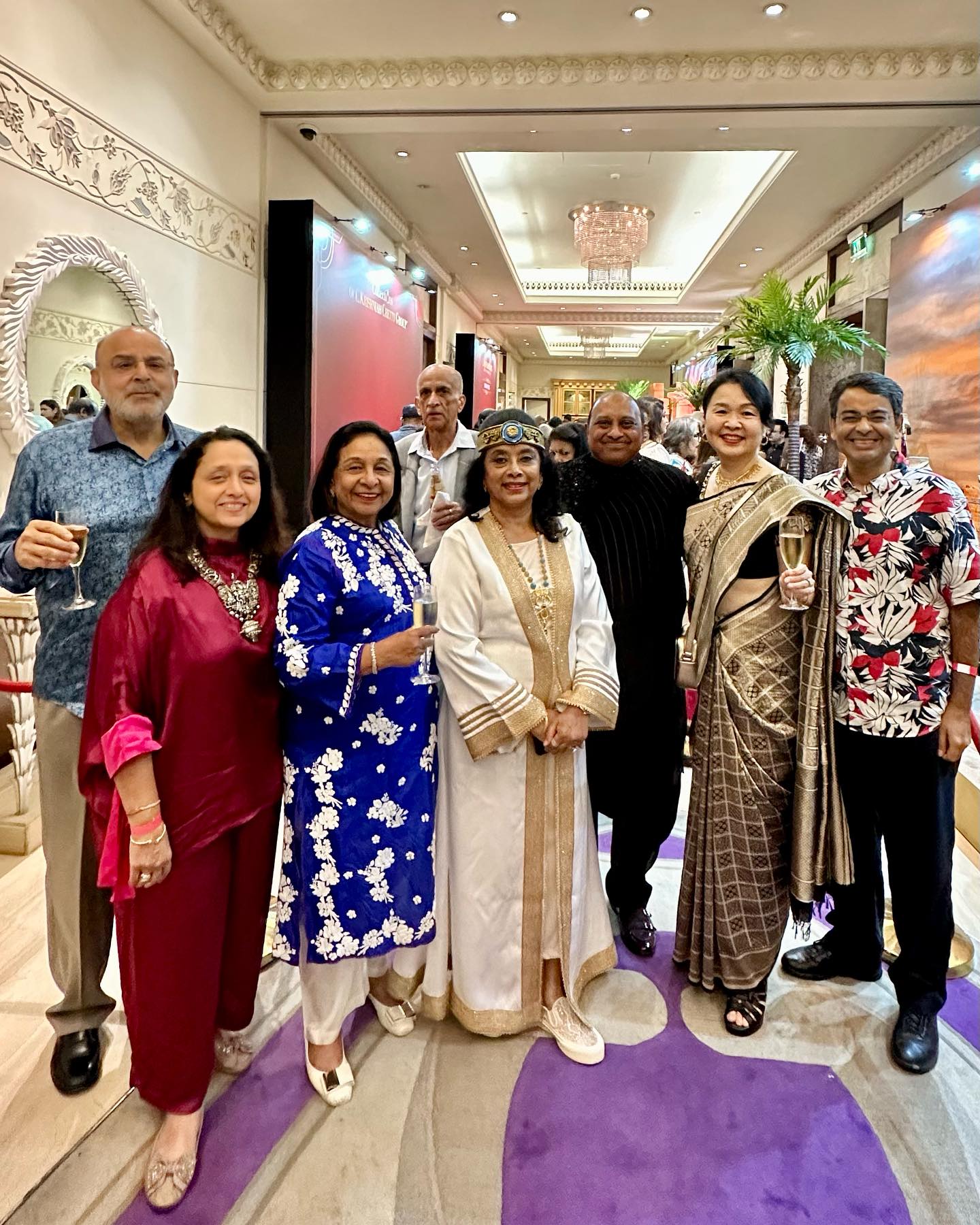 インドとエジプトのテイストには共通項が多く、ジュエリーもファッションも違和感なく同化する。ホールにて、グラス片手にしばしソーシャルタイムを楽しんだあと、バンケットルームへ。