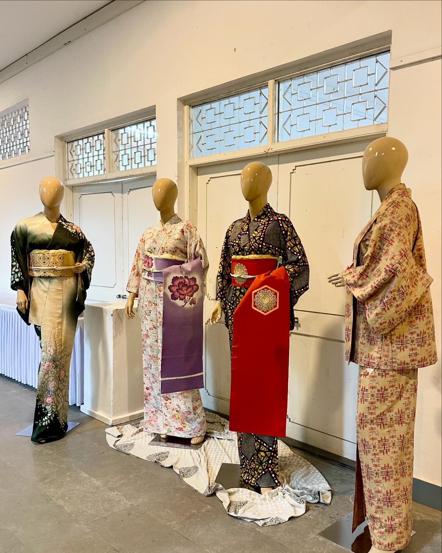 昨日の午後、マネキン・ガールズ4名と会場入り。IKEAの巨大な青いバッグが役に立つ。パッと見、物騒。着物や帯、スタンドその他を搬入してセッティング。写真で見る限り、爽やかな情景だが、結構な混沌であった。