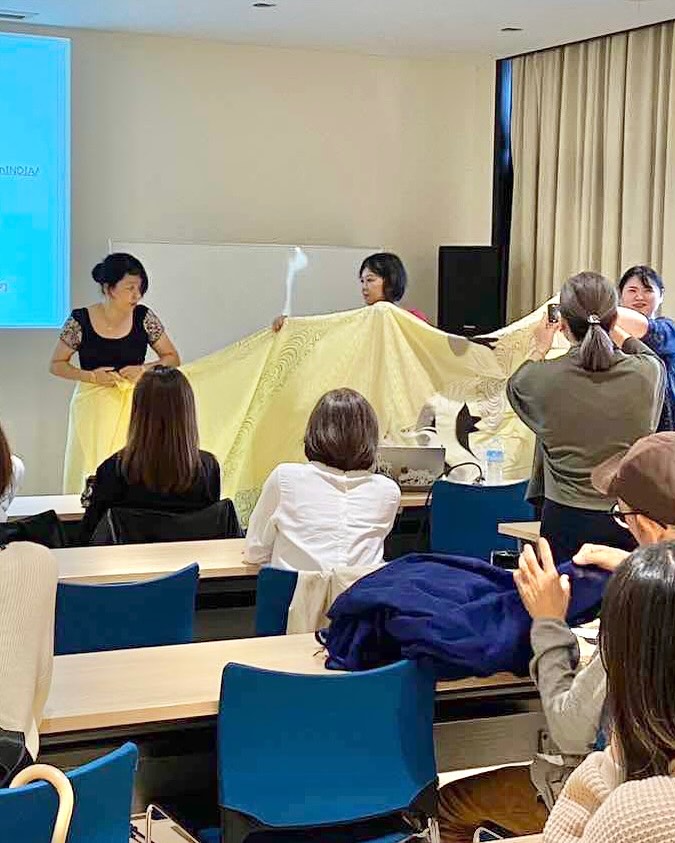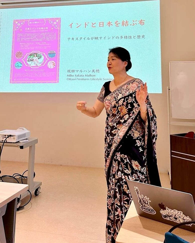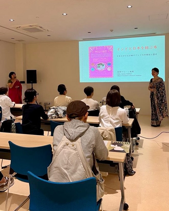 会場が使えるぎりぎりまで2時間弱、毎度のごとく、熱く語る。自己紹介に始まり、インドの多様性や地理的な基本情報、シルクロードを経て日本にもたらされた布の歴史、明治時代に日印貿易の契機となった綿、インド独立運動と手紡ぎ手織り布との関係など……を、極力わかりやすく説明。その後、具体的に、インド各地のさまざまなテキスタイルの歴史や特徴などを、豊富な写真をもとに説明する。