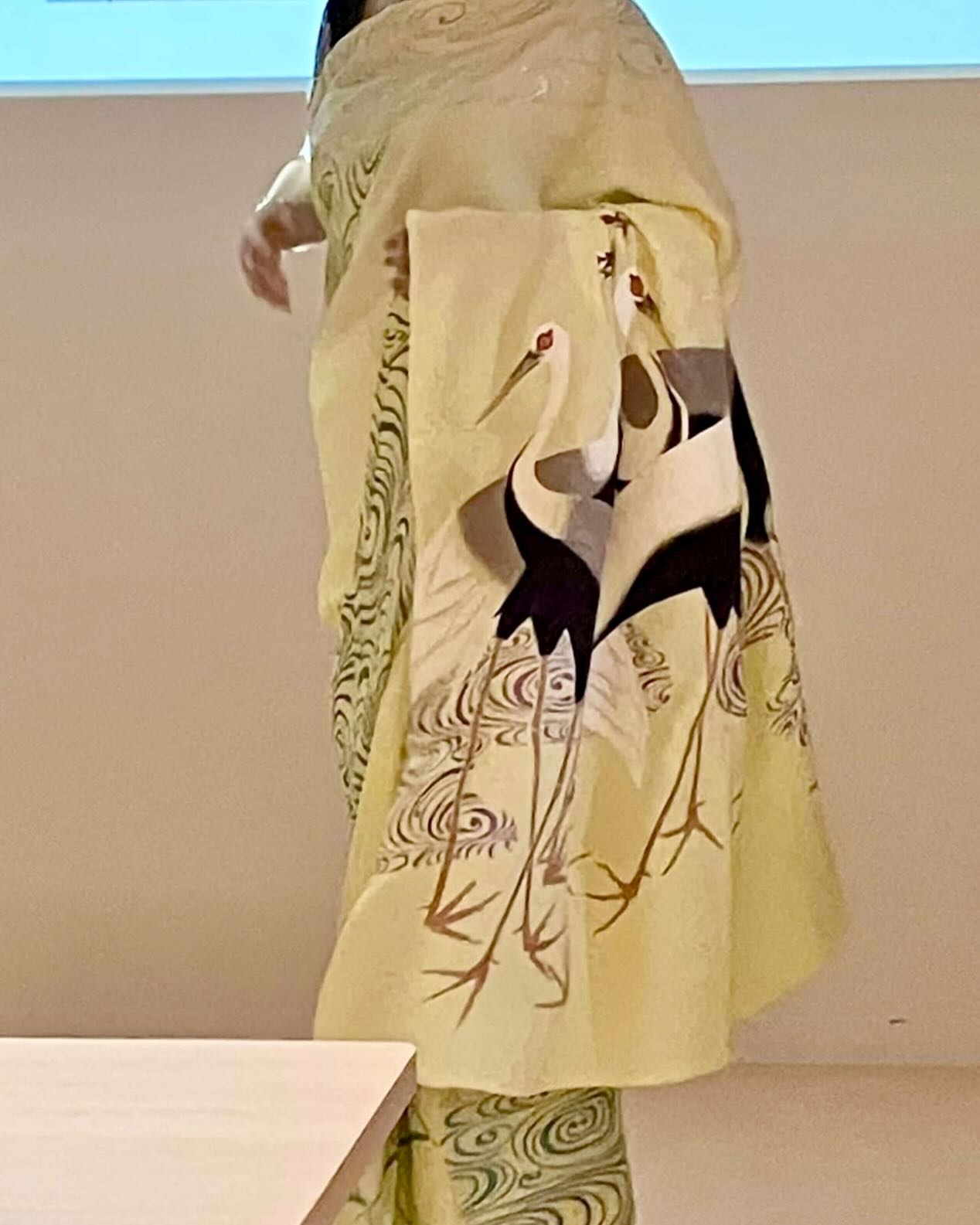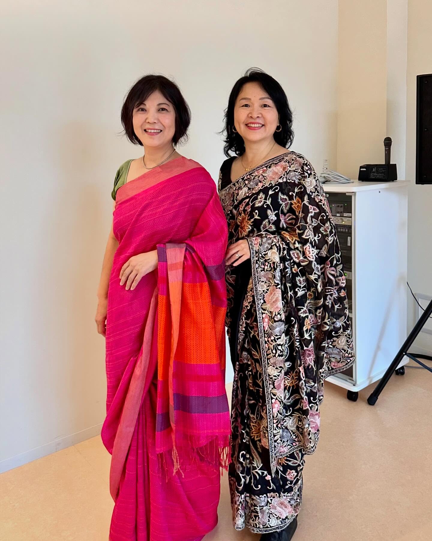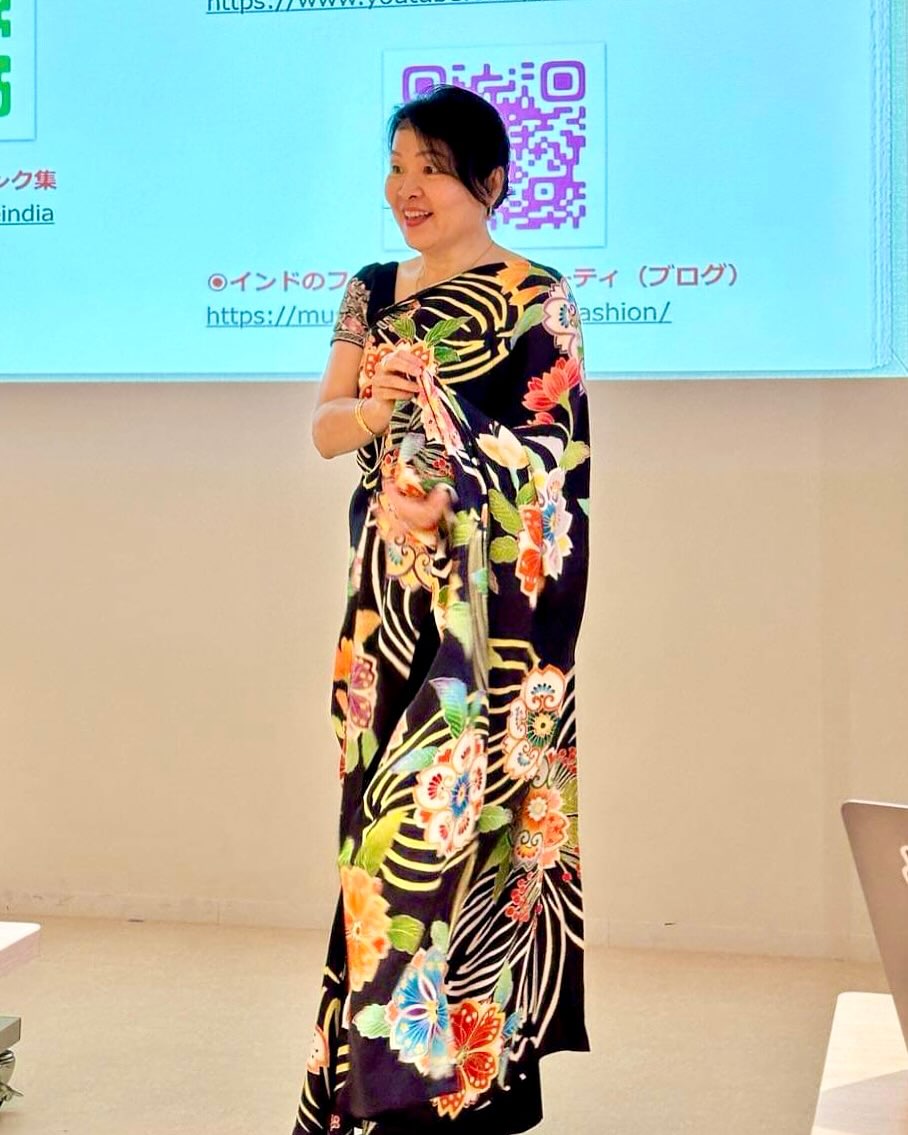 持参したインドのサリーの1枚は美砂さんに着付けたほか、何枚かを直接、手にとって見てもらう。また京友禅サリーも広げ、その美しさを見ていただく。