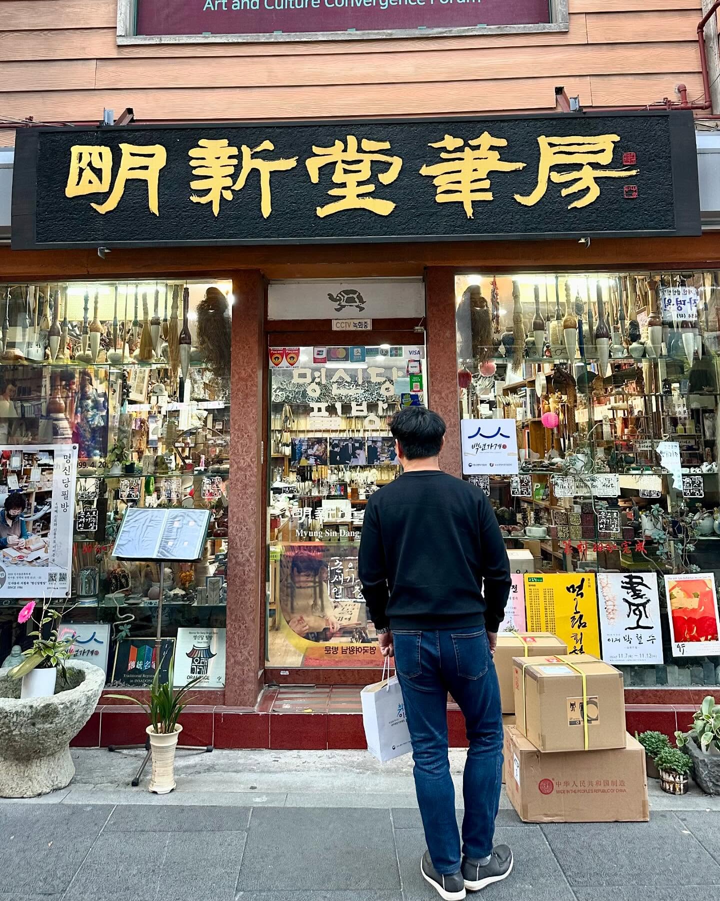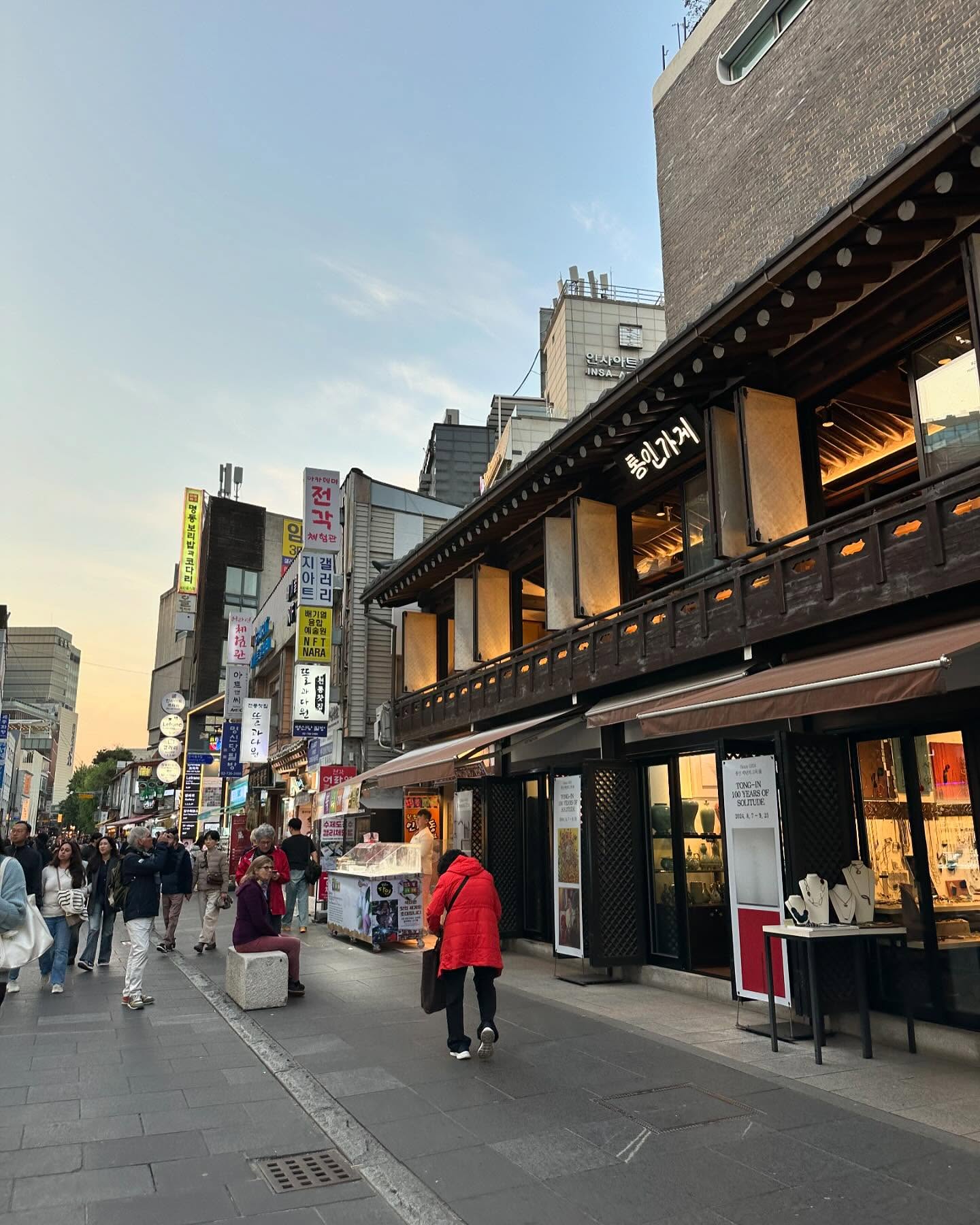 季節外れの好天に恵まれてはいたものの、ソウルもまた、暦は晩秋。陽が暮れるのは早く、午後3時を回ったころには、すでに夕暮れの気配だ。日没前にできるだけ、街の情景を脳裏に刻んでおきたく、仁寺道ギル(道)を歩く。ここは昔ながらの骨董品店や茶具店、陶磁器店などと、現代的なブティックやアートギャラリー、飲食店などが混在して調和する、魅力的な通りだった。
