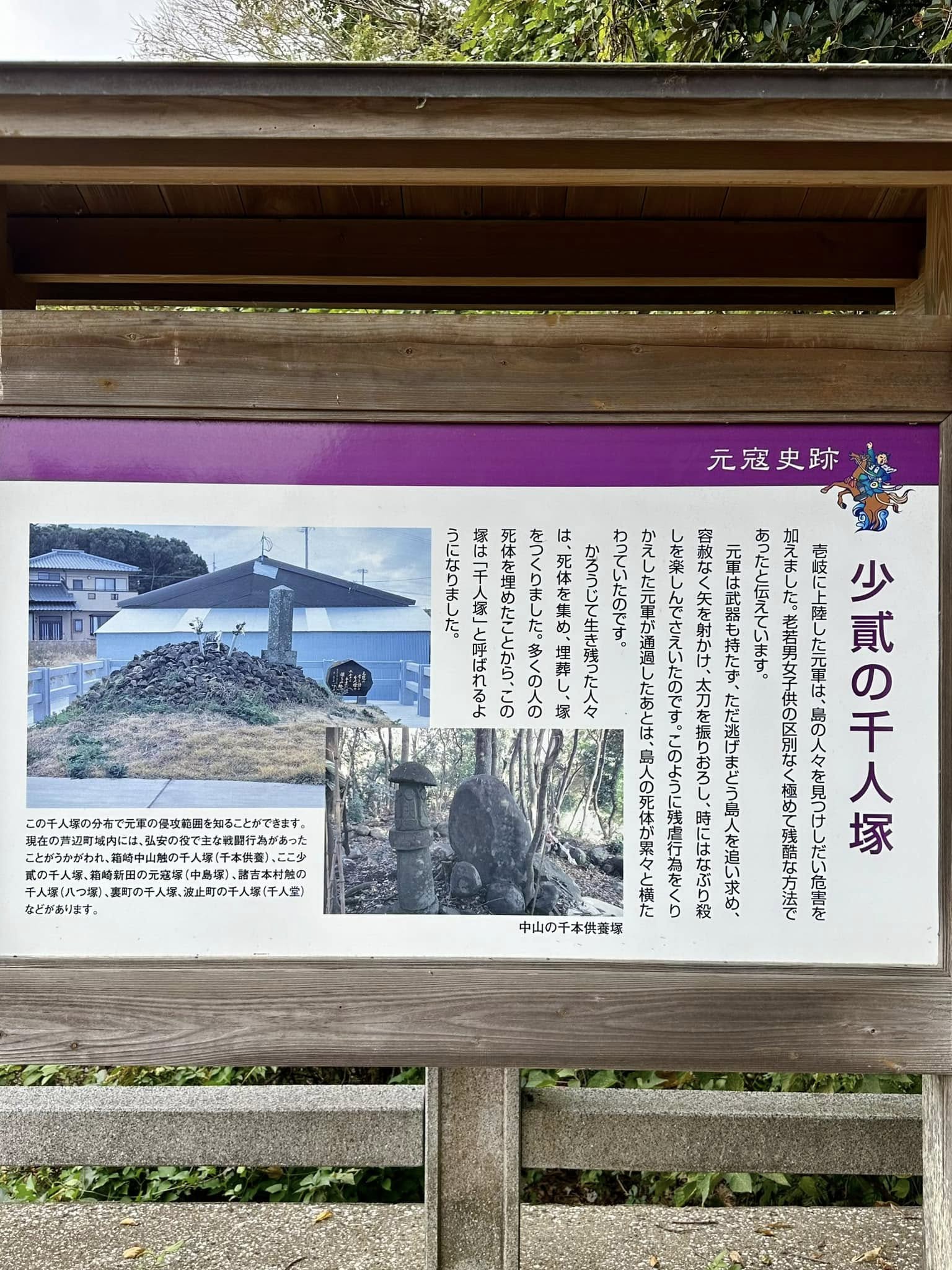 元寇の際には、この島が前線、フロントラインとなった。多くの島民たちが非業の死を遂げたこともあり、関わる史跡が多々、残されている。元寇は、日本史にとって重要な出来事だと思うので、概要だけでも、ウィキペディアの記載ではあるが、わかりやすいので転載する。