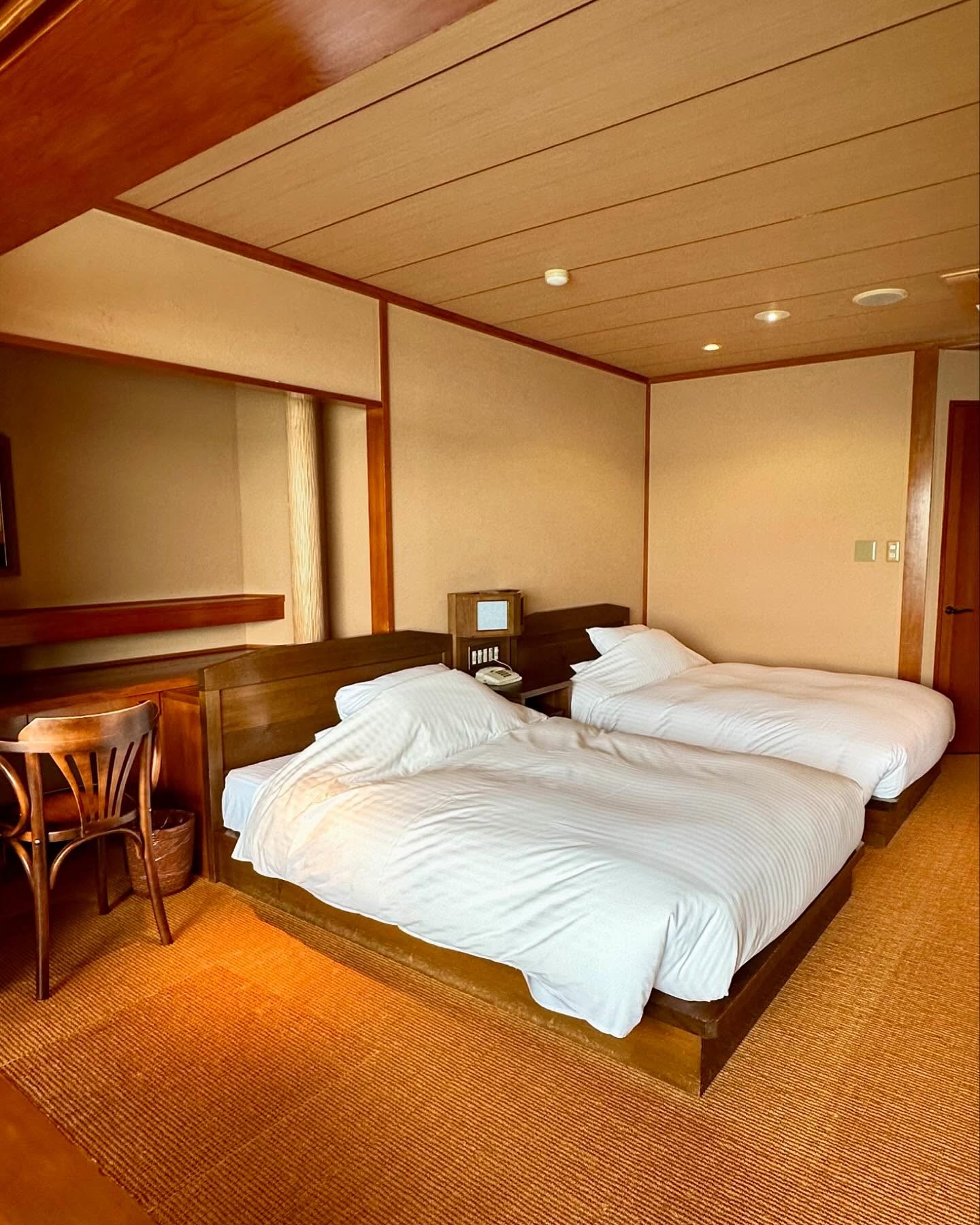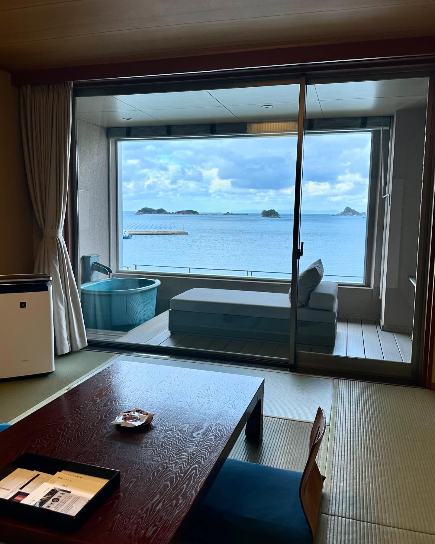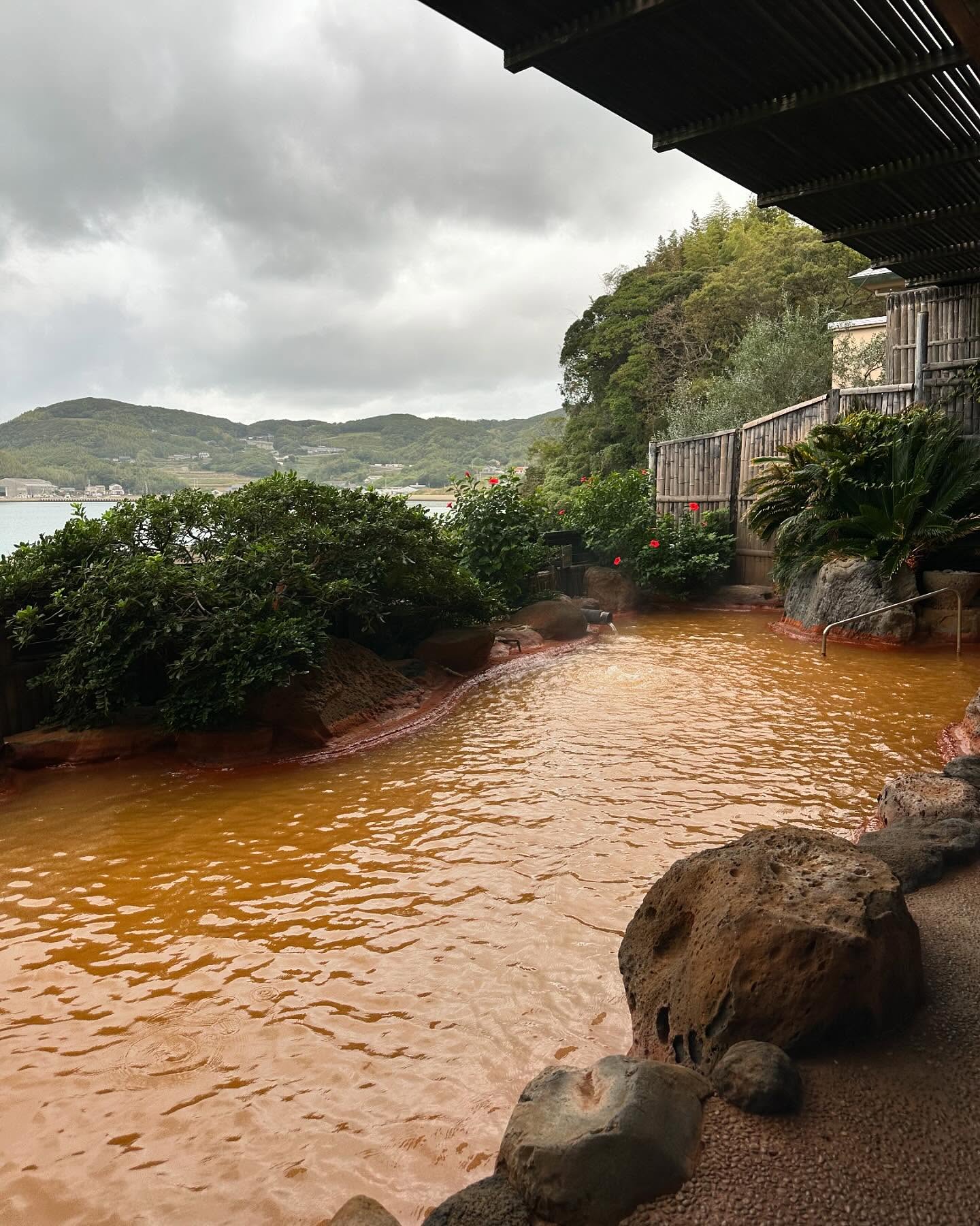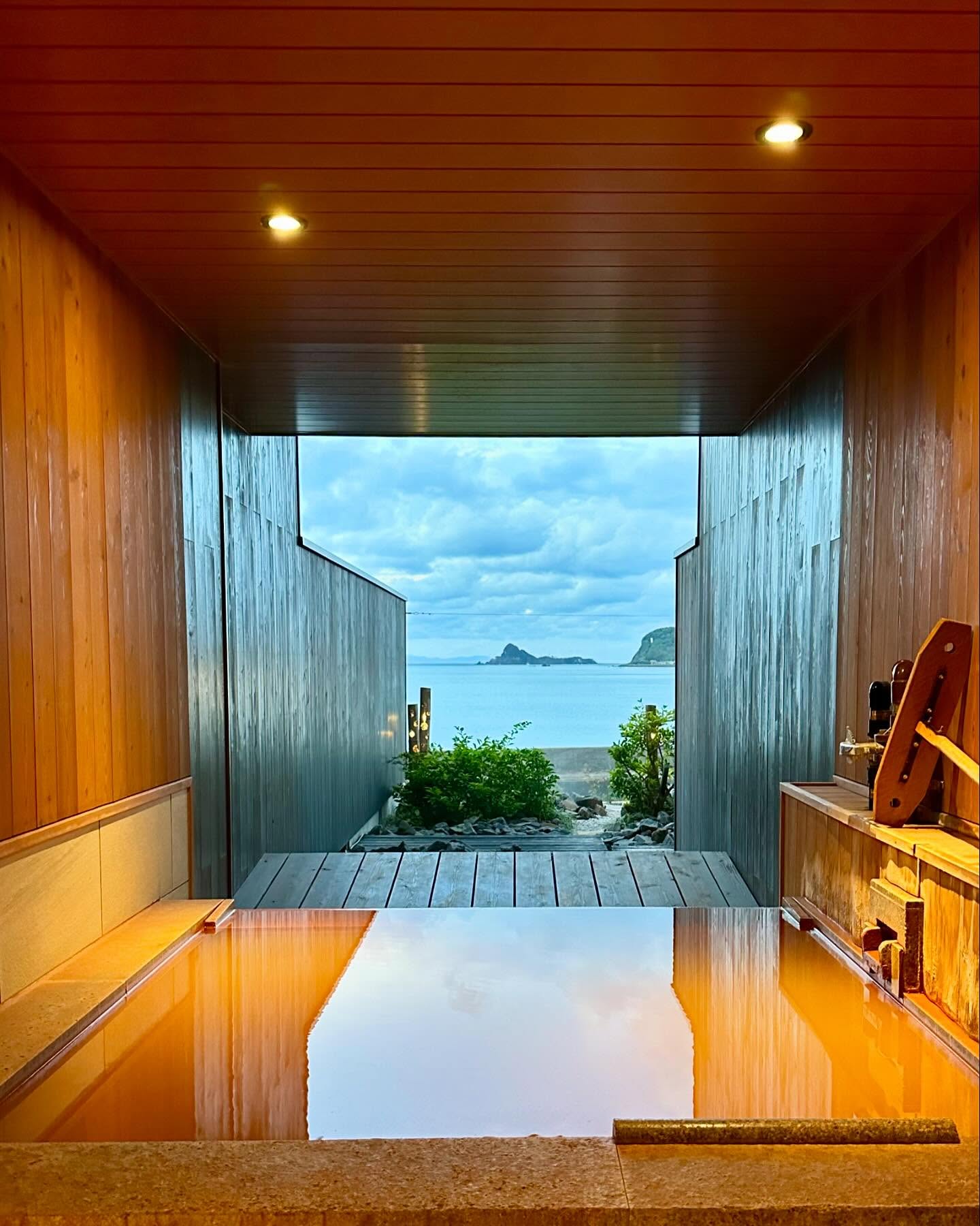 全室が海に面したオーシャンヴュー。かつての2室を1室にし、客室数はわずか12。ゆえに、静かでゆったりとした空間が育まれている。部屋には水平線を望む露天風呂もあり、平山旅館と同じ、黄金色の効能豊かな水が豊かに流れ込む。