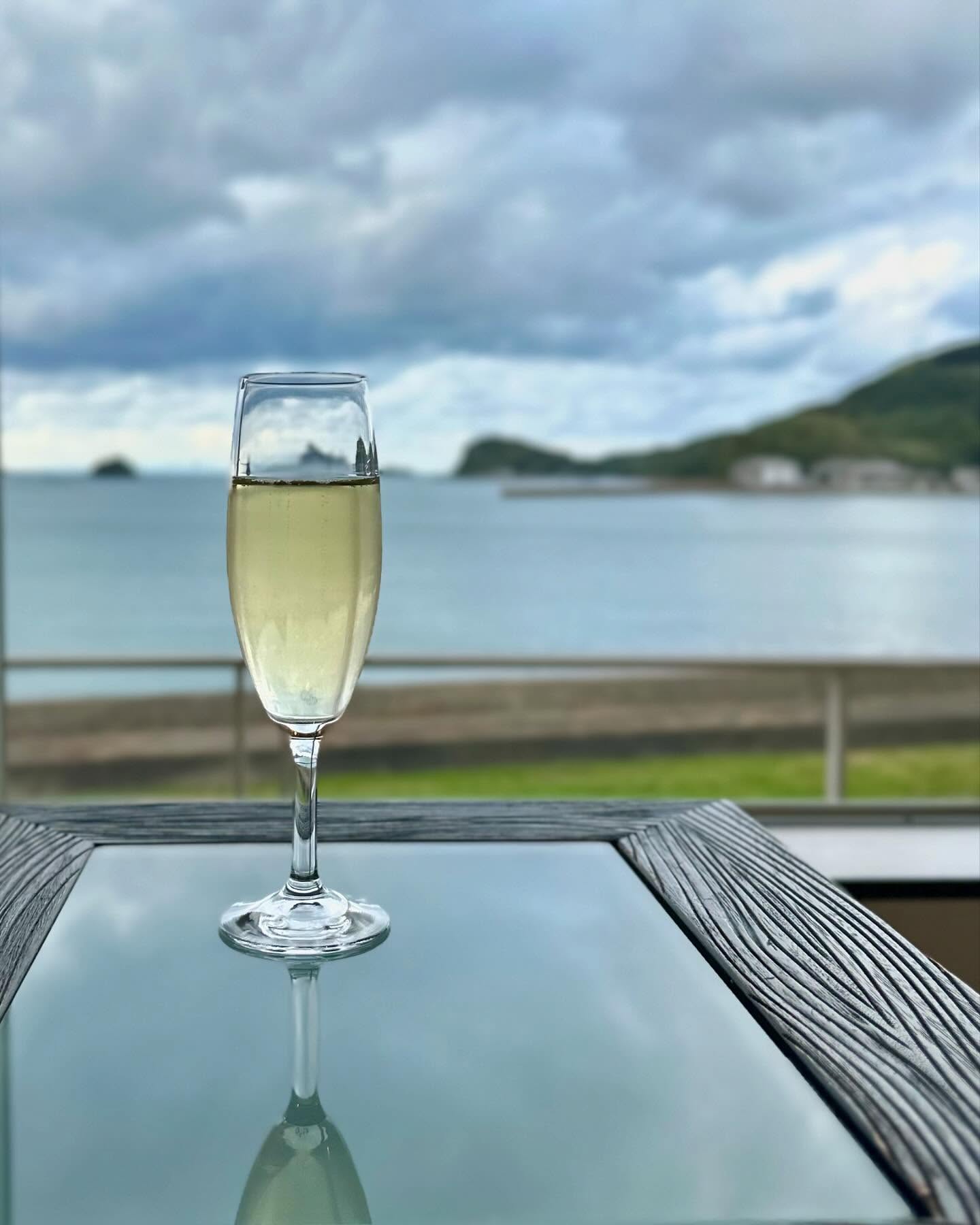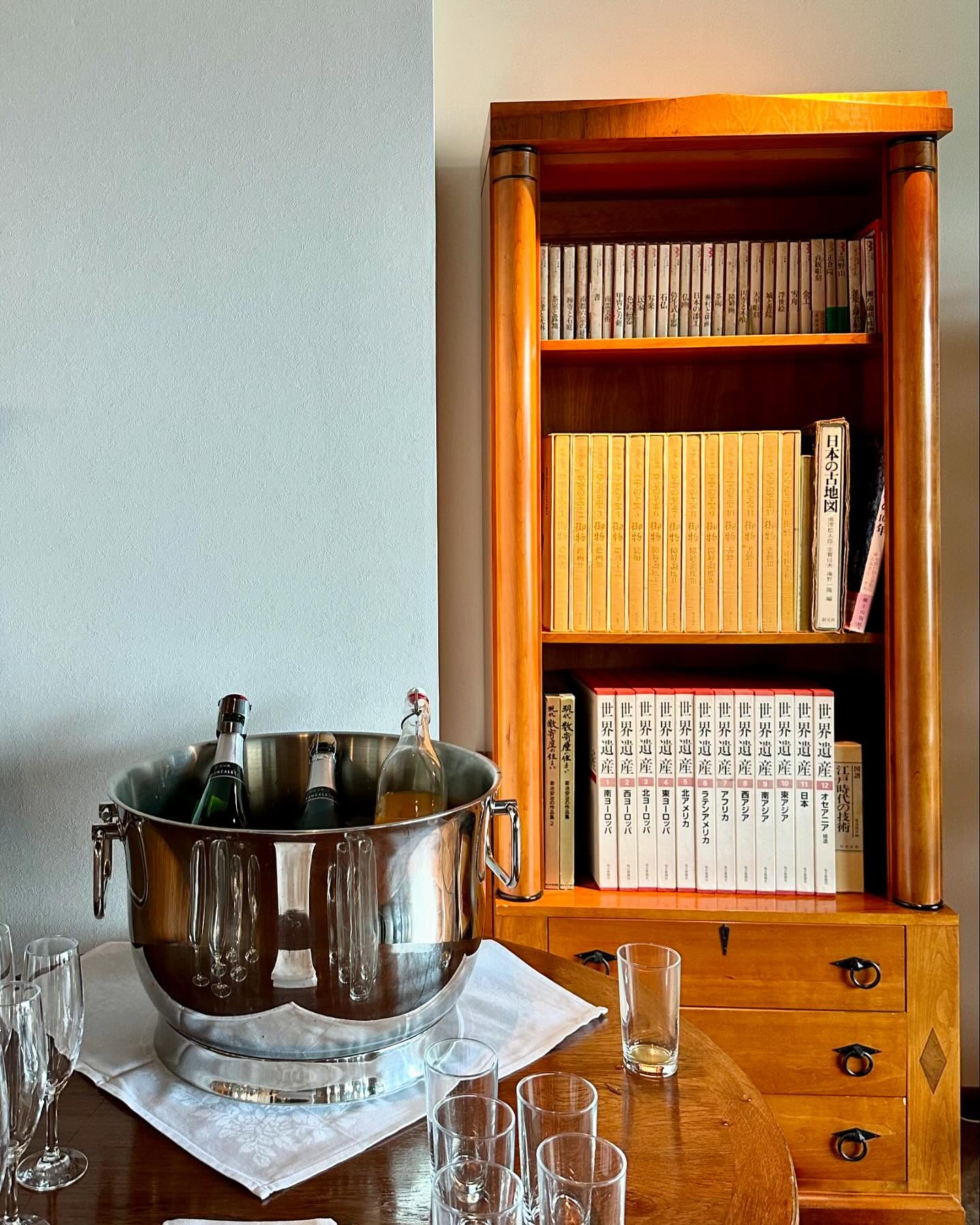 プライヴェート温泉からの景観もまた見事だった。薄暮の空を眺めながらの入浴。身体が温まったあと、バー&ライブラリーで雑誌をめくりながらスパークリングワインのグラスを傾けるも、至福の極み……。