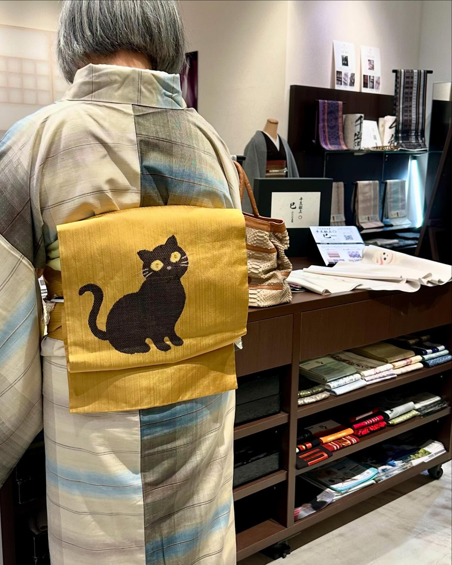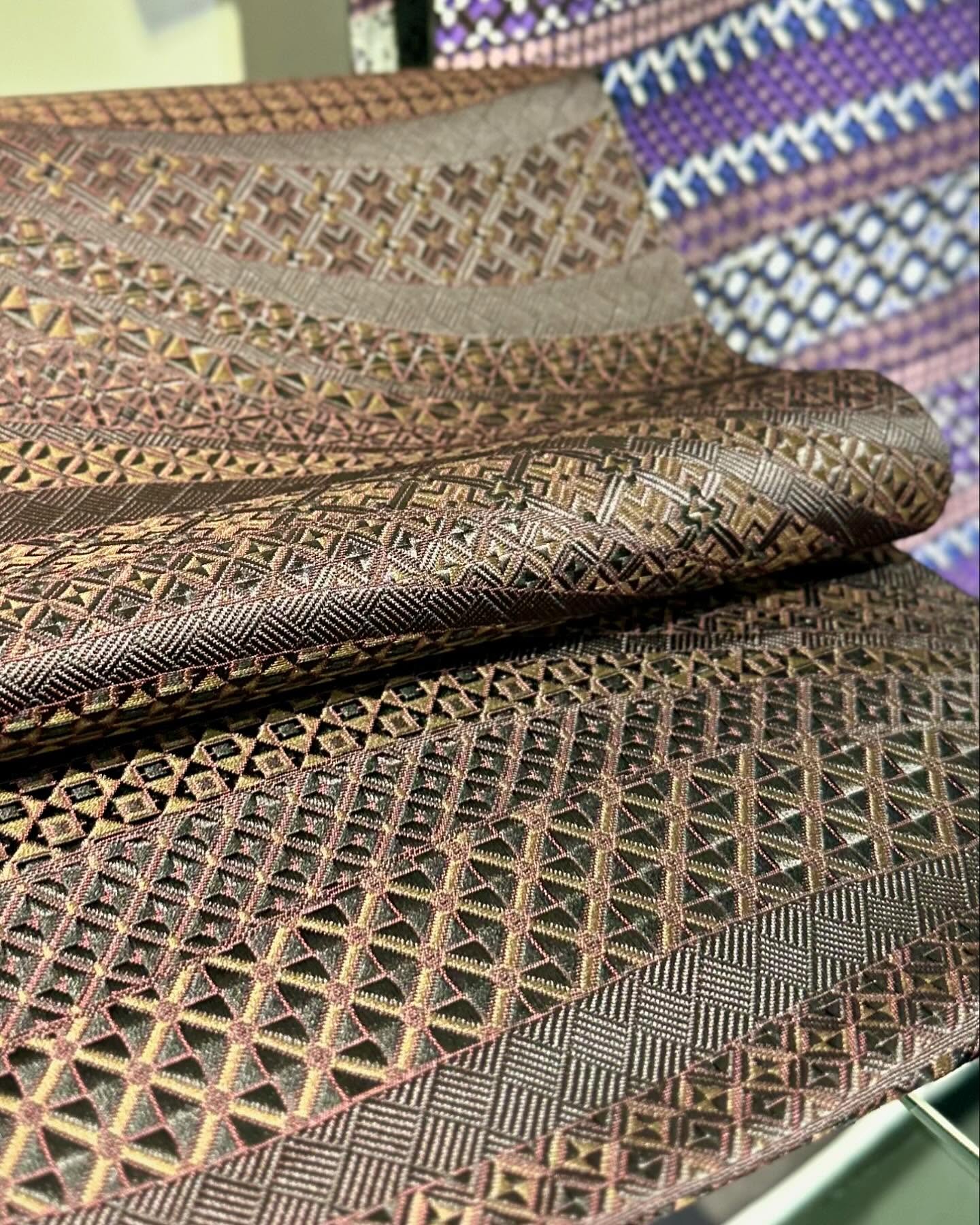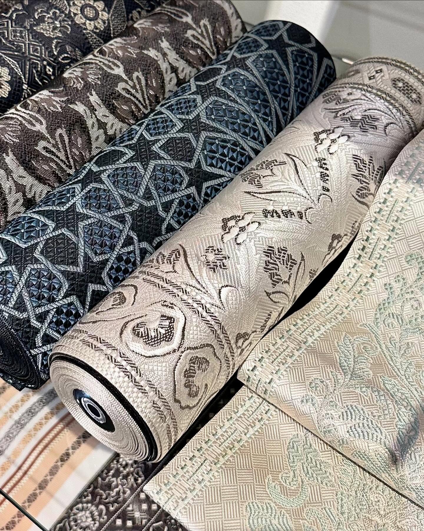 店頭に並ぶ帯……だけでなく反物の、その自由な織と精緻な仕上がりのすばらしさ! 博多織がこんなにも豊かな織物だったとは知らなかった。わたしが着物世界に関心を持ち始めてちょうど1年。その深淵に、気が遠くなるような思いだ。博多織の世界にも、引き込まれる。故郷にぐいぐい、引き摺り込まれる。許可を得て撮影させていただいた。その美の片鱗をシェア。