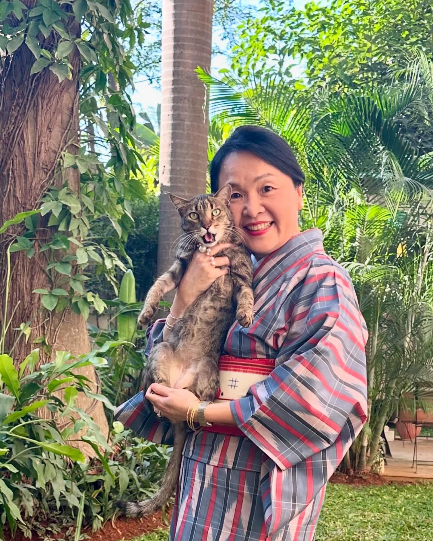 竹久夢二の絵みたいに、猫と一緒に映りたかったが、我が家の猫ズは抱っこされるのが嫌いなので大暴れ。ちょっとぐらい、いいや〜ん! となだめつつ撮影。ごめんよJACK。