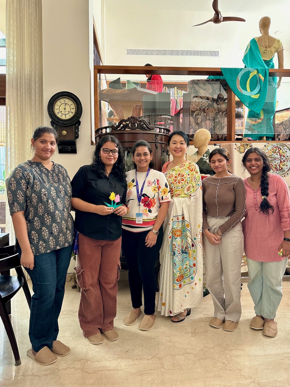 初日の昨日は、オープン早々、ファッションデザインスクール(The Army institute of fashion and design)の学生ら40名が来訪した。先日MAP (Museum of Art & Photography)で開催されたテキスタイルのシンポジウムを訪れた際、同校の学生が参加していたのだが、そのなかの一人が日本語を学んでいるということで、浴衣姿のわたしに声をかけてくれた。