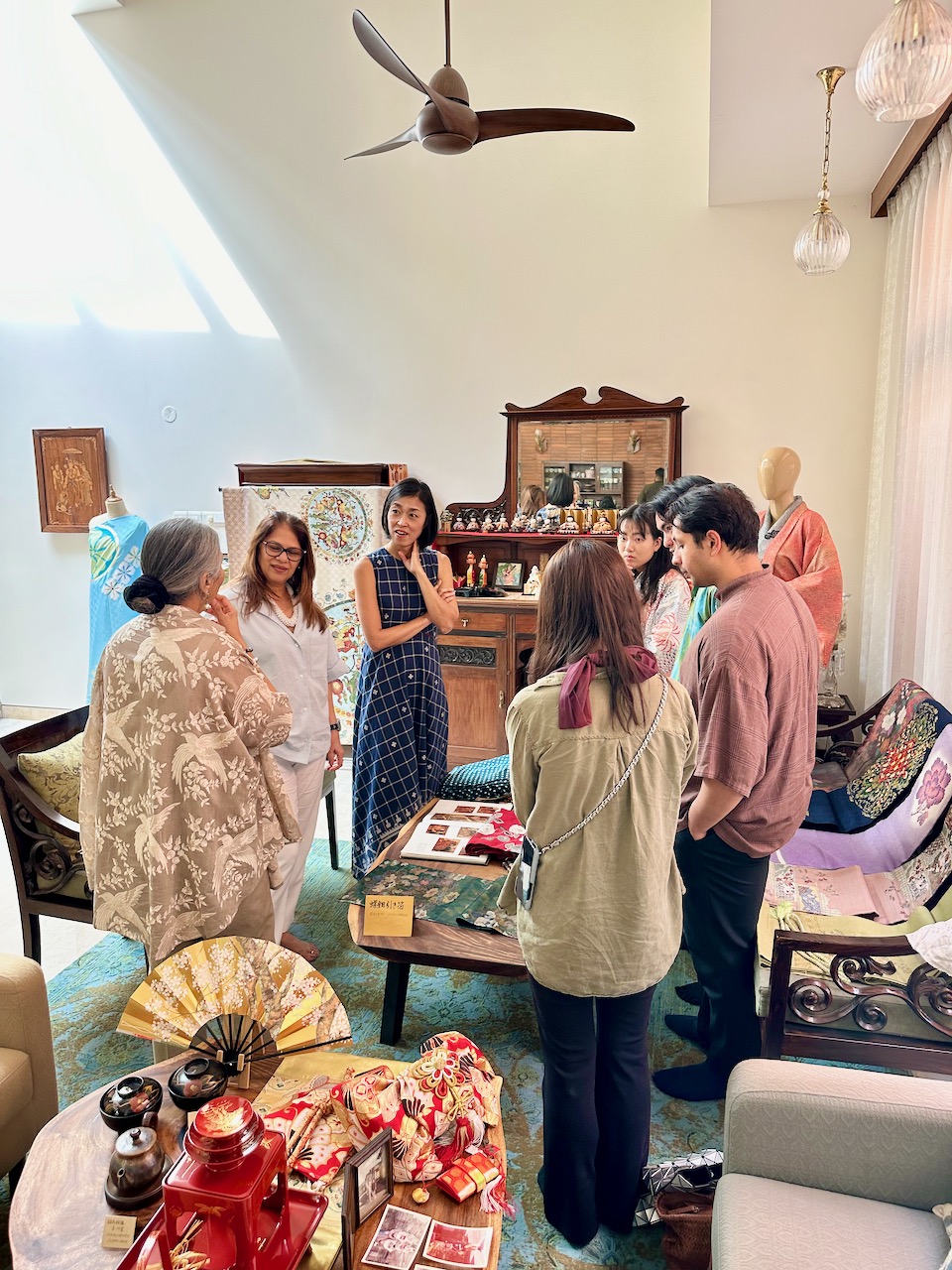 しかし季節は秋。浴衣はない。たまたま立ち寄った新天町の中古着物店で、見事な職人技の着物や帯が二束三文で売られているのを見て驚嘆する。その日、数枚を購入し実家へ帰宅。その後、実家のクローゼットにて半世紀以上も眠っていた母の「ほぼ未着用」の着物や帯を発見! それらをすべてインドに送って、2023年師走、自宅で『着物とサリーの比較展示会』をしたのが端緒だった。