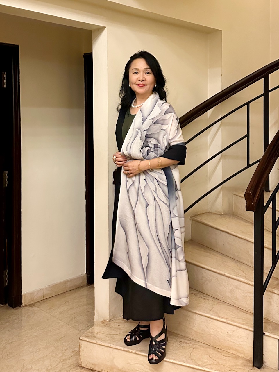 着物かサリーを着ていくつもりだったが、着替えるのが面倒だ。そこで閃き取り出すは、京友禅の大判ストール。黒地に牡丹の、ダイナミックな柄がとても気に入っている一枚だ。