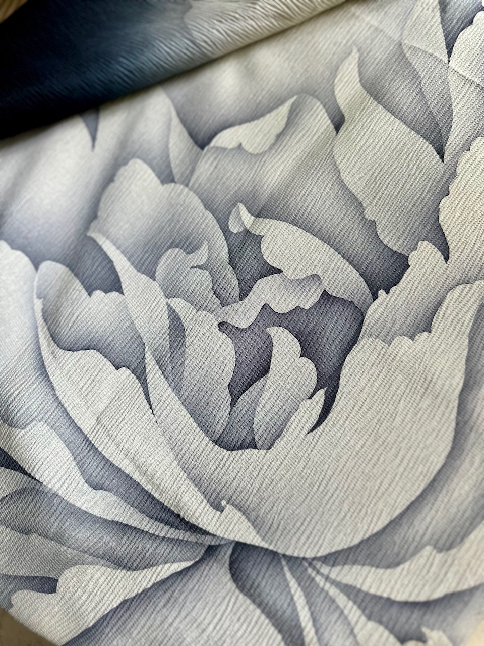 一方、この大判ストールは、同じ丹後縮緬の正絹でも異なる質感。光沢はなくマットで、ふわふわと軽くて扱いやすい。
