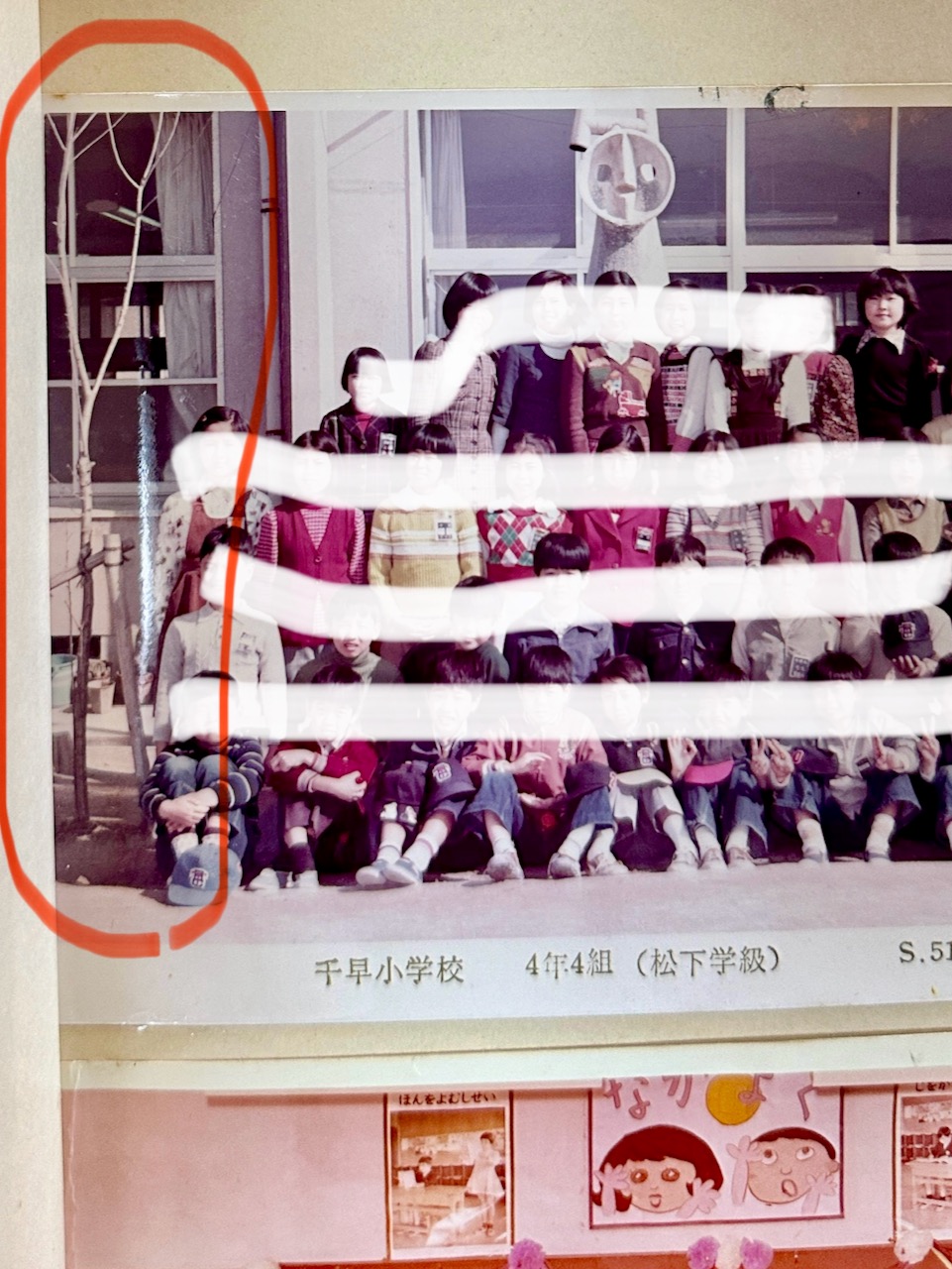 ページをめくれば……見つけた! 小学4年生の時のクラス写真。太陽の塔の前で撮っている。左端に、植樹後まもない、細い桜の木が写っているではないか!!
