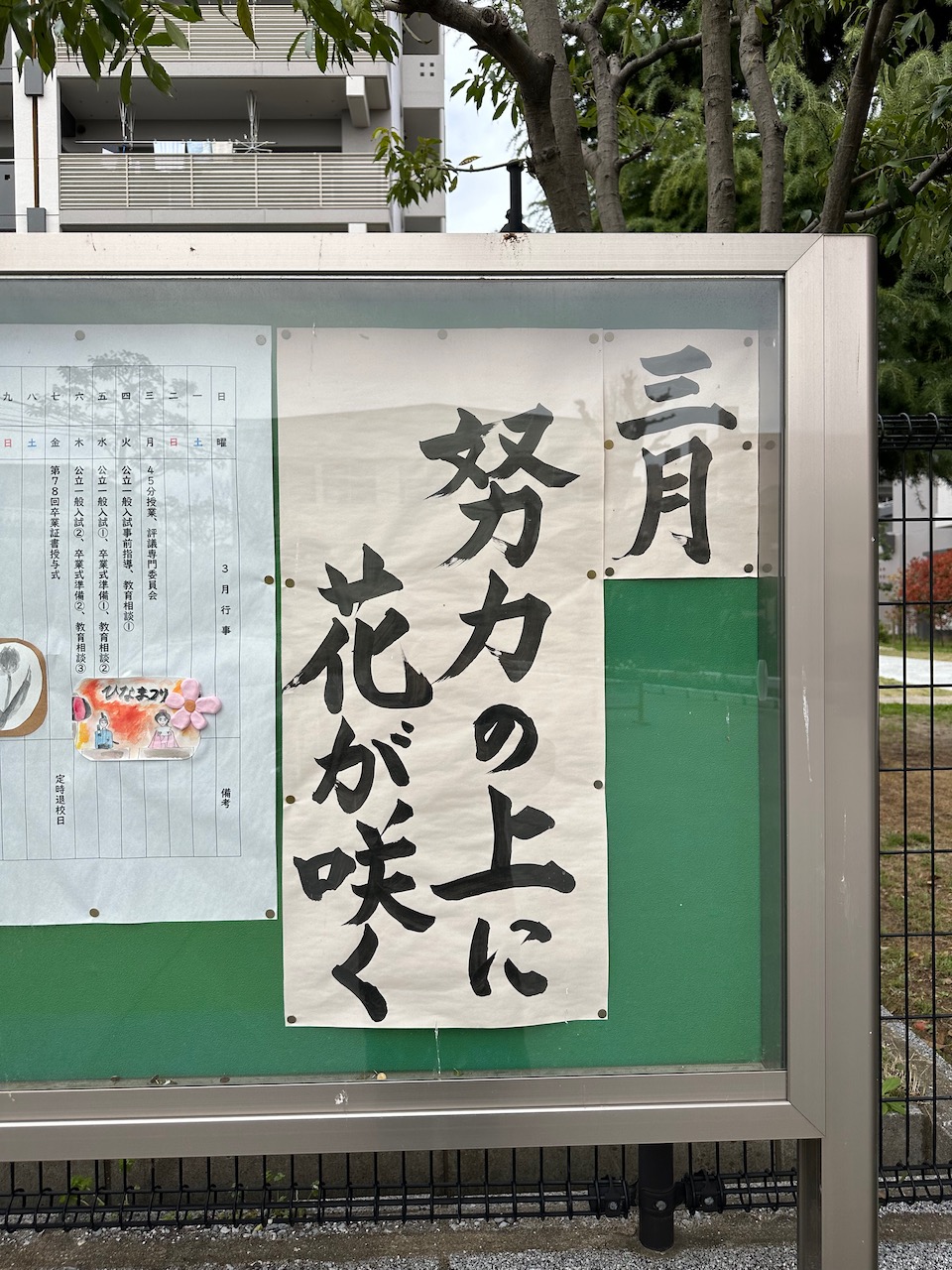 千早小学校を出て、隣接する香椎第一中学校へ。ここには、中学1年の2学期まで通った。入り口に「努力の上に花が咲く」のことばが貼られている。