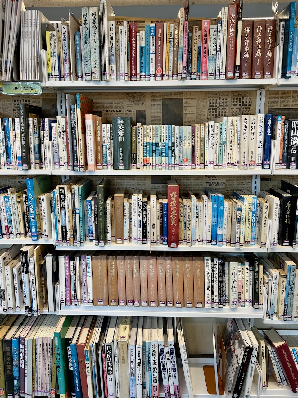 帰路、千早のなみきスクエアの図書館に立ち寄り、郷土のコーナーでしばらく過ごす。背表紙を眺めて愉し。