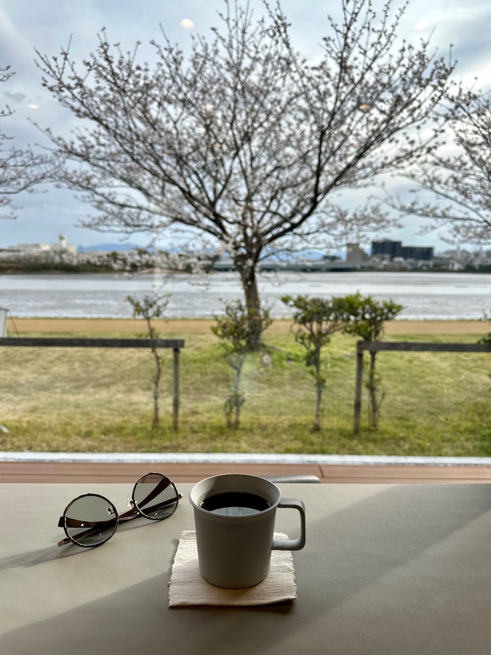 家に戻る前、入口を通過して、多々良川の河川敷まで足を伸ばした。そして、河畔のカフェ”minamo”で、コーヒーを飲む。