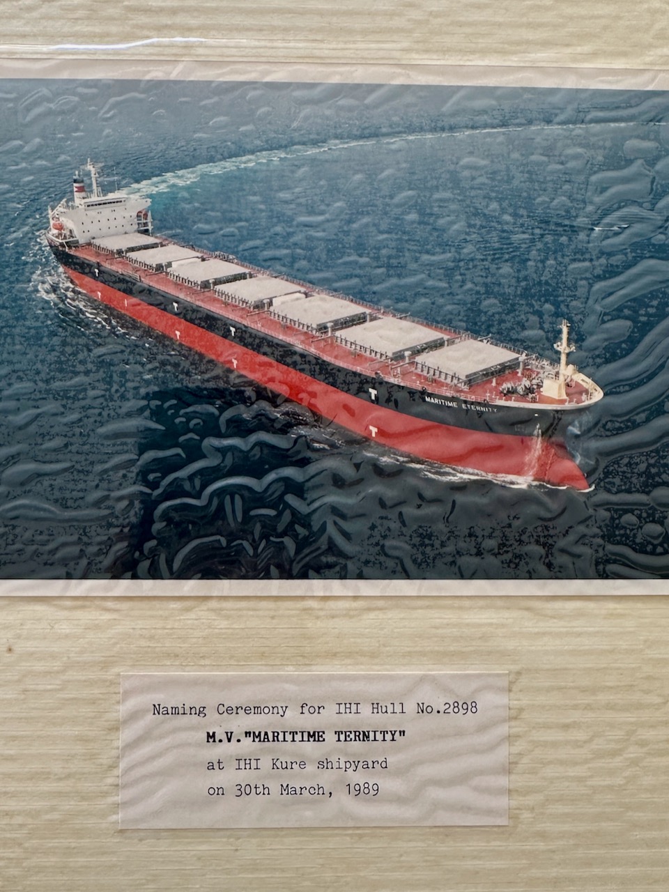 Miraが、広島の呉港で撮影された写真がまとめられた1989年のアルバムを見せてくれた。ハズバンドが造船会社の重役だったとのことで、船の命名式に主賓として招かれたという。Miraが命名者(ゴットマザー)として”MARITIME ETERNITY”と名づけたとのこと。