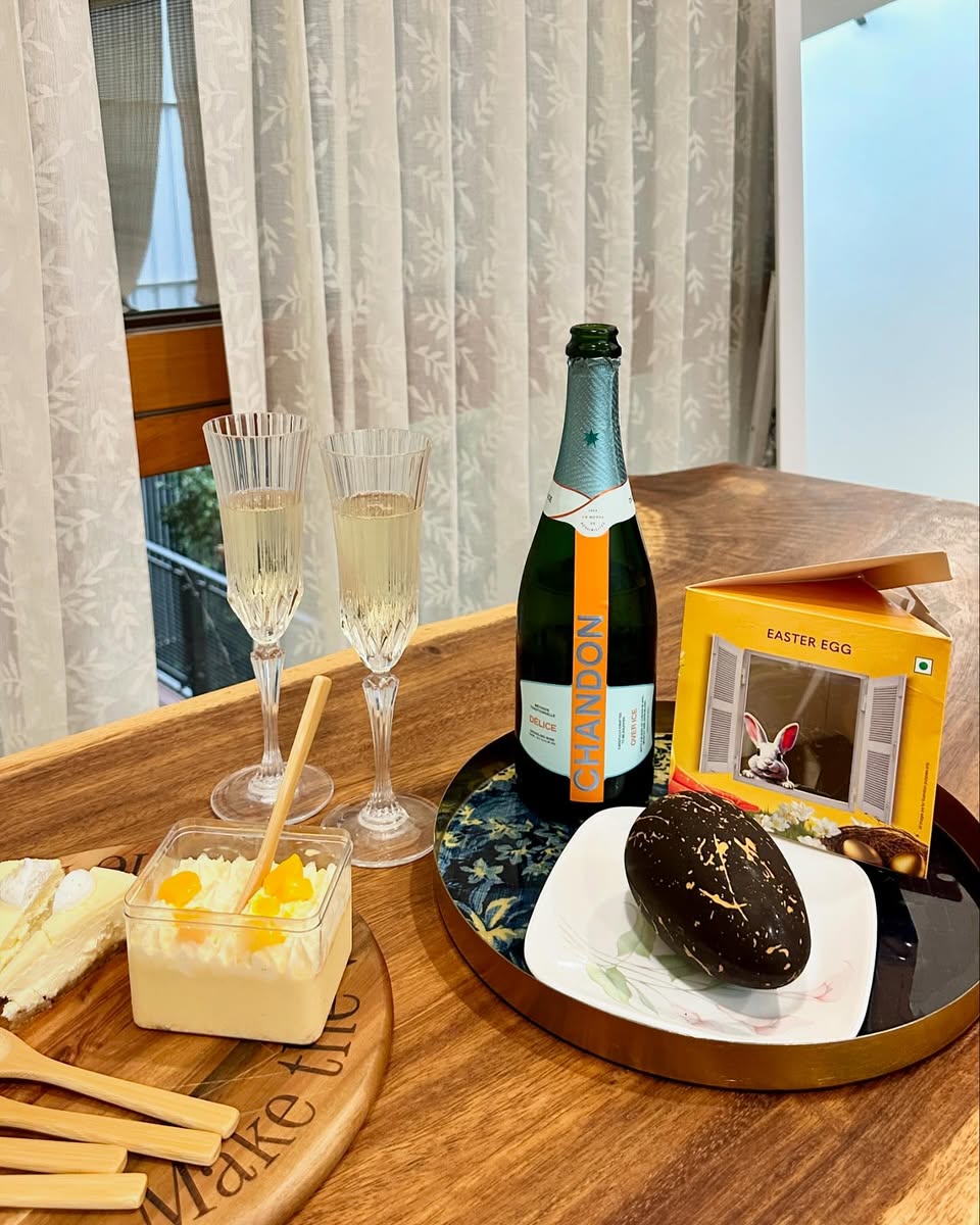 翌朝、マイソールに赴かれる以外、特にご予定はないとのこと。さあればと、お土産にいただいたマハラシュトラ州ナシック産CHANDONのDELICEを開ける。チーズなどのおつまみを準備しておくべきだったと思いつつ、SMOORのお気に入りのケーキに加え、イースターエッグをお出しする。