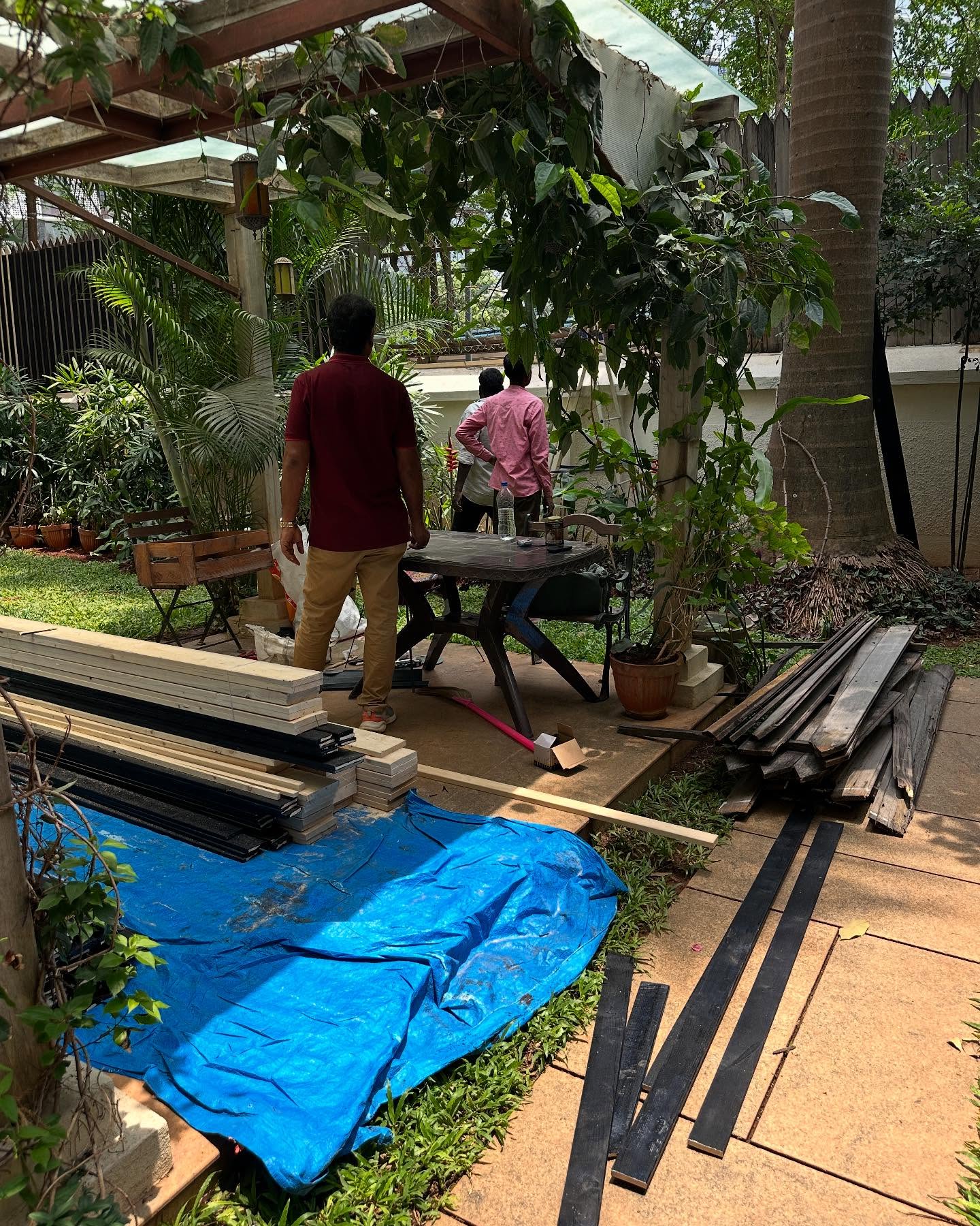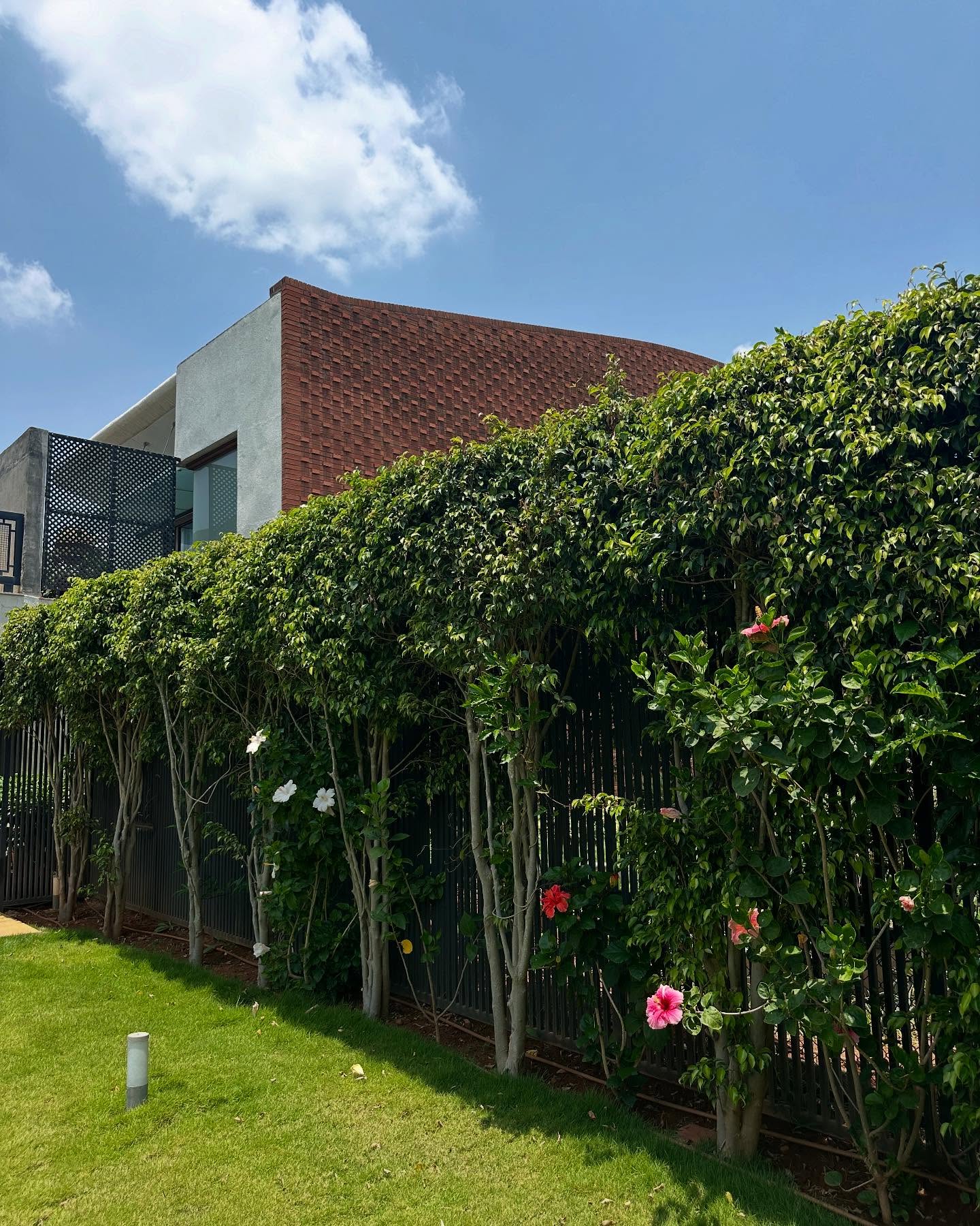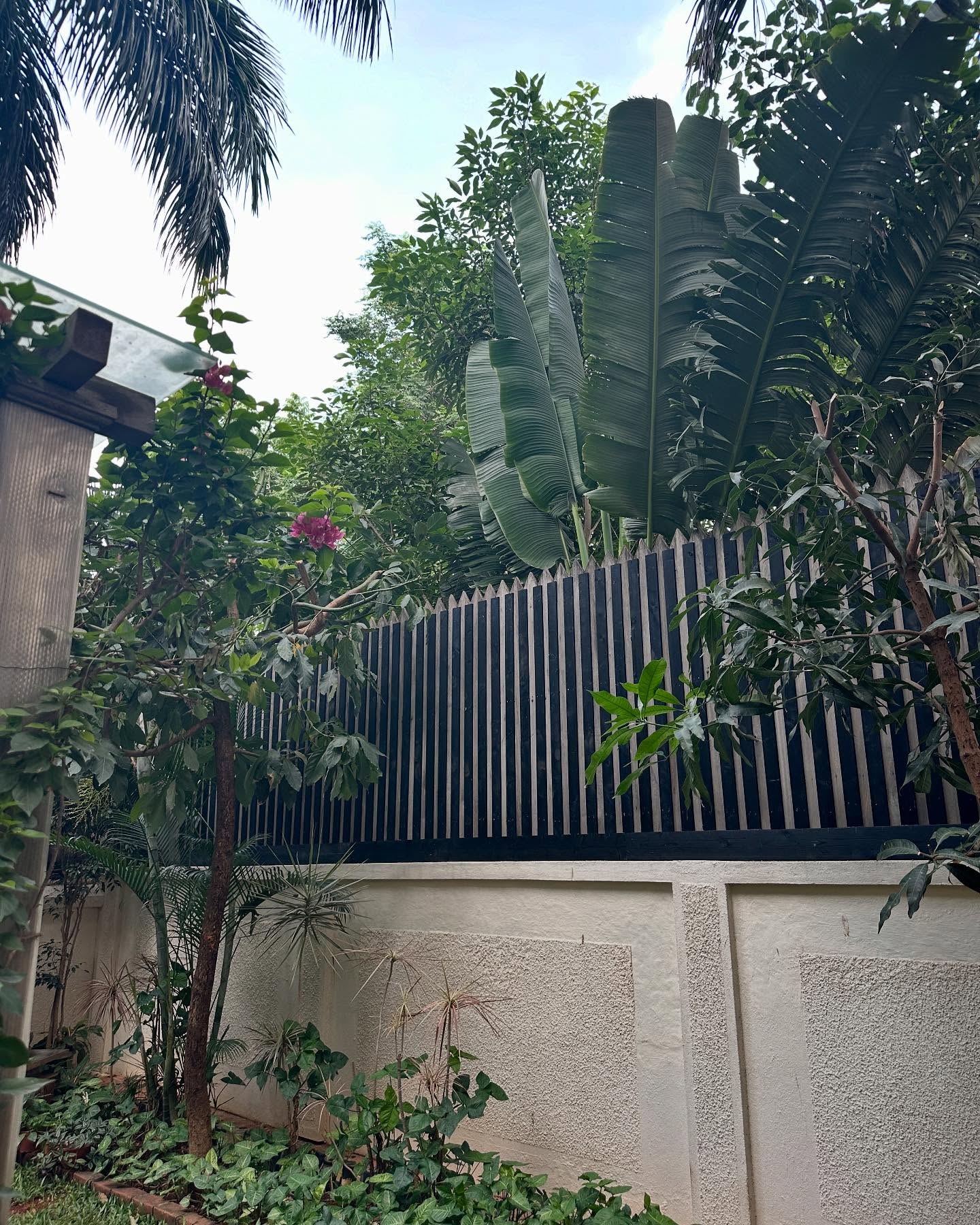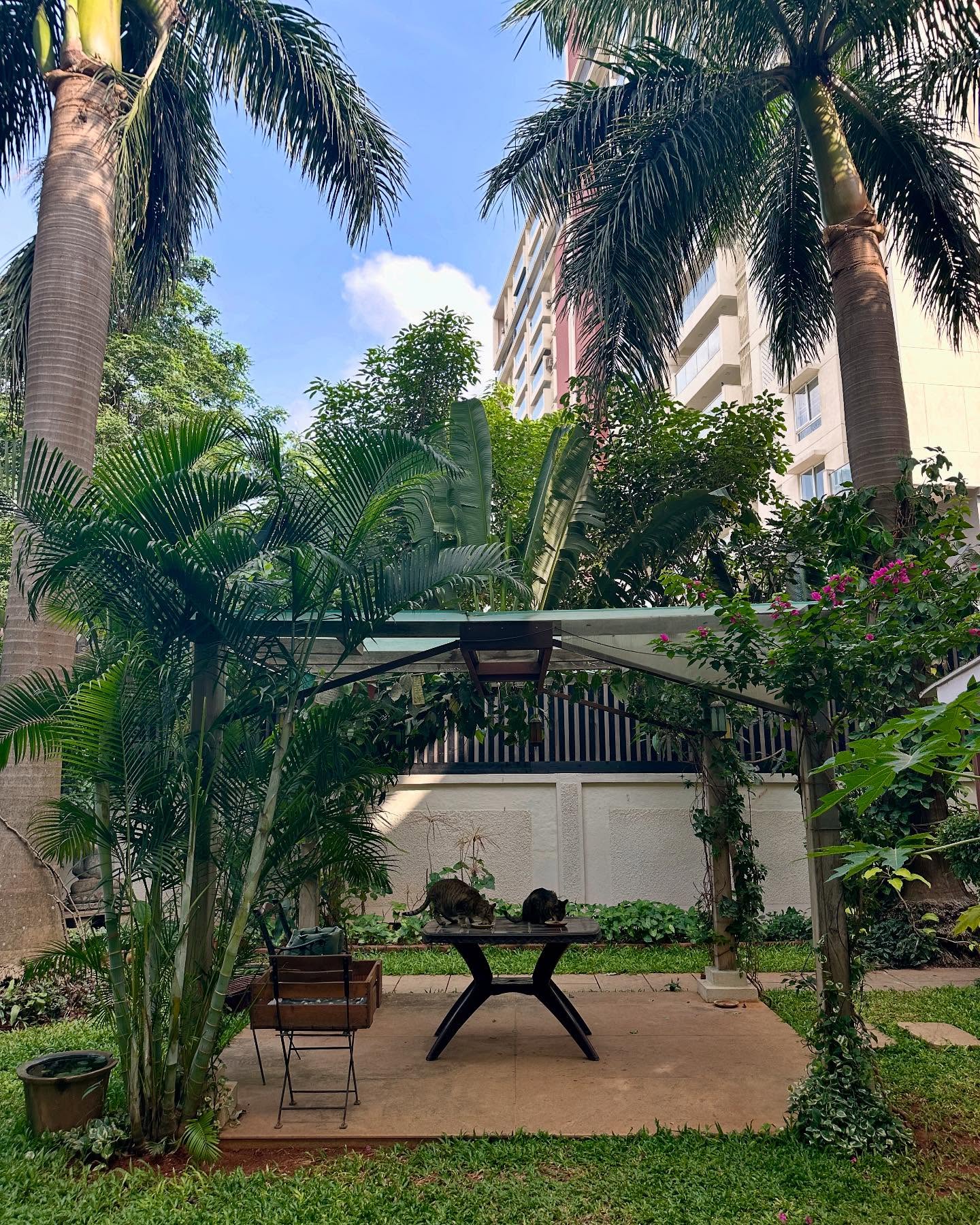 一方で。数年前にアパートメントビルディングとなった隣の敷地。我が家との境界に、わたしの好きな「旅人の木(トラベラーズ・パーム)」を植えてくれてうれしい。塀の向こうに揺れる扇のような葉を眺めつつ、朝な夕なに、庭を歩く。