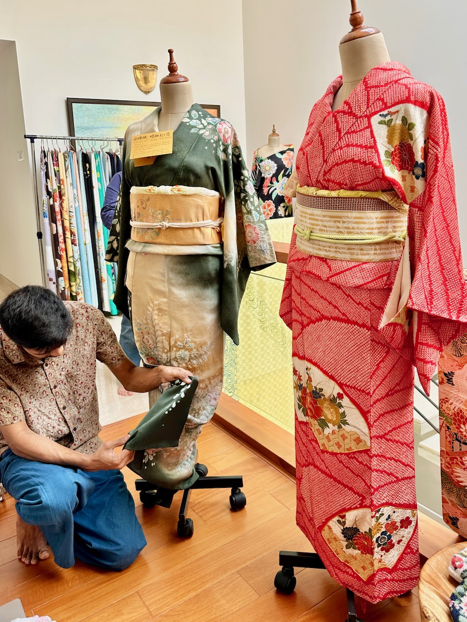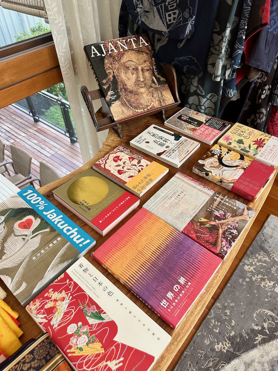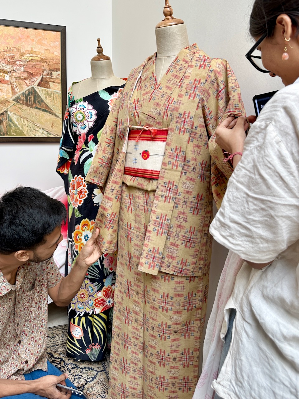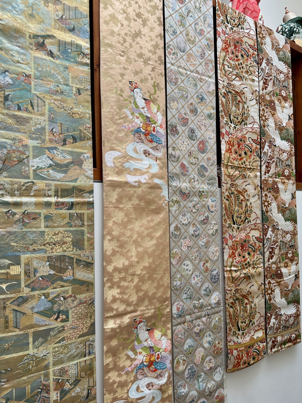 ååŸã¯ãå æ¥èšªåããThe Registry of Sareesã§åãè¥è 4åããæ¥èšªãæ¥æ¬ã®çµ£ïŒãããïŒãå®éã«èŠãããšããããšã ã£ãã®ã§æããæ¬¡ç¬¬ããã£ããã®æ©äŒãªã®ã§ãæ¥æ¬ã®æå·¥èžã®çŸãäœéšããŠæ¬²ããã絣以å€ã®çç©ã矜ç¹ã垯ã京åçŠ ãµãªãŒãªã©ãåŒã£åŒµãåºãããã«ãœãŒã4äœæºåããŠãã£ã¹ãã¬ã€ãæ°ã¥ãã°å±ç€ºäŒç¶æ ã ãè¢åž¯ã®çµã³æ¹ãééã£ãŠãããšæãããã容赊ãã