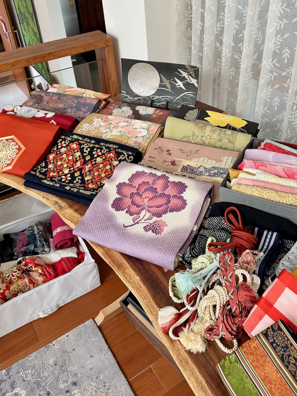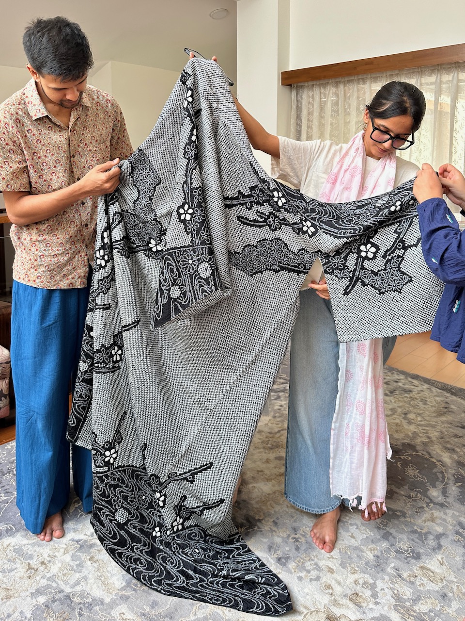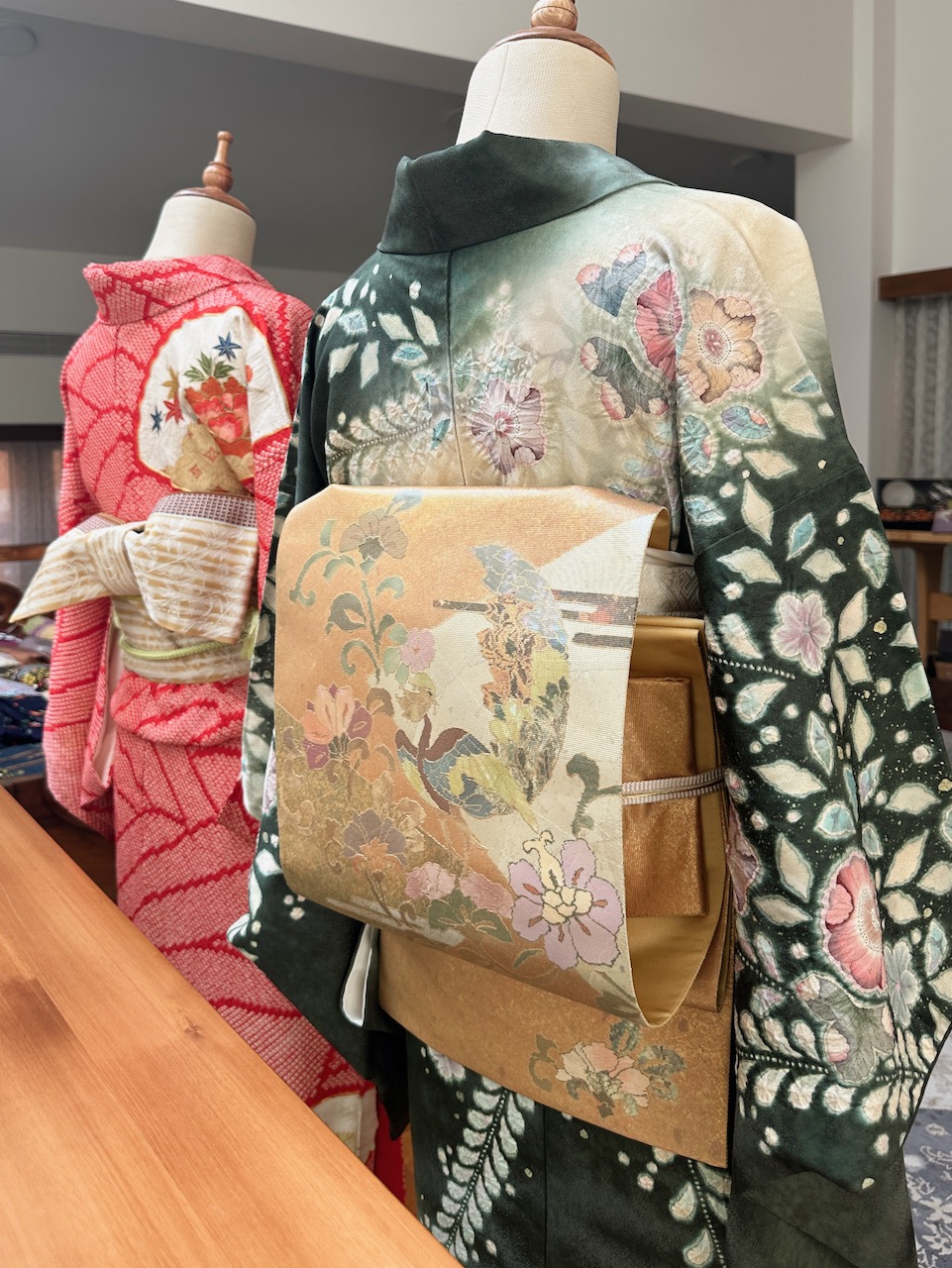ååŸã¯ãå æ¥èšªåããThe Registry of Sareesã§åãè¥è 4åããæ¥èšªãæ¥æ¬ã®çµ£ïŒãããïŒãå®éã«èŠãããšããããšã ã£ãã®ã§æããæ¬¡ç¬¬ããã£ããã®æ©äŒãªã®ã§ãæ¥æ¬ã®æå·¥èžã®çŸãäœéšããŠæ¬²ããã絣以å€ã®çç©ã矜ç¹ã垯ã京åçŠ ãµãªãŒãªã©ãåŒã£åŒµãåºãããã«ãœãŒã4äœæºåããŠãã£ã¹ãã¬ã€ãæ°ã¥ãã°å±ç€ºäŒç¶æ ã ãè¢åž¯ã®çµã³æ¹ãééã£ãŠãããšæãããã容赊ãã