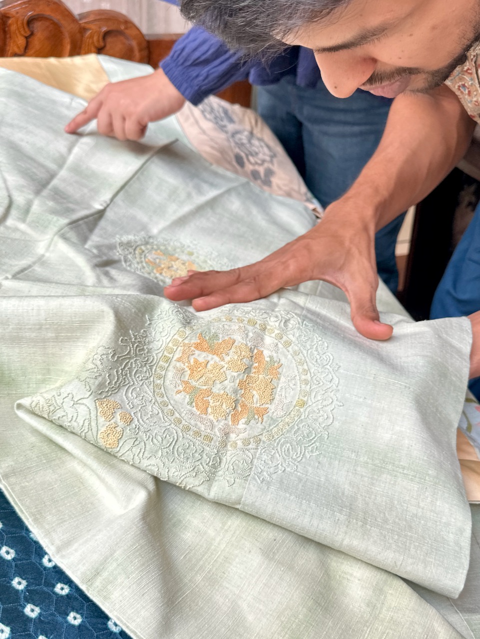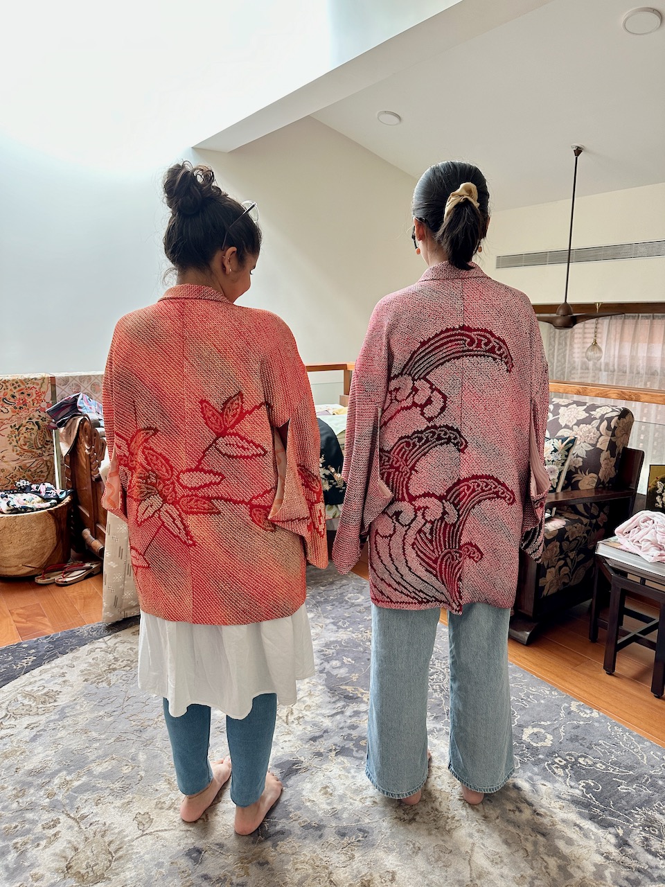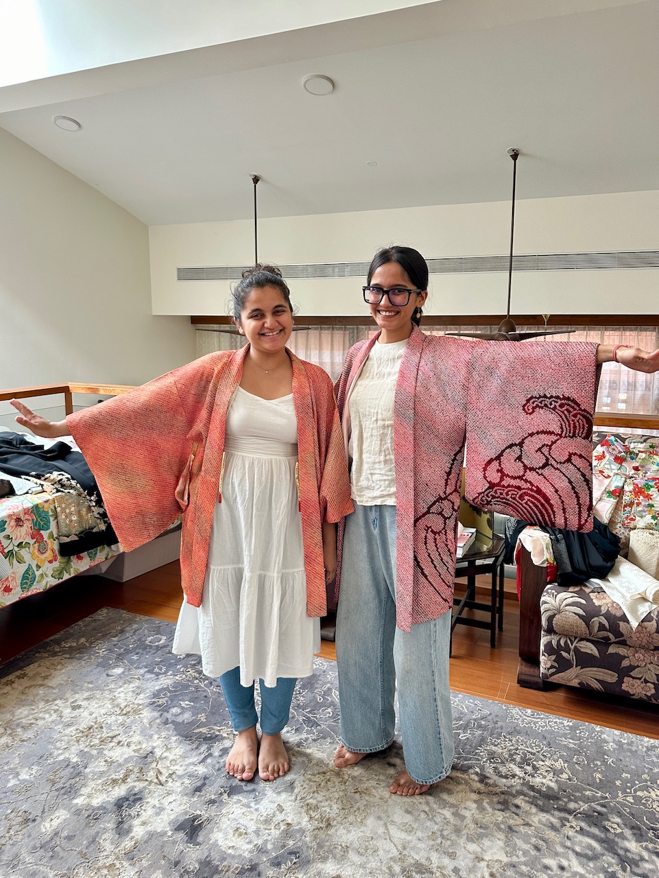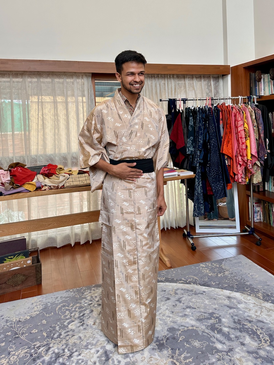 ååŸã¯ãå æ¥èšªåããThe Registry of Sareesã§åãè¥è 4åããæ¥èšªãæ¥æ¬ã®çµ£ïŒãããïŒãå®éã«èŠãããšããããšã ã£ãã®ã§æããæ¬¡ç¬¬ããã£ããã®æ©äŒãªã®ã§ãæ¥æ¬ã®æå·¥èžã®çŸãäœéšããŠæ¬²ããã絣以å€ã®çç©ã矜ç¹ã垯ã京åçŠ ãµãªãŒãªã©ãåŒã£åŒµãåºãããã«ãœãŒã4äœæºåããŠãã£ã¹ãã¬ã€ãæ°ã¥ãã°å±ç€ºäŒç¶æ ã ãè¢åž¯ã®çµã³æ¹ãééã£ãŠãããšæãããã容赊ãã