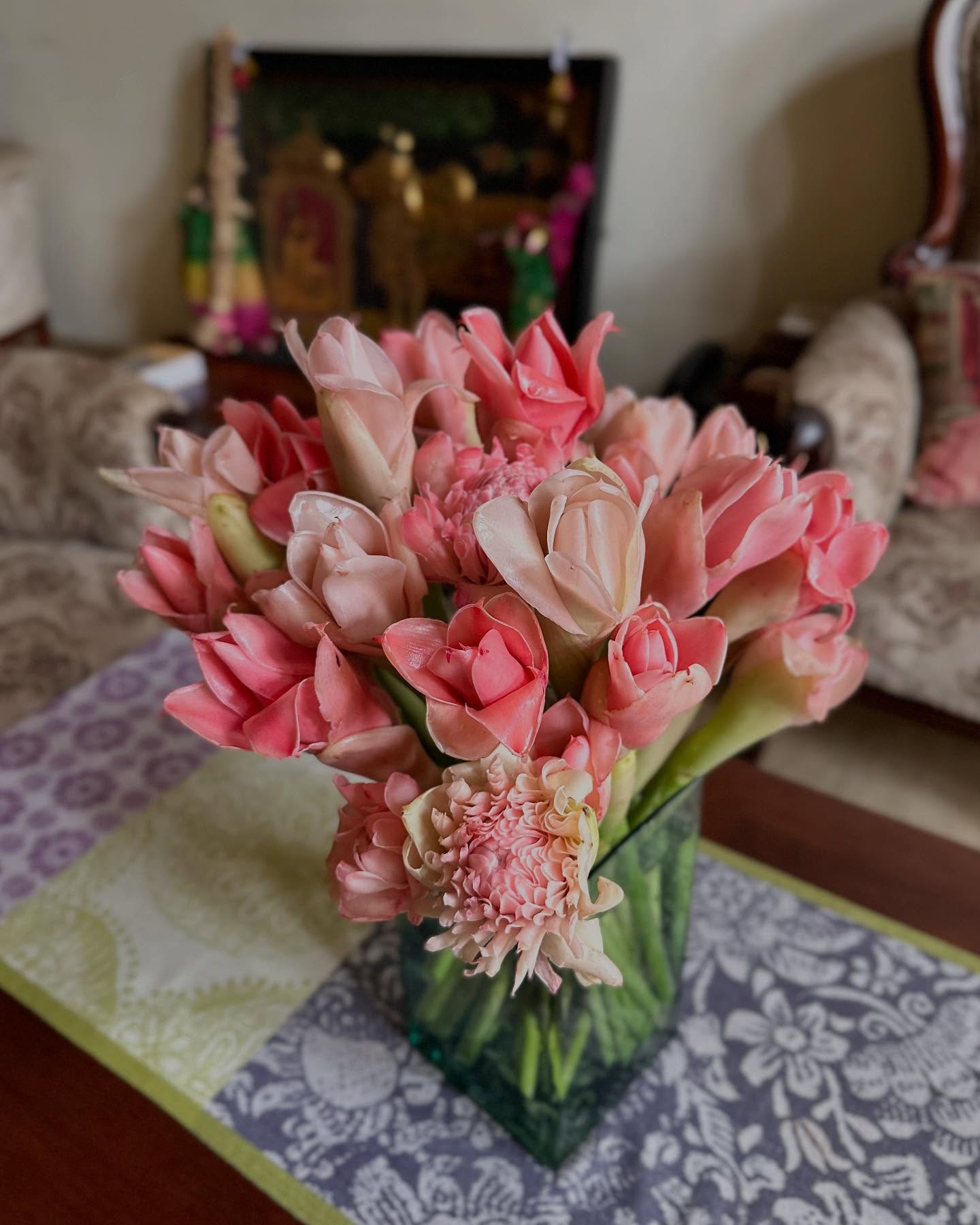 ◎インドの友達が、自分のファームに咲いていたからと送ってくれた花。トーチジンジャーというらしい。ショウガ科の花だとのこと。野菜みたいにたくましくて、しかし優しい色合いで、周囲を照らす花。こうありたいと思わせられる。