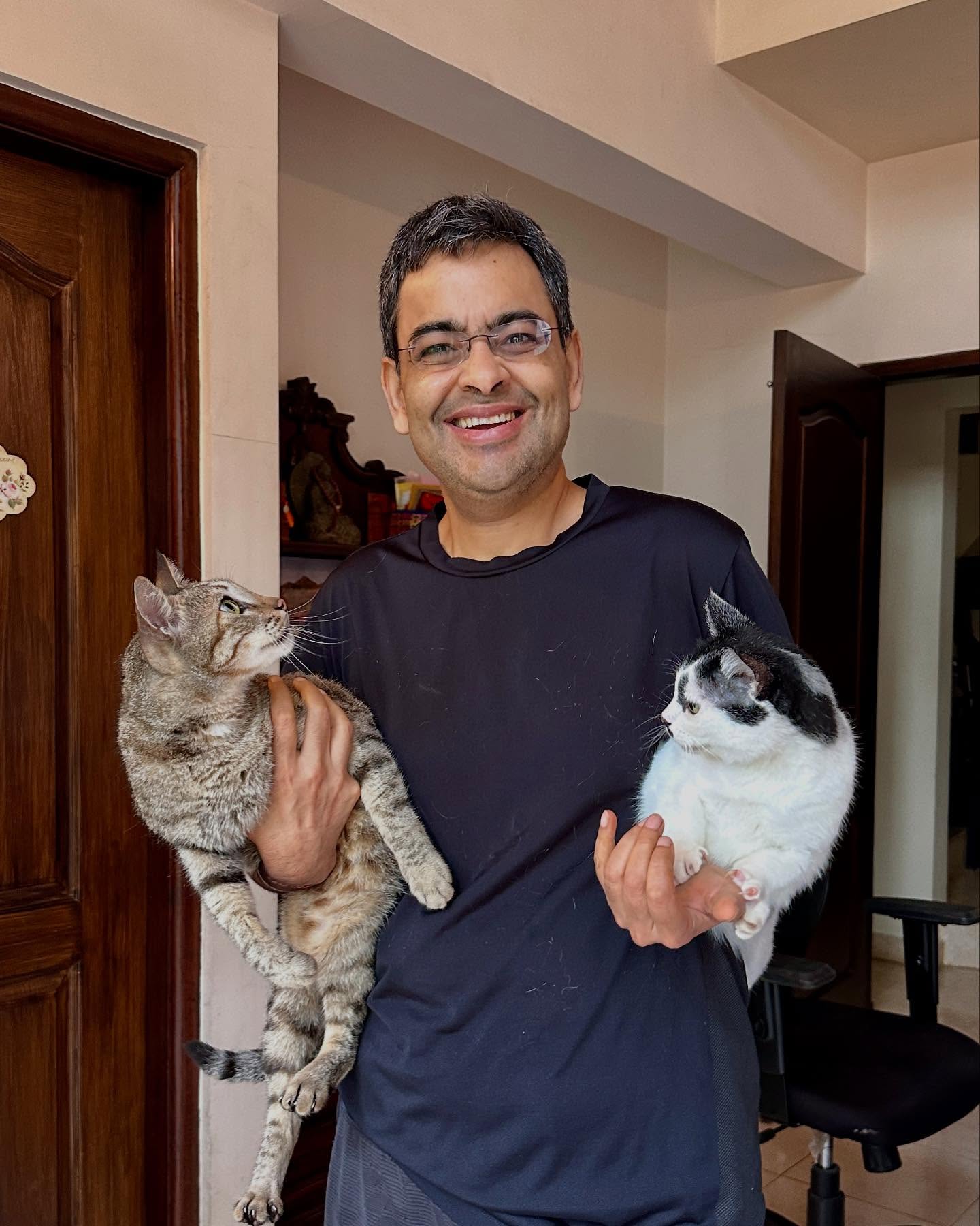 ◎猫父とNORA姉さん、ROCKY兄さん。二猫は2階の書斎で眠るのが日常なので、毎朝、猫父に抱えられて階下に降りてくる。